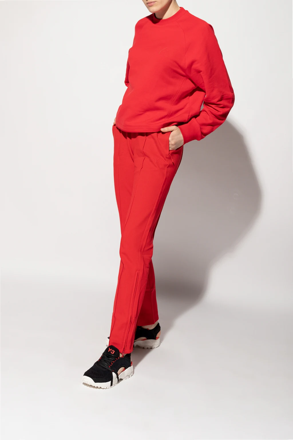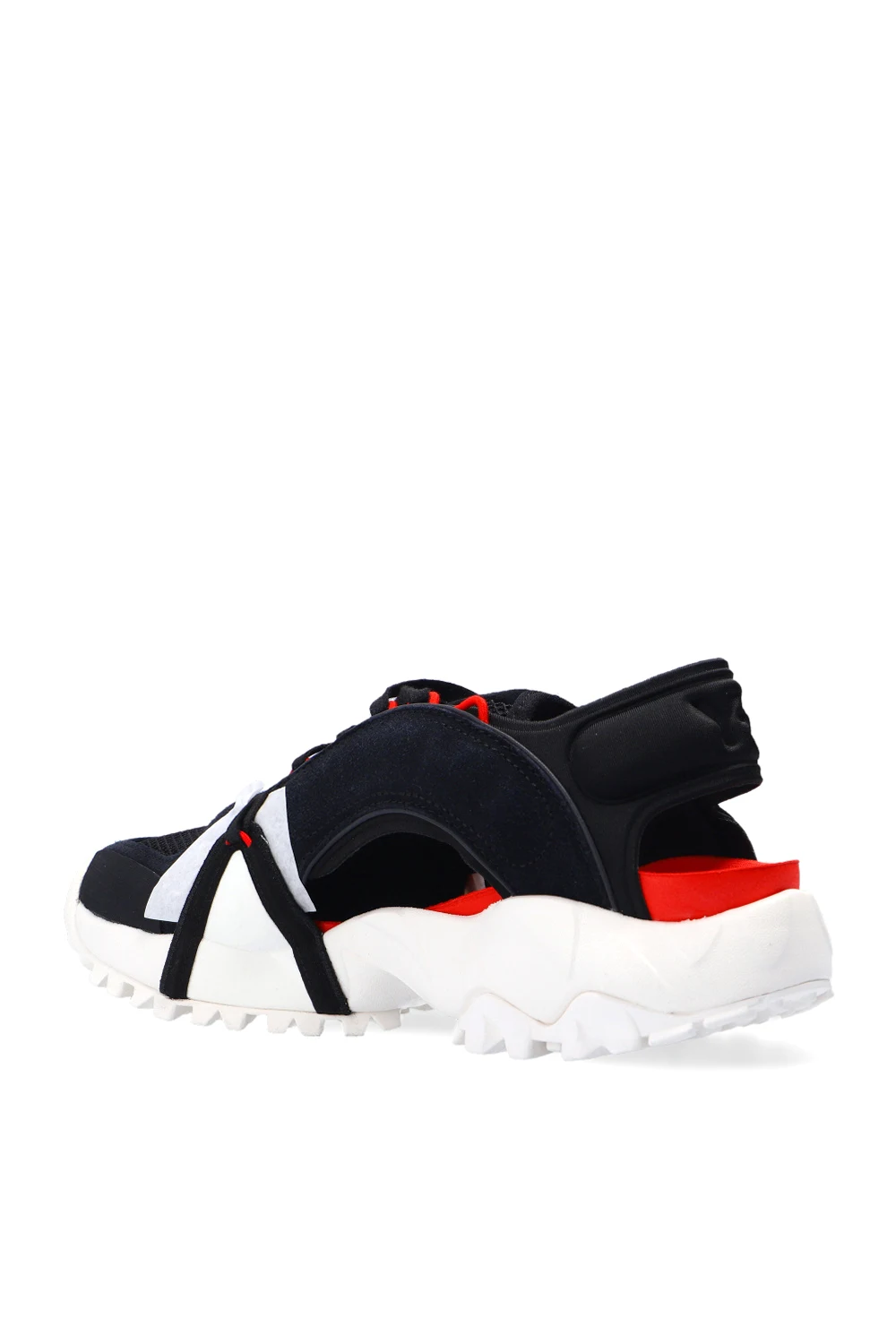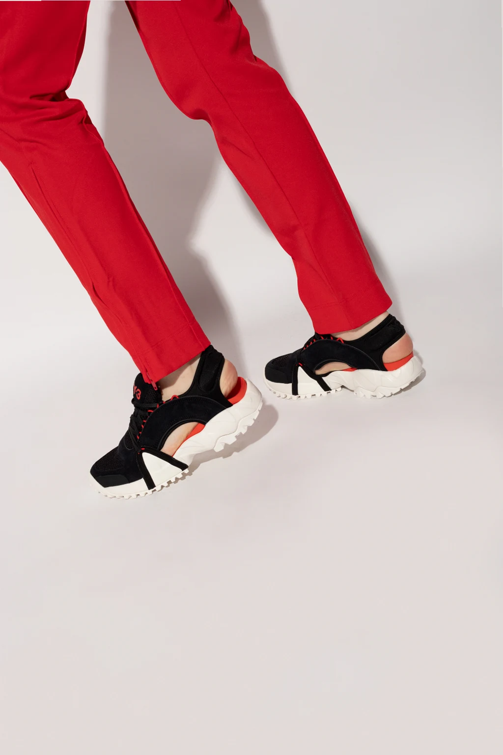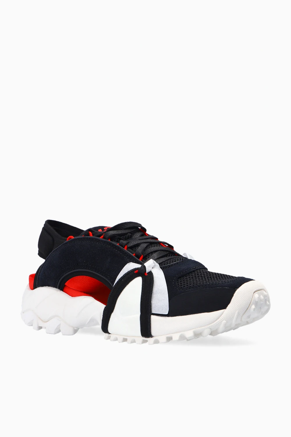 Czarne, sznurowane buty sportowe z odkrytą piętą, model ‘Notoma’ Y-3 Yohji Yamamoto. Wykończone zamszem oraz siatką. Na języku nadrukowane logo w kolorze czerwonym. Kremowa, gumowa podeszwa.
