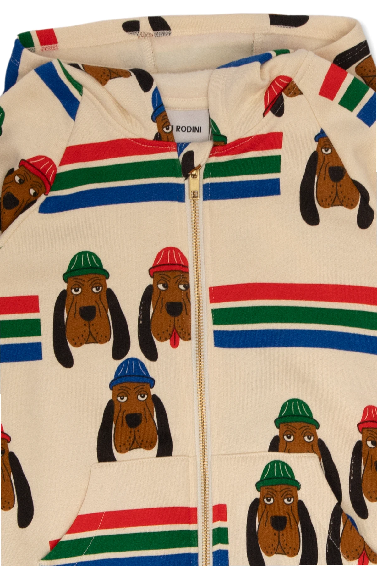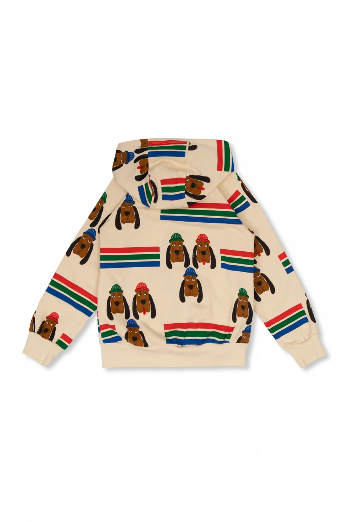 Kremowa bluza z kapturem Mini Rodini. Wykonana z bawełny organicznej z certyfikatem GOTS. Zapinana na zamek. Ozdobiona kolorowym wzorem w paski i motyw piesków. Dwie wsuwane kieszenie. Długie rękawy oraz dół wykończone ściągaczem.