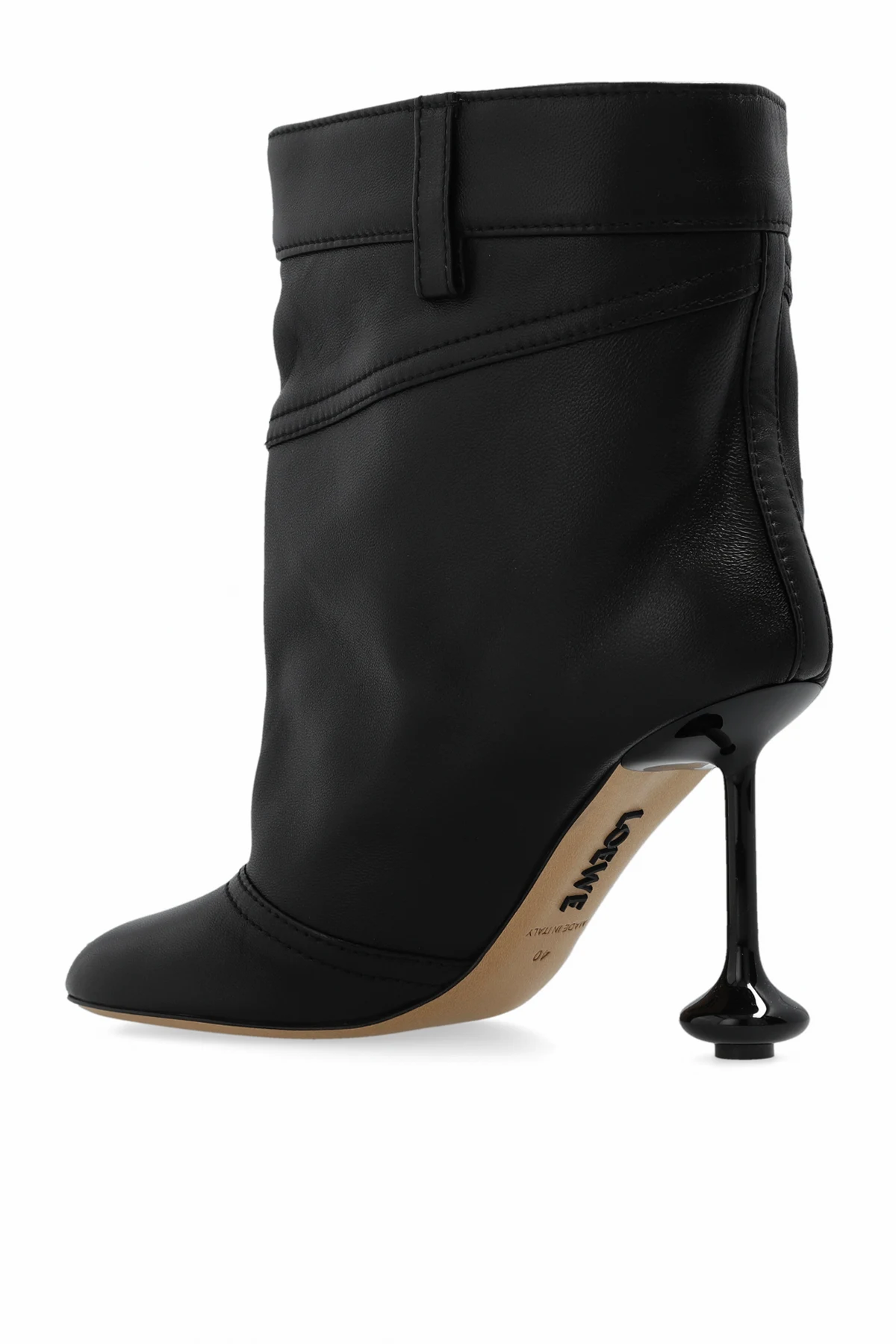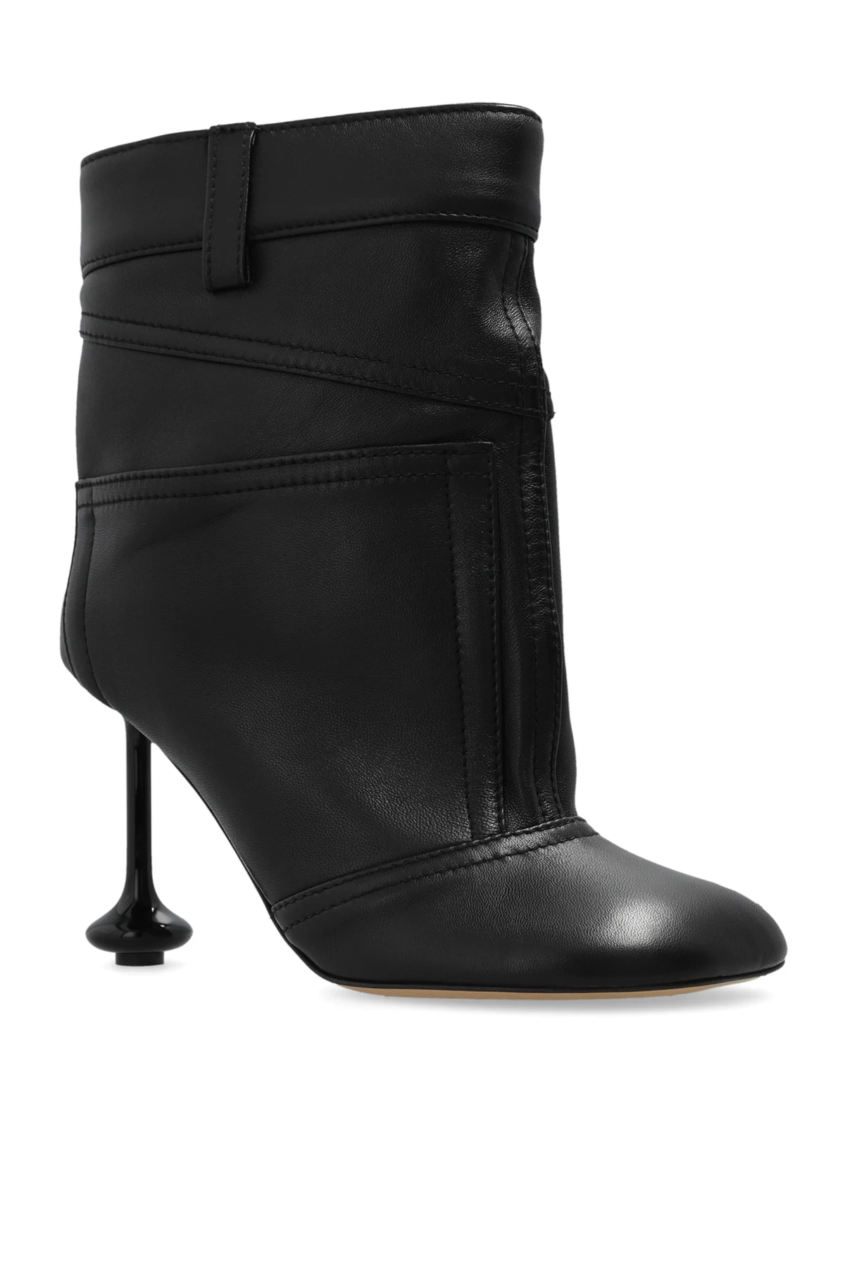 Czarne, wsuwane botki na obcasie, model ‘Toy’ Loewe. Wykonane z jagnięcej skóry. Dekoracyjne przeszycia. Z boku wsuwana kieszeń. Dekoracyjny obcas. Jasnobeżowa, skórzana podeszwa.