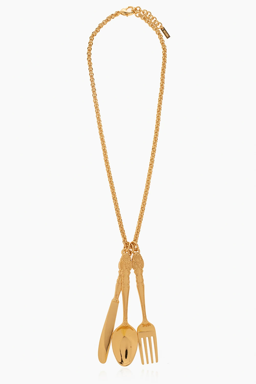 Naszyjnik z masywnymi zawieszkami w kolorze złotym Moschino. Wykończony mosiądzem. Zapinany na karabińczyk. Z przodu trzy zawieszki w kształcie sztućców.