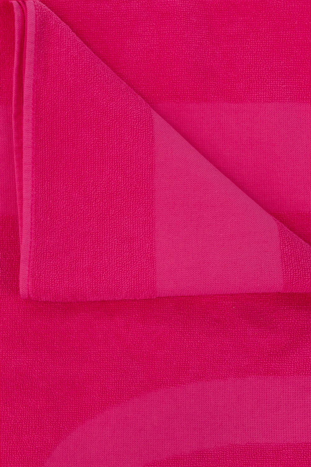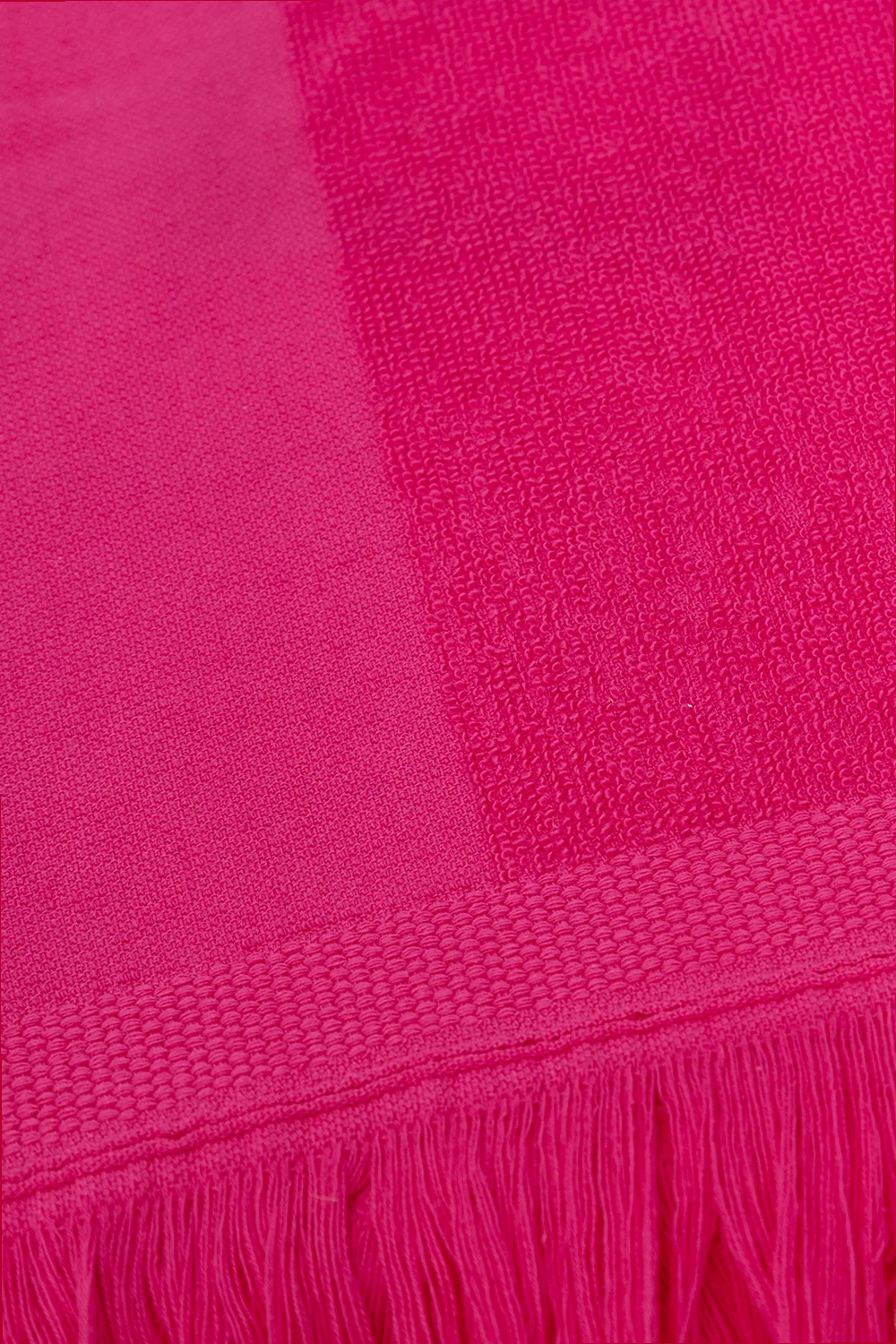 Różowy, bawełniany ręcznik kąpielowy Eres. Ozdobiony wyszytym logo. Dwa brzegi zakończone frędzlami.