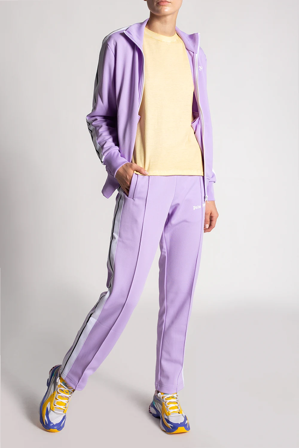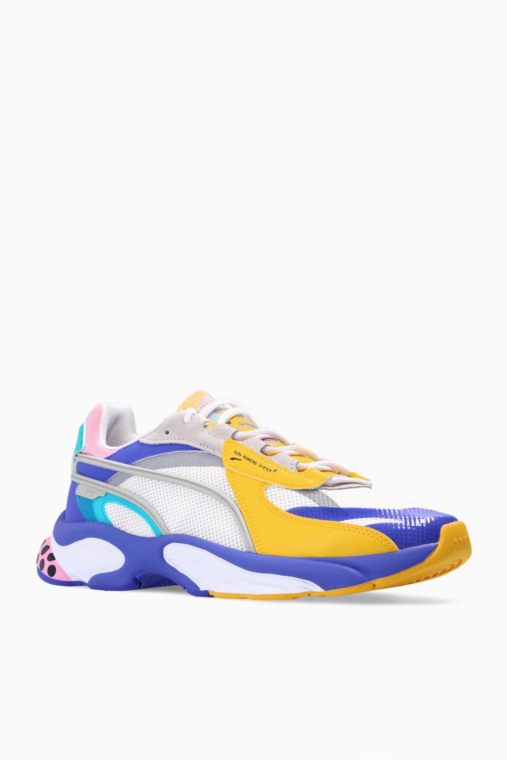 Biało-żółto-fioletowe, sznurowane buty sportowe, model ‘RS-Connected’ Puma x Aka Boku. Wykończone siatką. Nadrukowane grafiki narysowane przez francuskiego grafika Aka Boku. Biało-fioletowo-żółta, gumowa podeszwa.