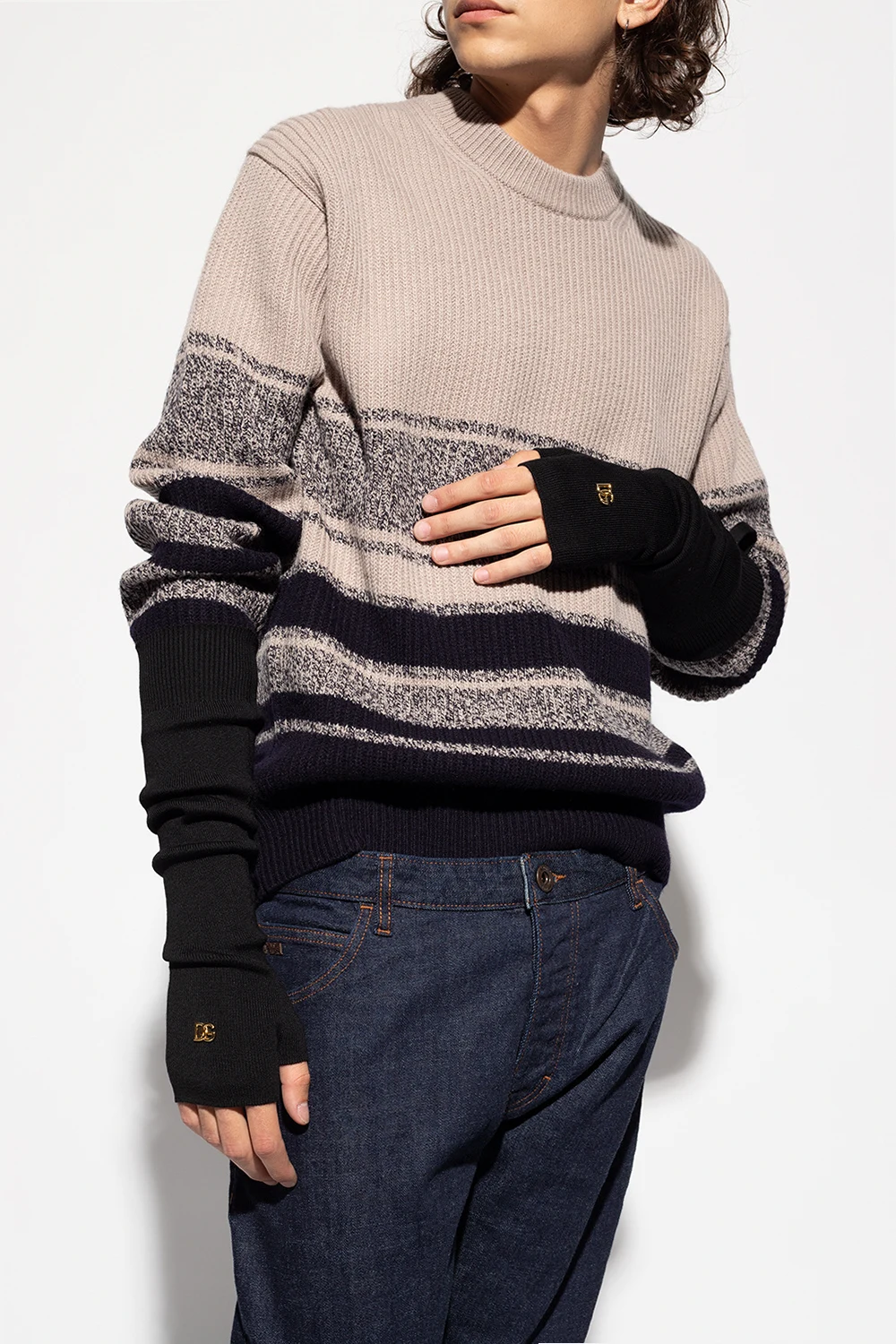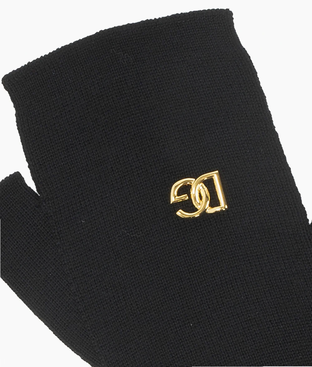 Czarne, długie rękawice bez palców Dolce & Gabbana. Wykonane z wełny. Z przodu ozdobione metalową aplikacją z logo w kolorze złotym. Wykończone ściągaczem.