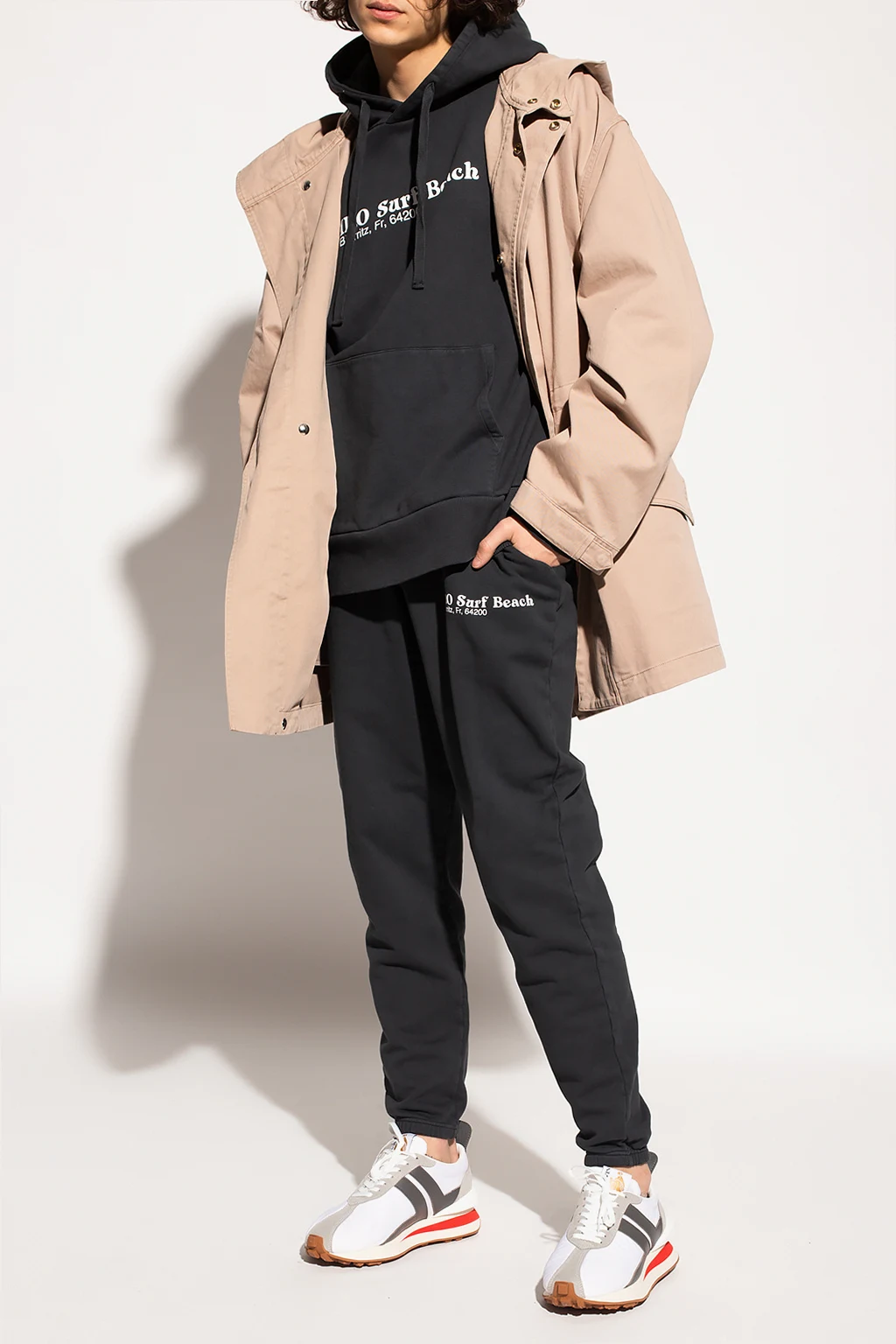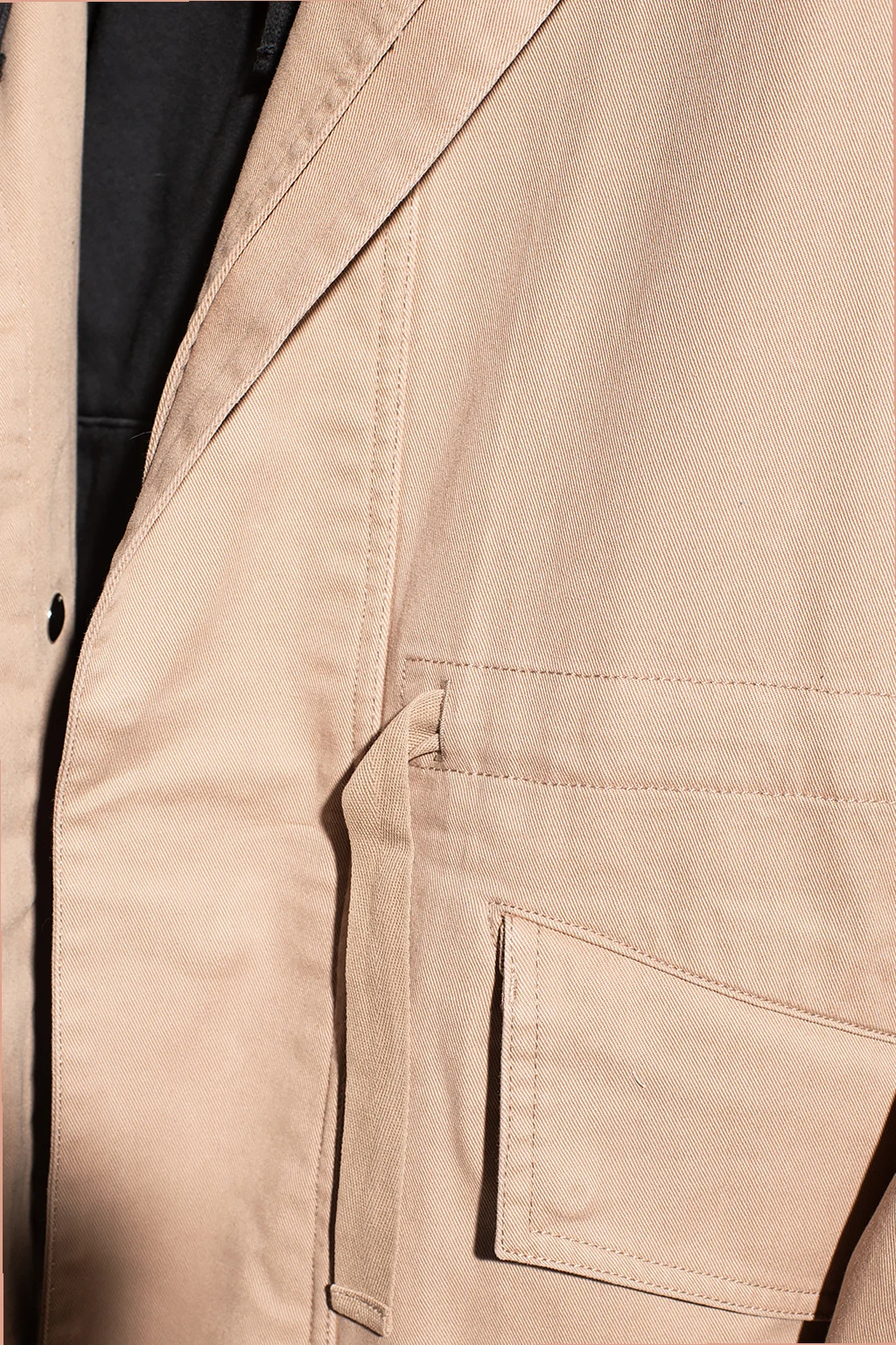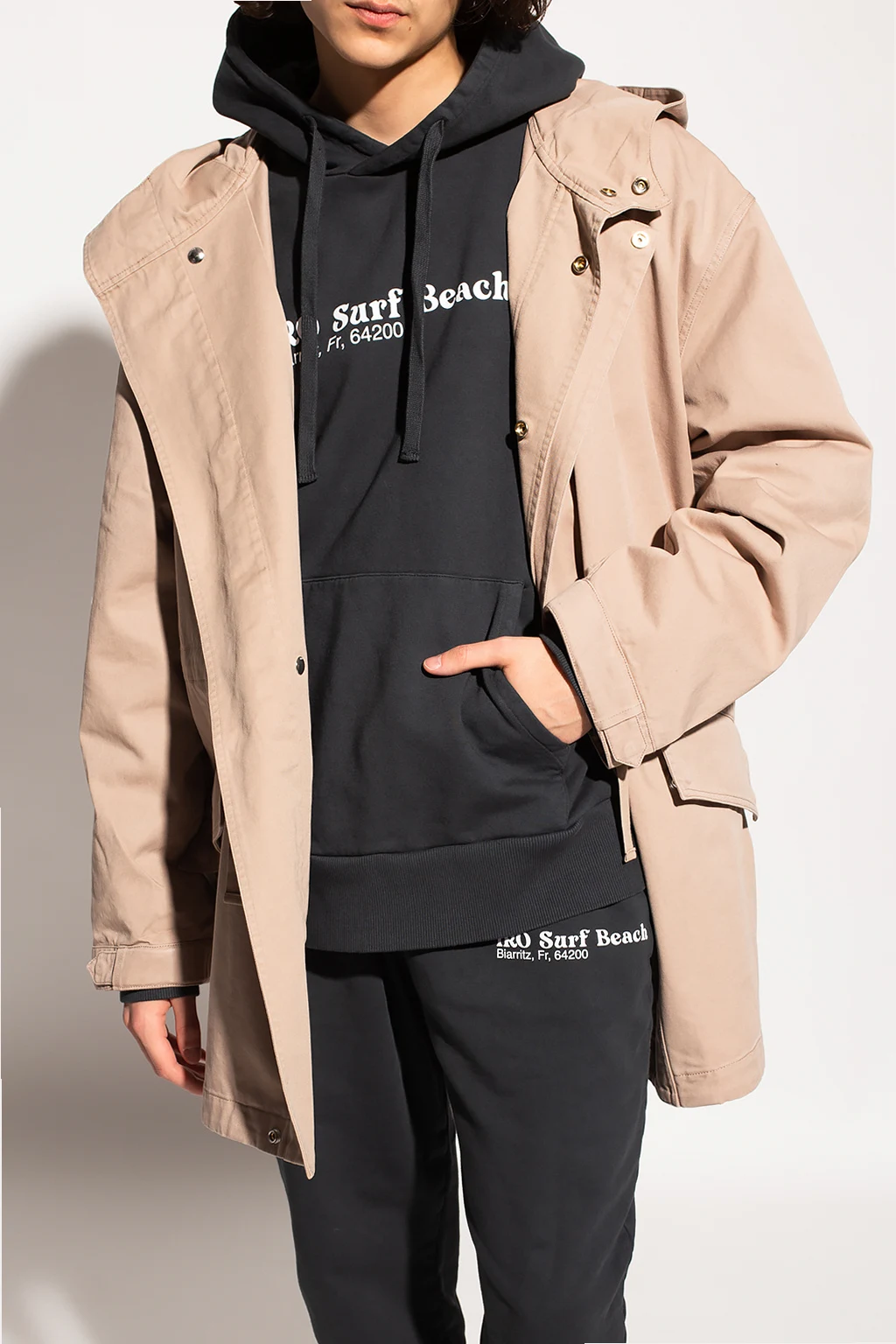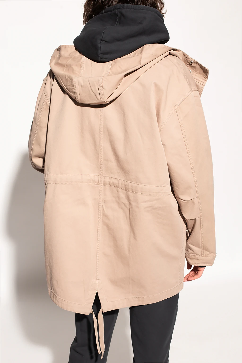 Beżowa, bawełniana parka z kapturem Iro. Zapinana na zatrzaski z krytą plisą. W pasie i na dole ściągana trokami. Z przodu dwie kieszenie z patką zapinane na zatrzask. Długie rękawy. Z tyłu rozcięcie.