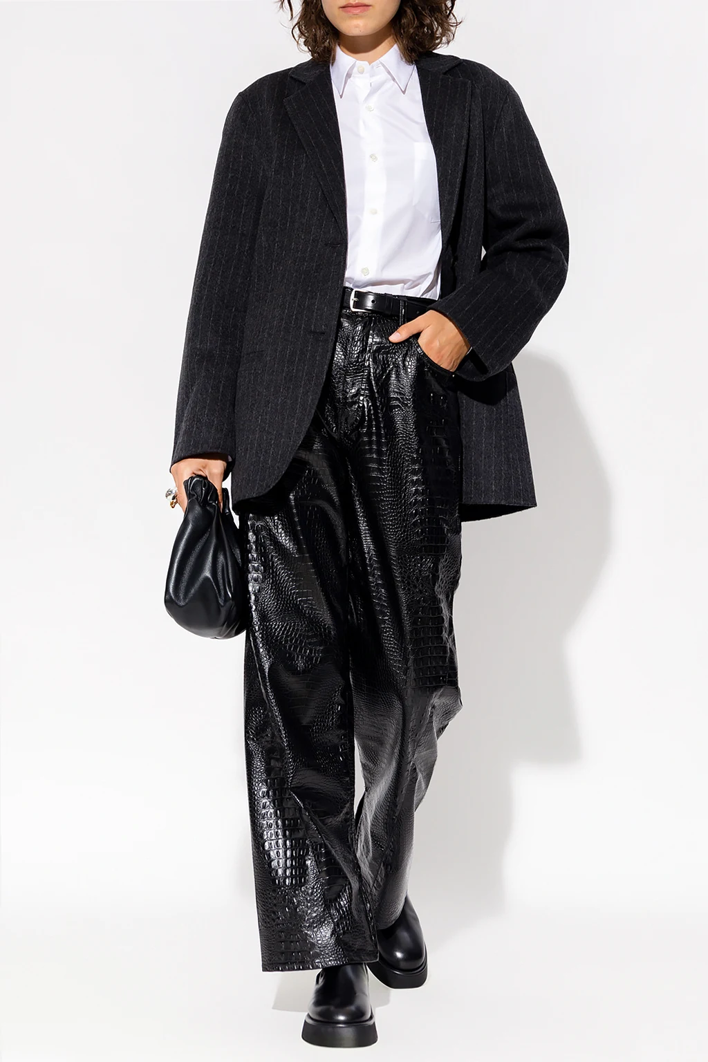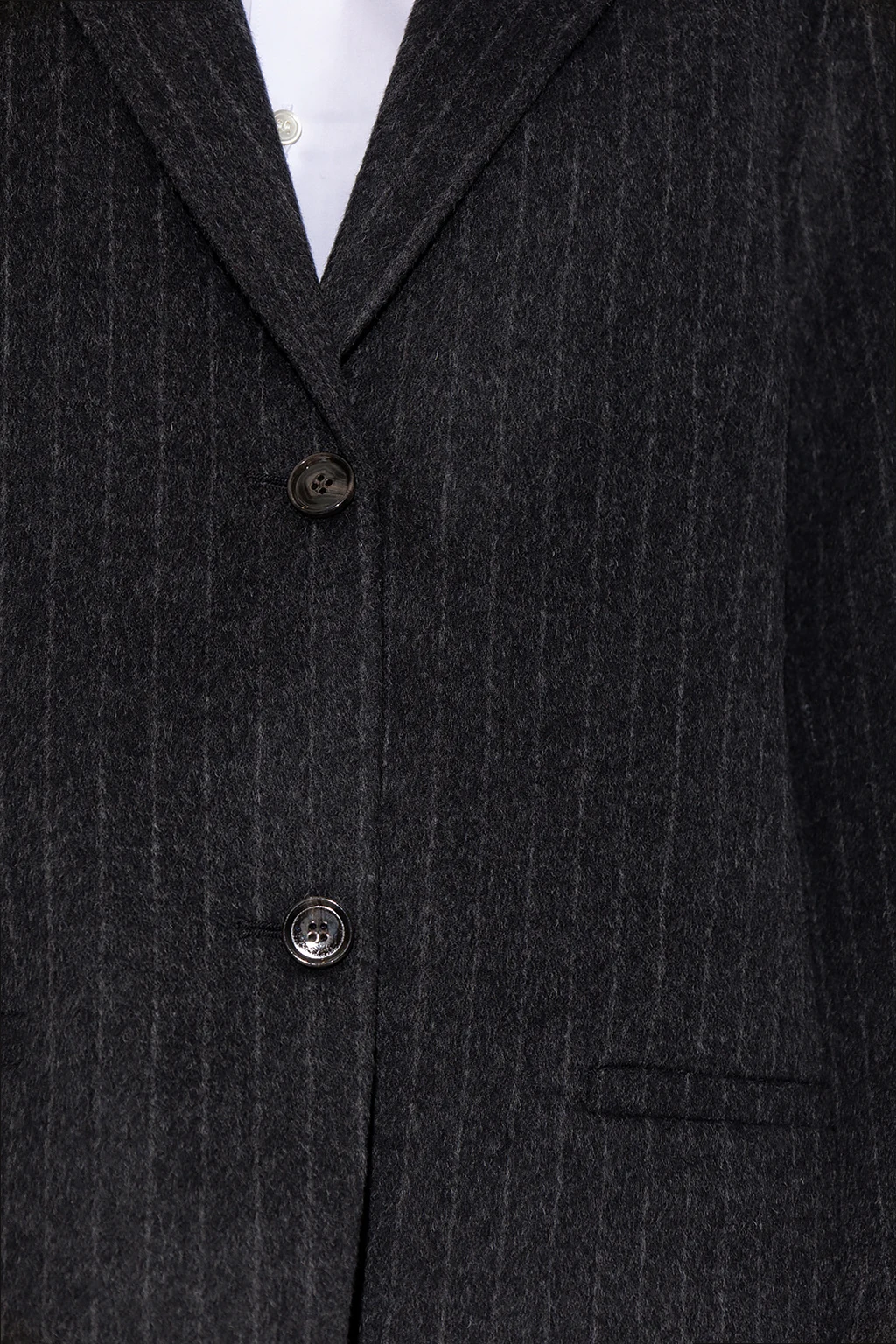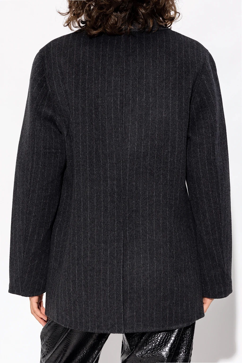 Ciemnoszara marynarka o luźnym kroju Toteme. Wykonana z wełny. Zapinana na guziki. Ozdobiona wzorem w prążki. Dwie wsuwane kieszenie. Z tyłu pojedyncze rozcięcie. Otwarte klapy. Długie rękawy.