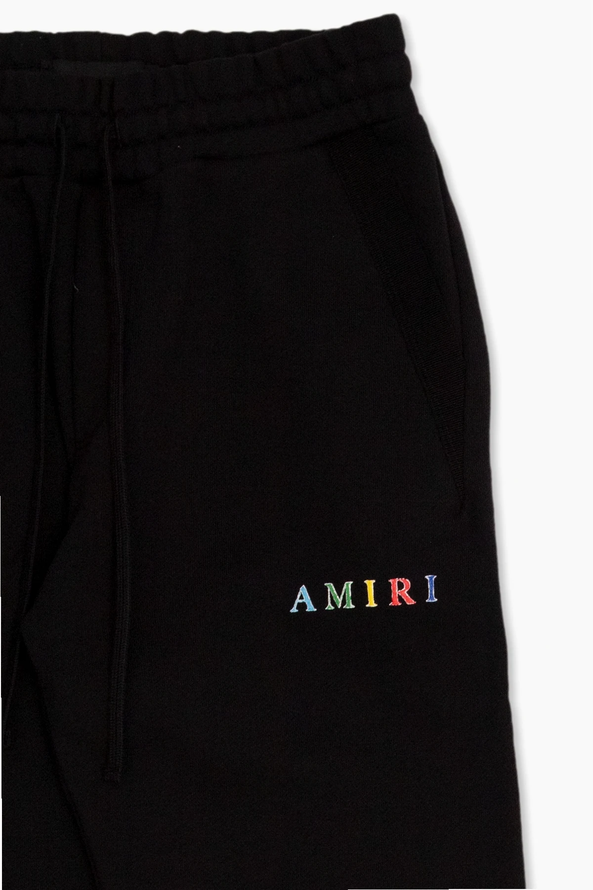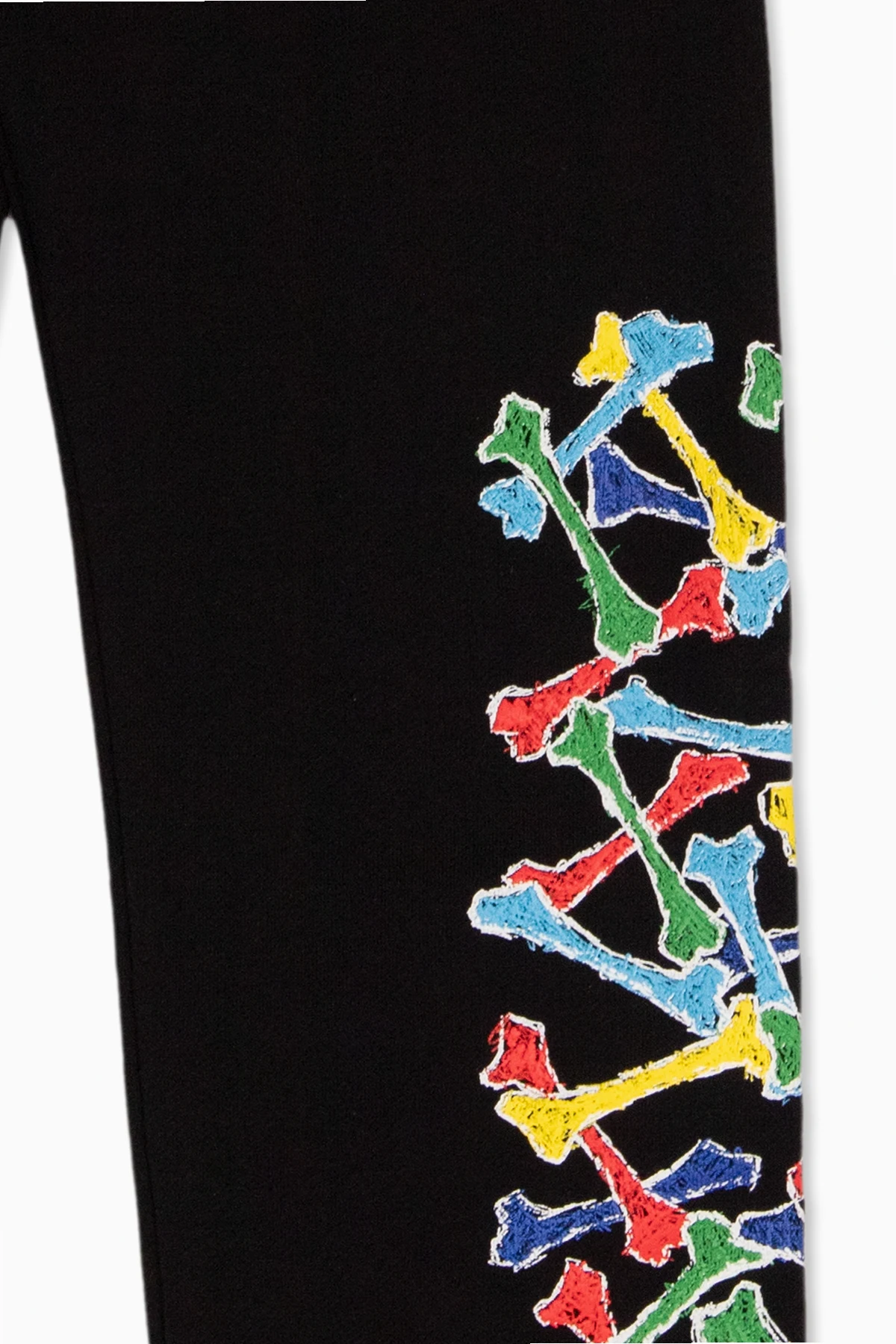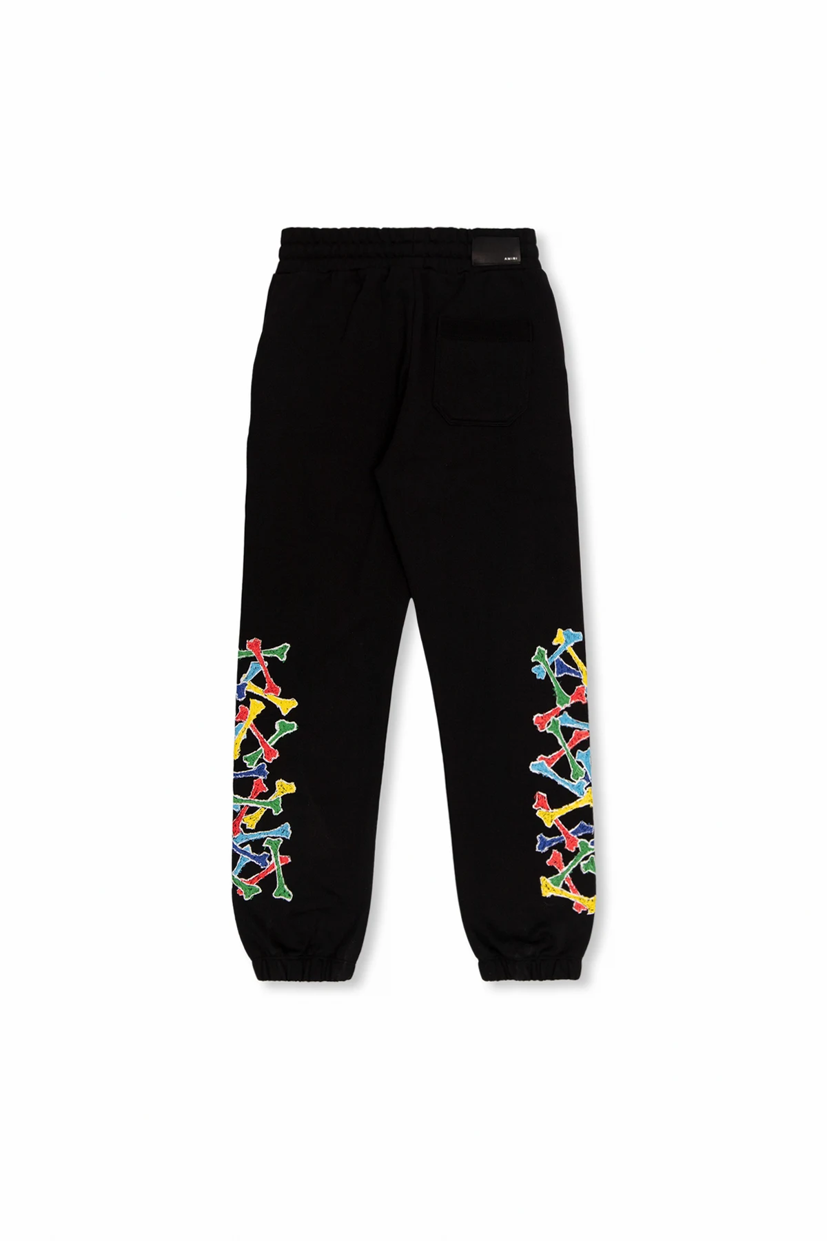 Czarne spodnie dresowe Amiri Kids. Wykonane z bawełny. W pasie wszyta guma ściągana trokami. Ozdobione kolorowym wzorem z logo i motywem kości. Trzy wsuwane kieszenie. Długie nogawki zakończone ściągaczem.