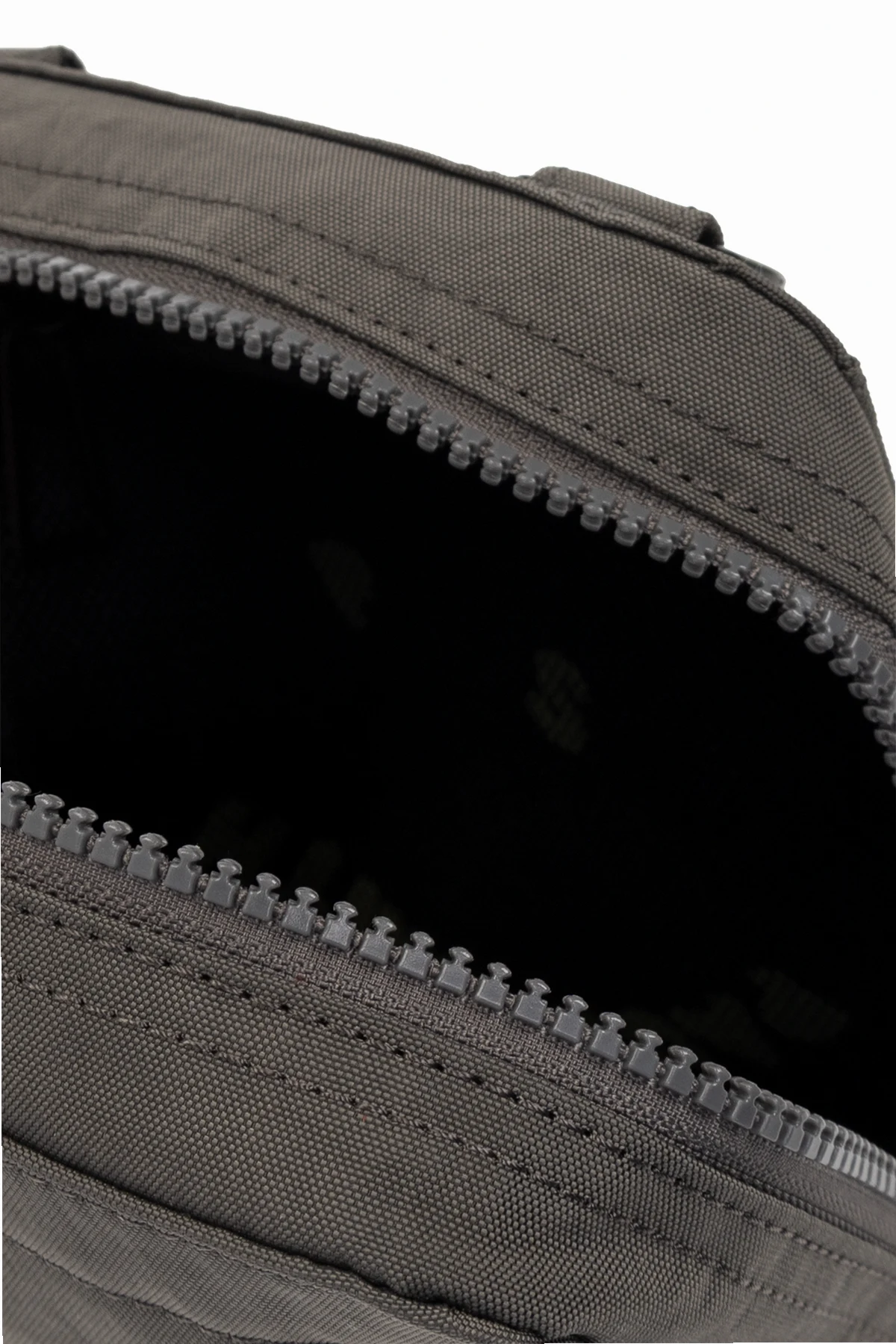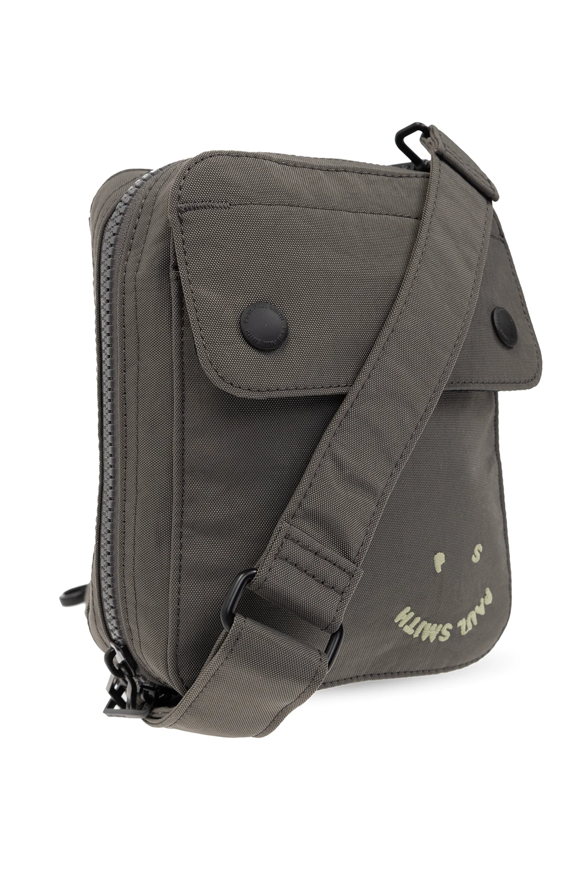 Szara torba na ramię PS Paul Smith. Wykonana z materiału. Zamykana na dwubiegunowy zamek. Ozdobiona wyszytym logo. Z przodu kieszeń z patką zapinaną na zatrzask. Odpinany, regulowany pasek. Wewnątrz komora, kieszeń zamykana na zamek i kieszeń zamykana na rzep.