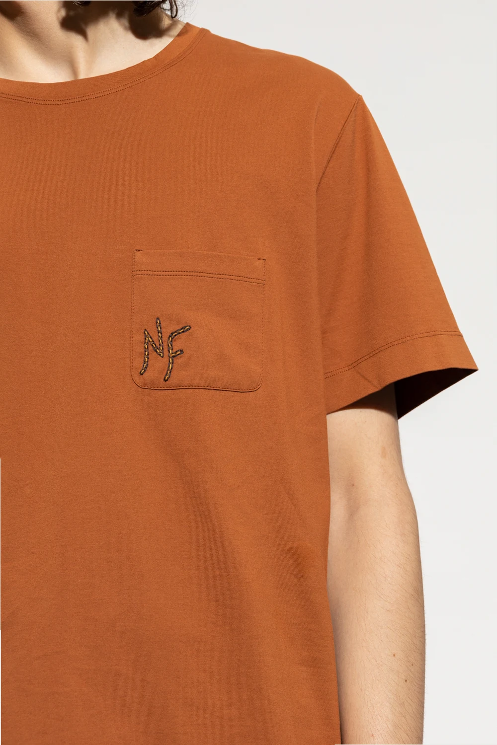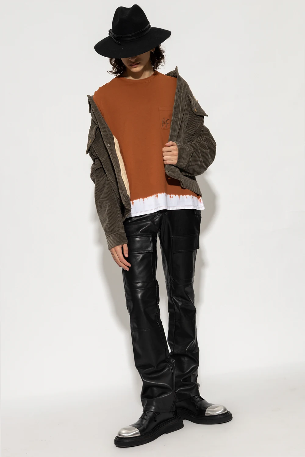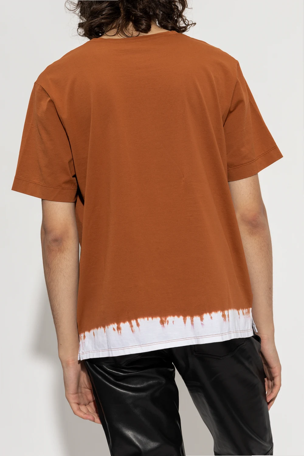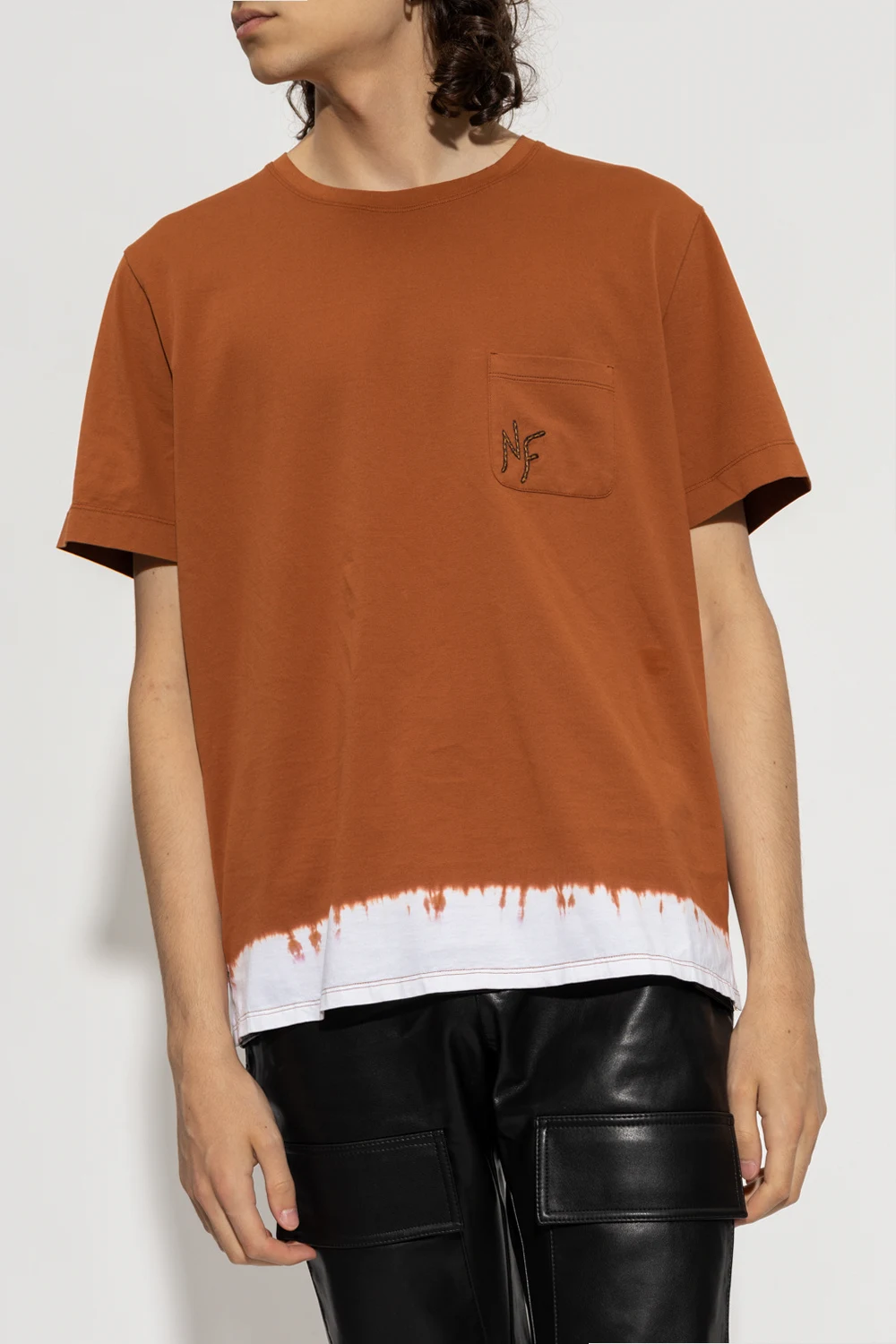 Brązowo-pomarańczowy, bawełniany t-shirt Nick Fouquet. Na dole wykończony efektem ‘tie-dye’. Z przodu wsuwana kieszeń z wyszytym logo. Okrągły dekolt wykończony ściągaczem, krótkie rękawy.