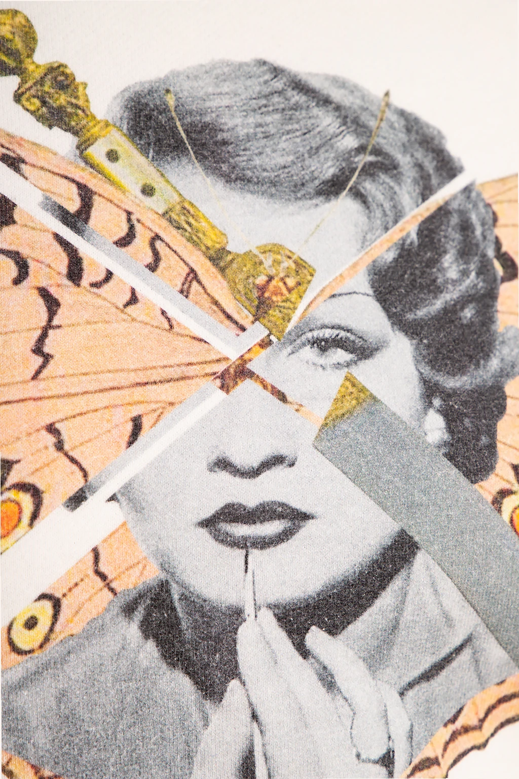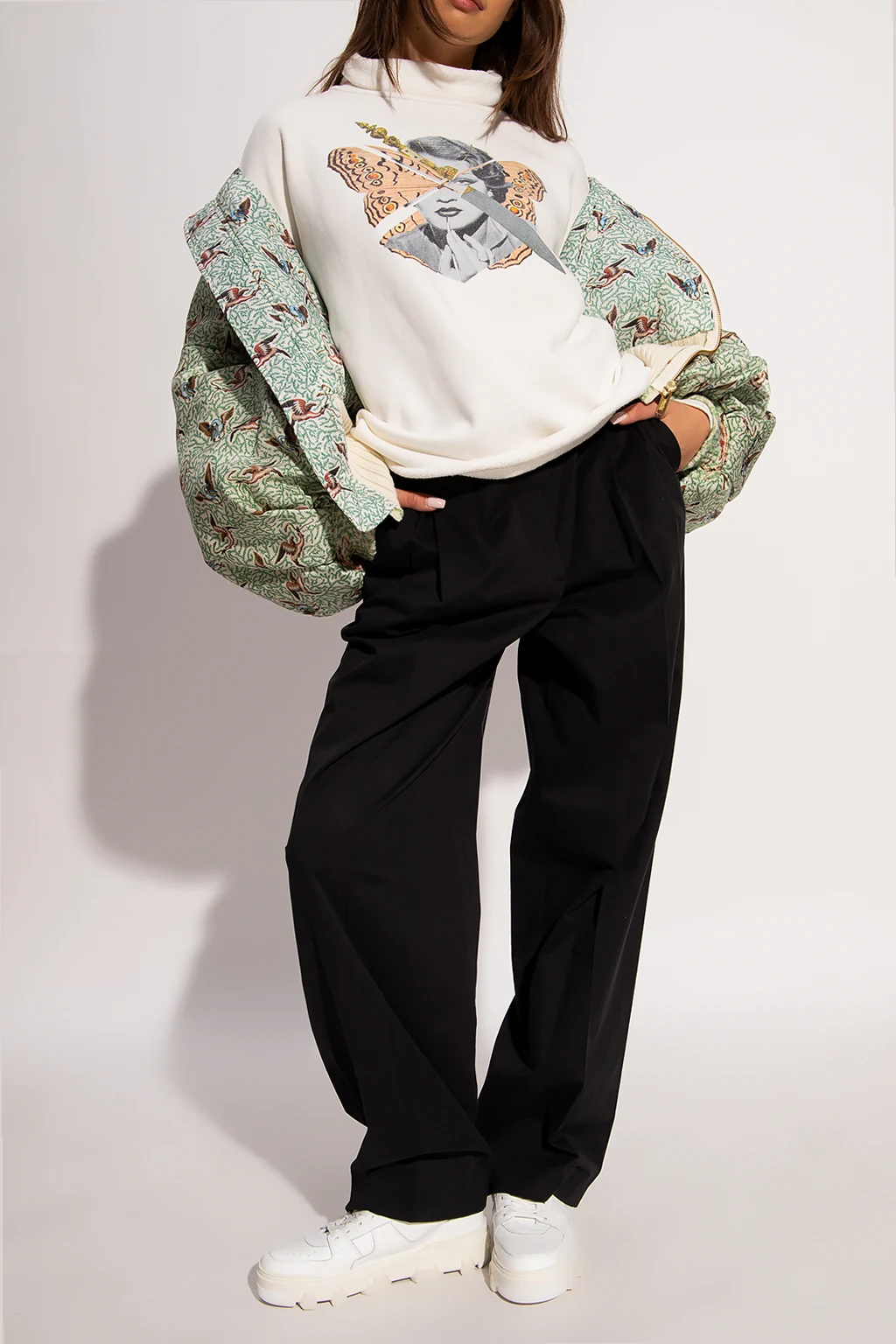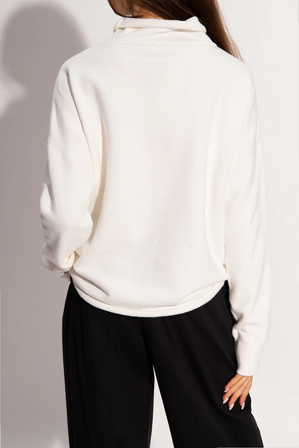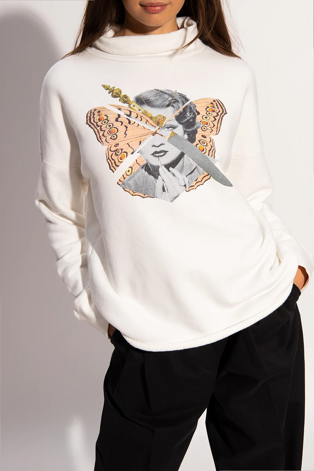 Biała, bawełniana bluza typu ze stójką Undercover. Ozdobiona kolorowym nadrukiem. Długie rękawy zakończone ściągaczami. Stójka i dół z surowym wykończeniem.