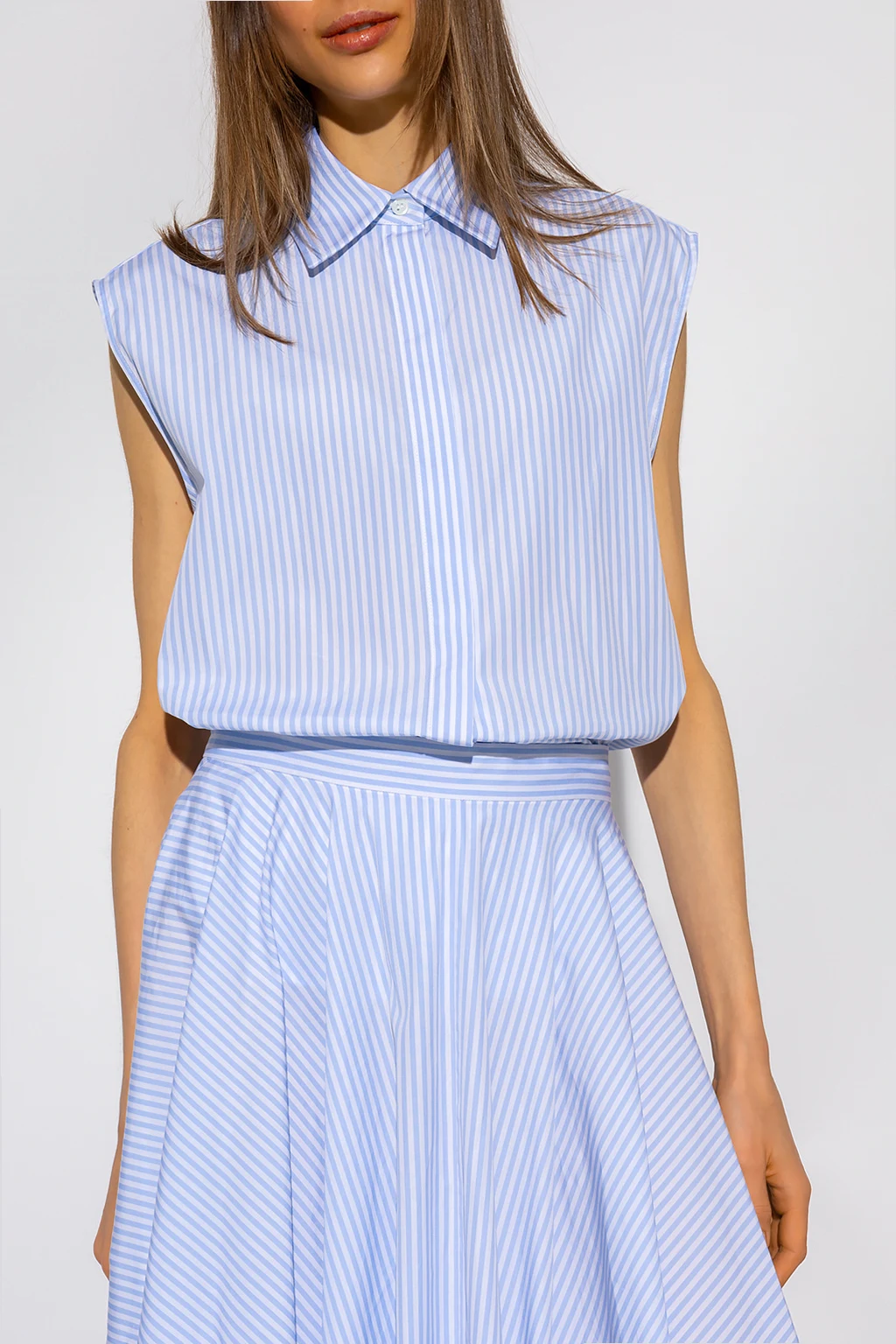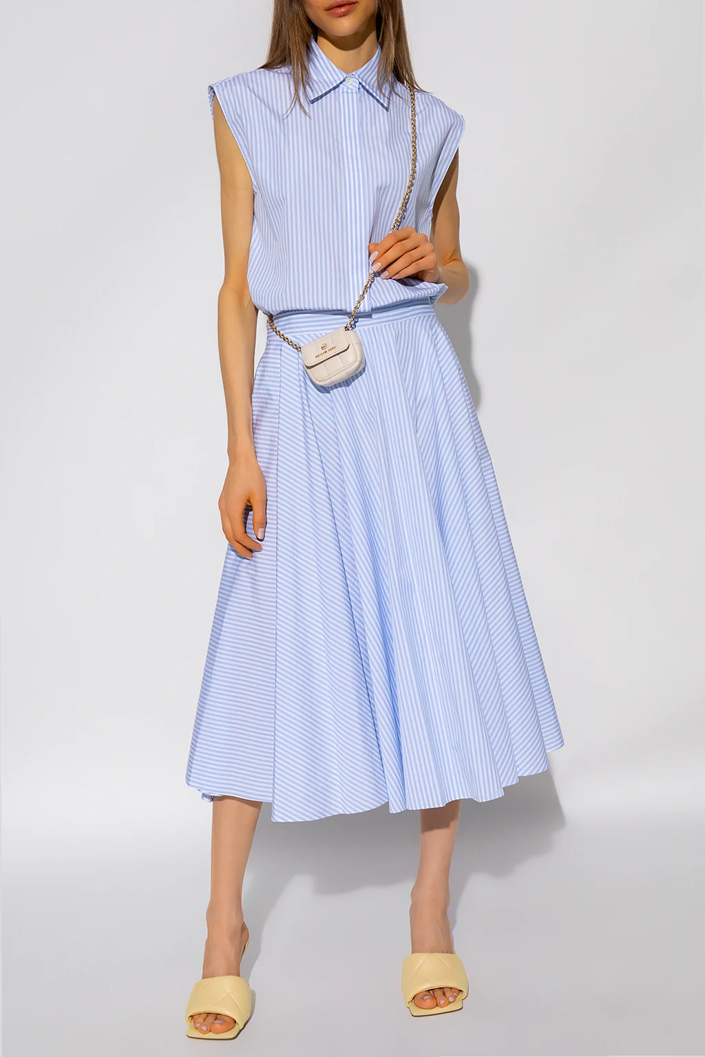 Biało-niebieski top bez rękawów Michael Kors. Wykonany z bawełny organicznej. Zapinany na guziki kryte plisą. Ozdobiony wzorem w pasy.