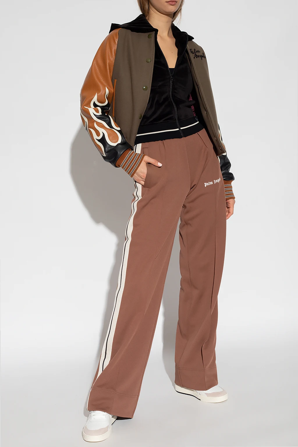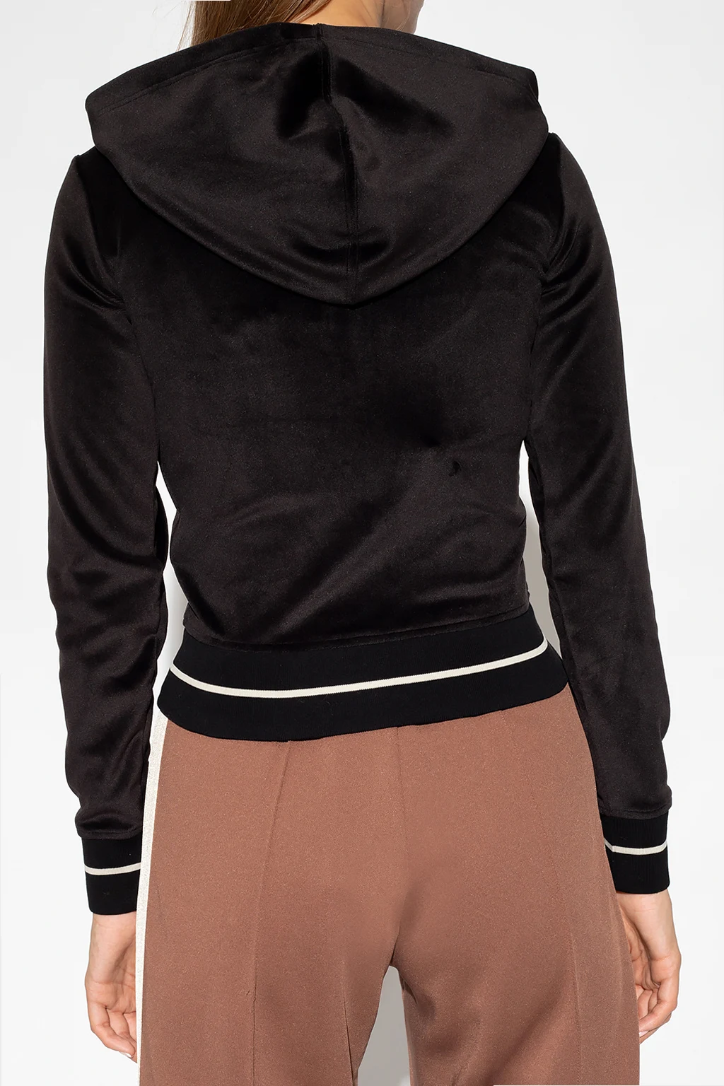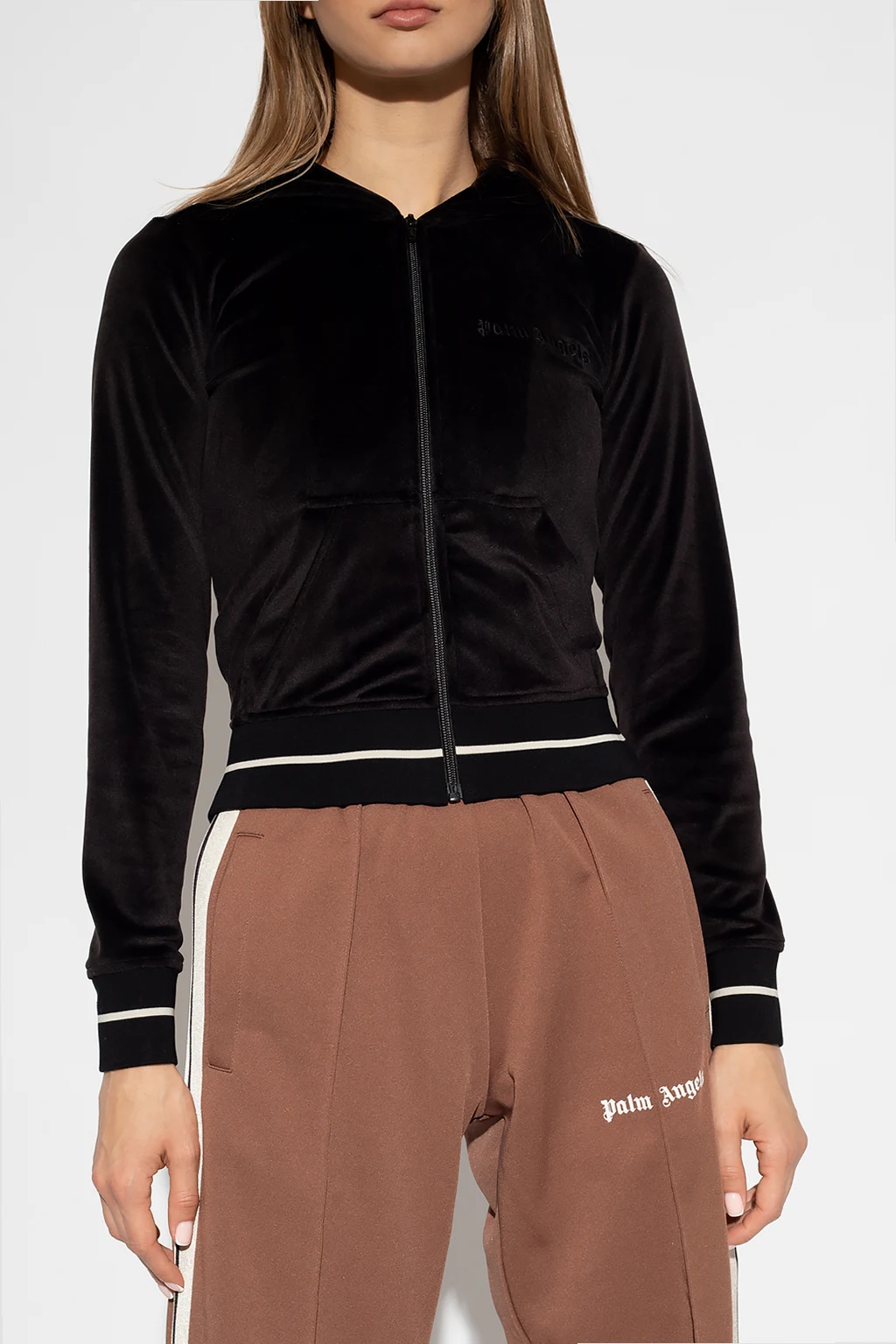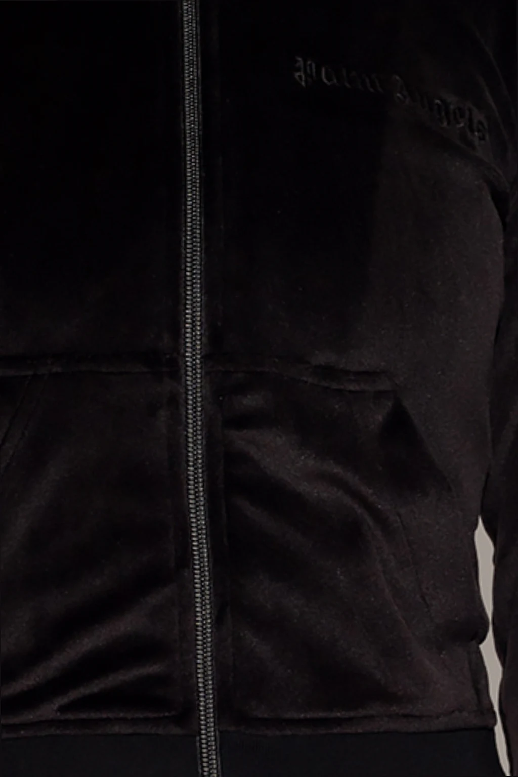 Czarna, welurowa bluza z kapturem Palm Angels. Z przodu wyszyte logo. Dwie wsuwane kieszenie. Długie rękawy i dół zakończone czarno-białym ściągaczem.