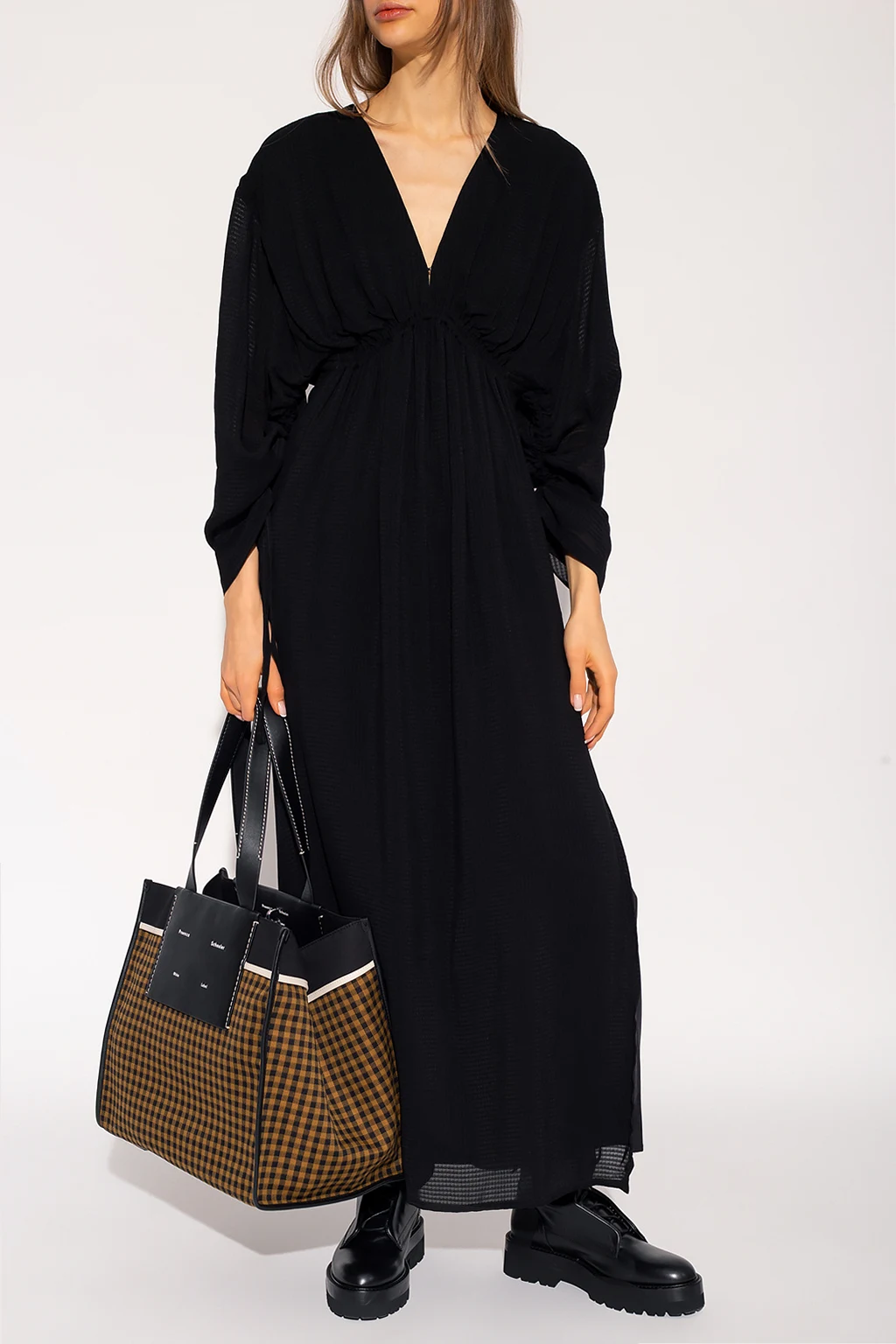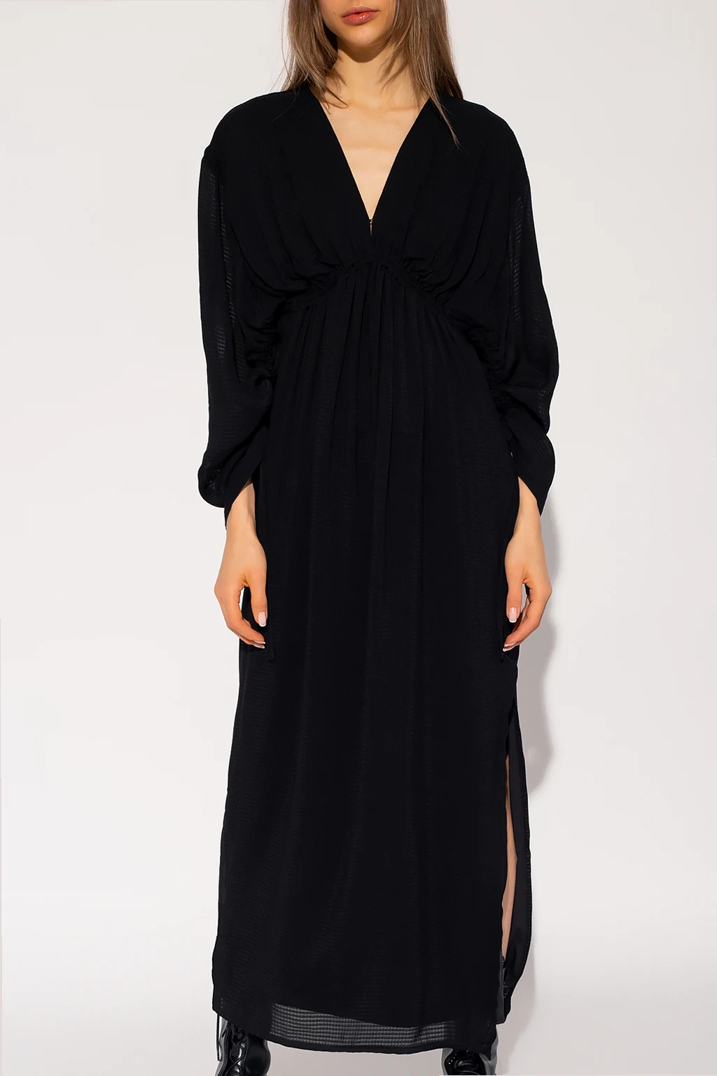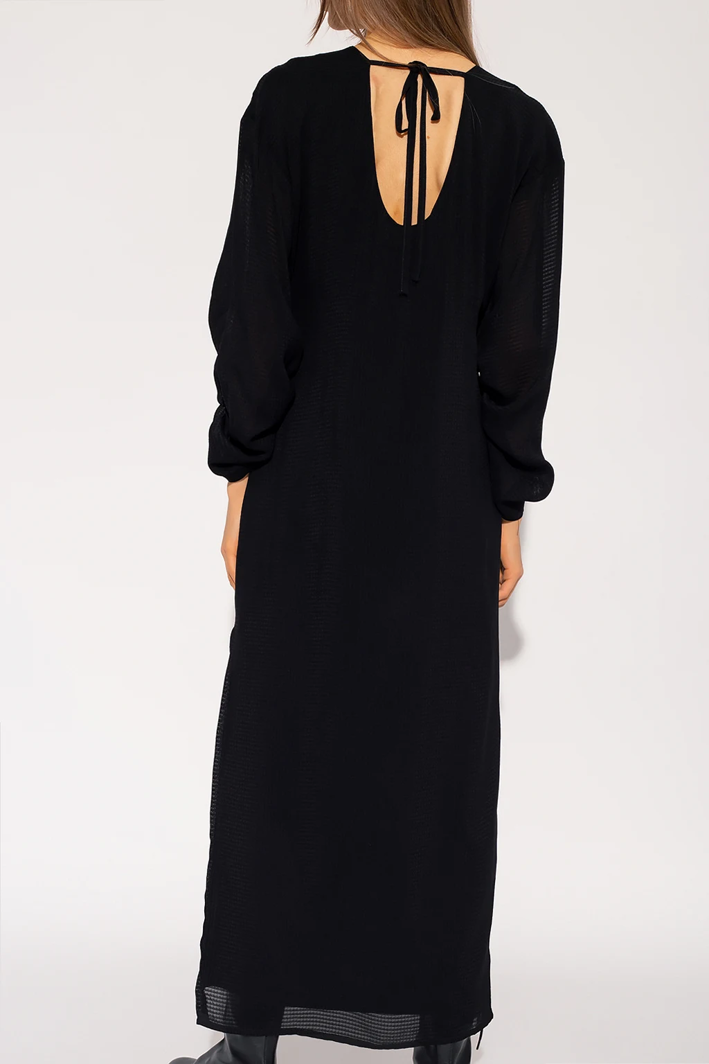 Czarna sukienka, model ‘Ryan’ Birgitte Herskind. Wykonana z wiskozy z certyfikatem FSC. Wiązana z tyłu trokami. Pod biustem wszyta elastyczna guma. Dekolt w serek zapinany na haftkę. Długie rękawy ściągane trokami. Rozszerzany dół z rozcięciem z boku.