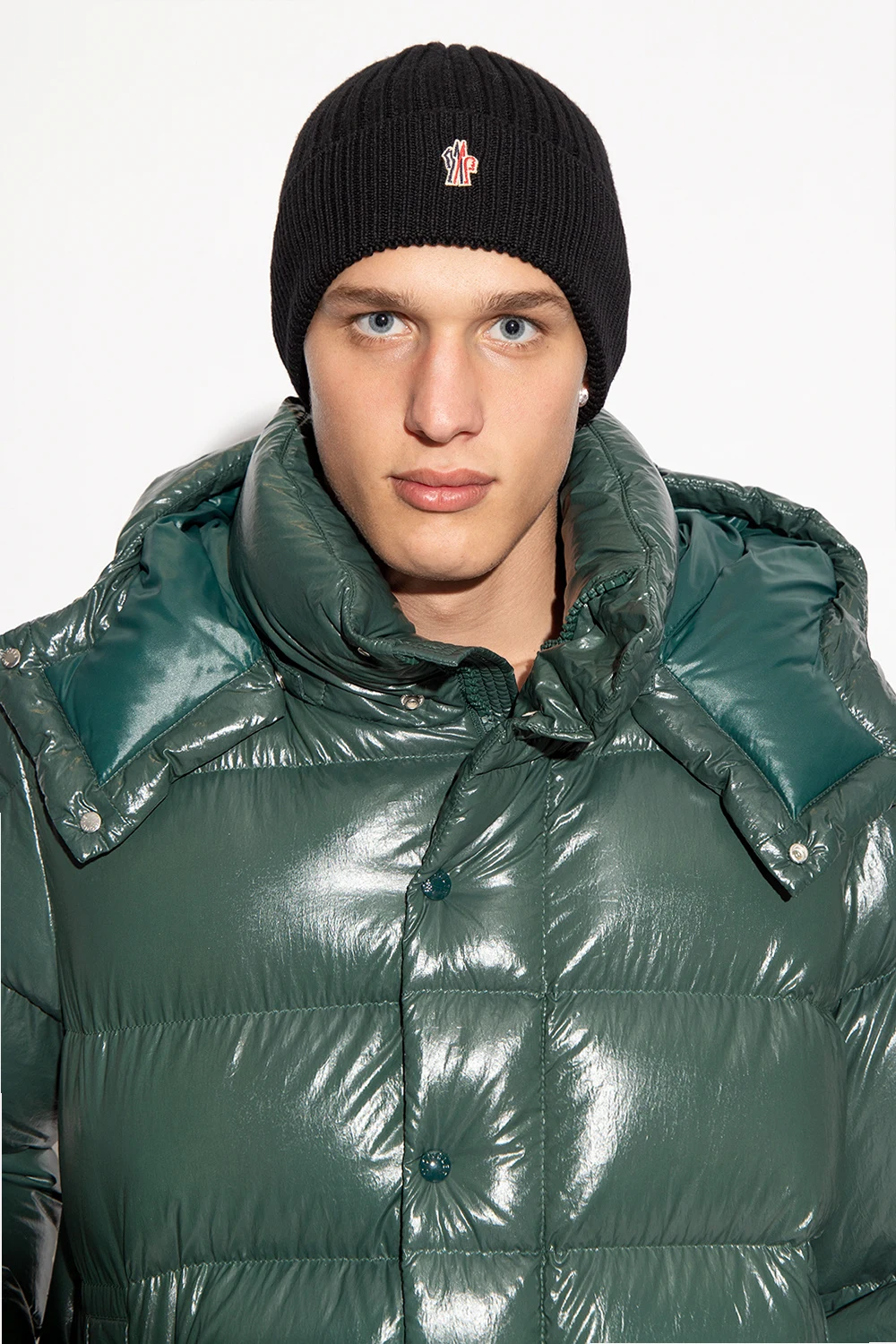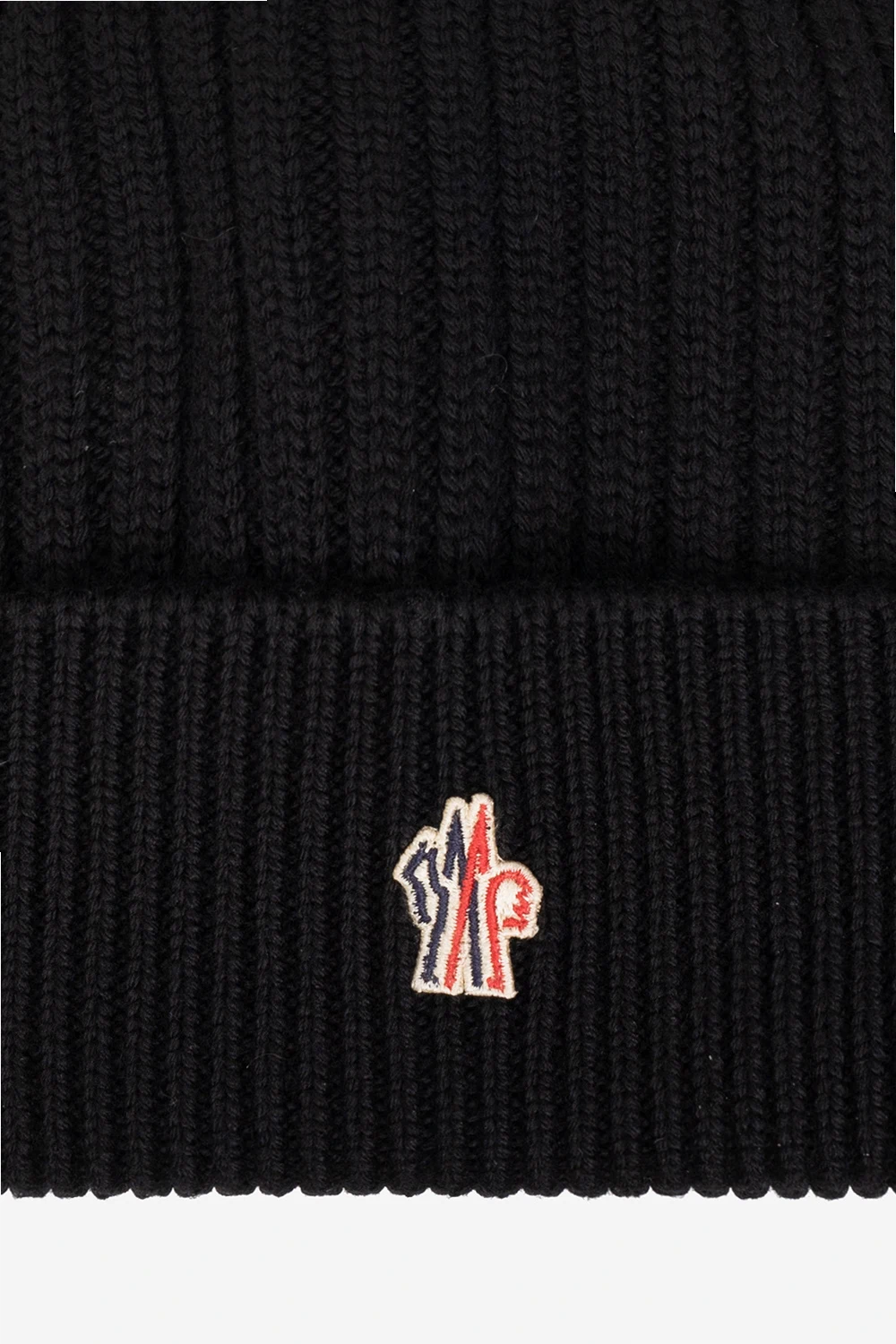 Czarna, prążkowana czapka Moncler Grenoble. Wykonana z wełny. Z przodu ozdobiona naszywką z logo. Wykończona ściągaczem.
