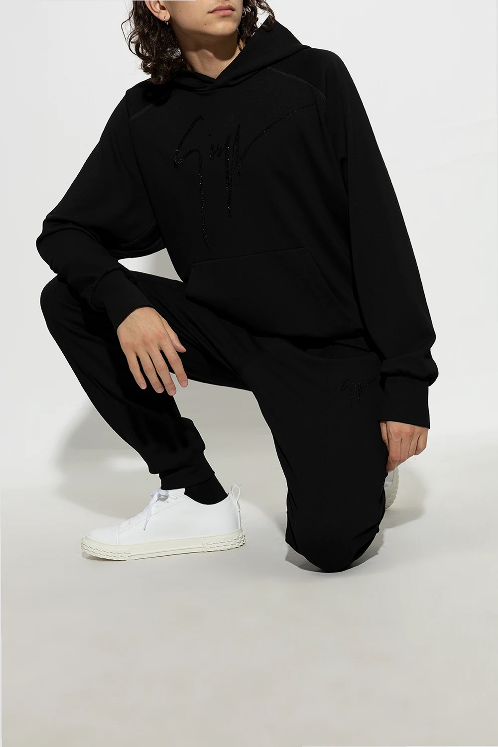 Białe, sznurowane buty sportowe, model ‘Blabber’ Giuseppe Zanotti. Wykonane z imitacji skóry, częściowo pochodzącej z recyklingu. Na języku naszywka z logo. Z tyłu krótki uchwyt. Biała, teksturowana podeszwa wykonana z gumy.