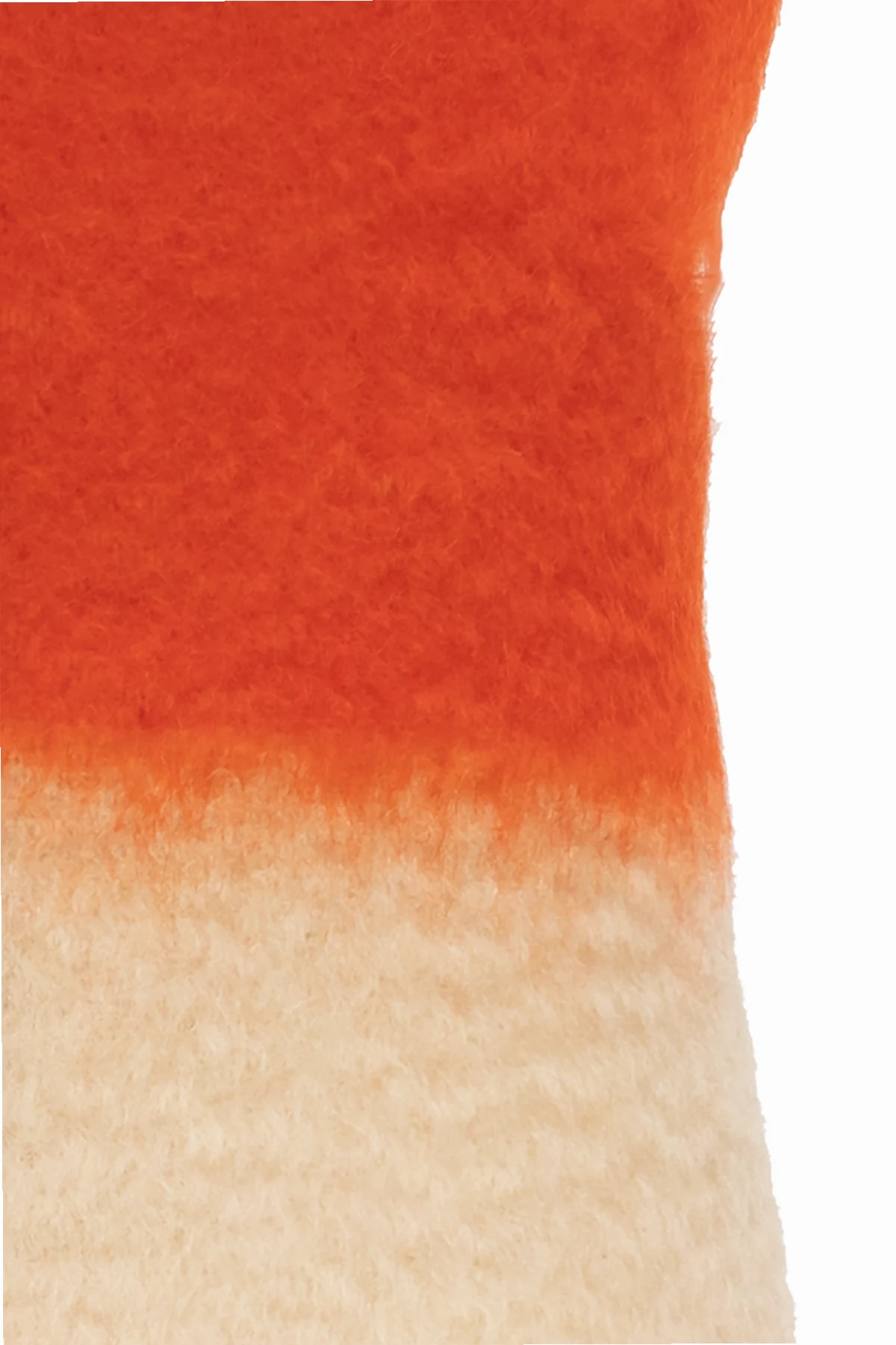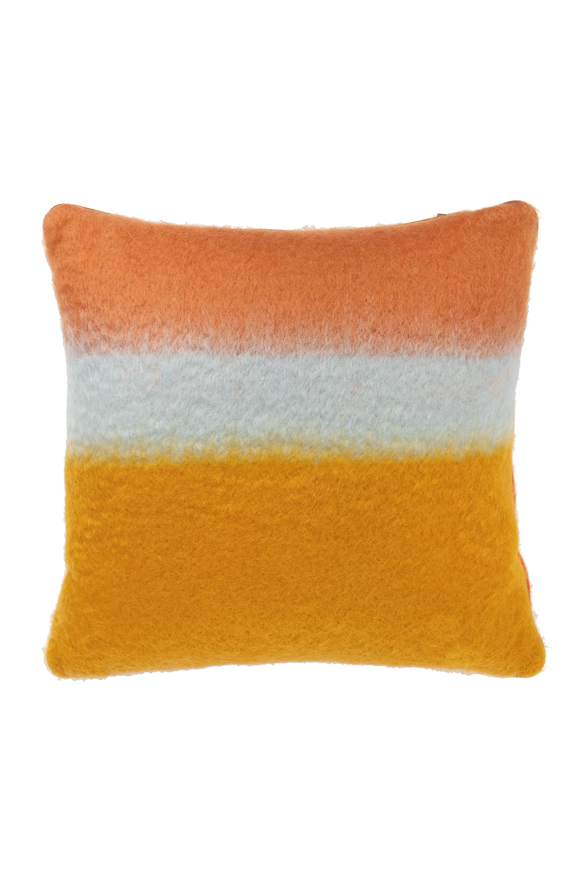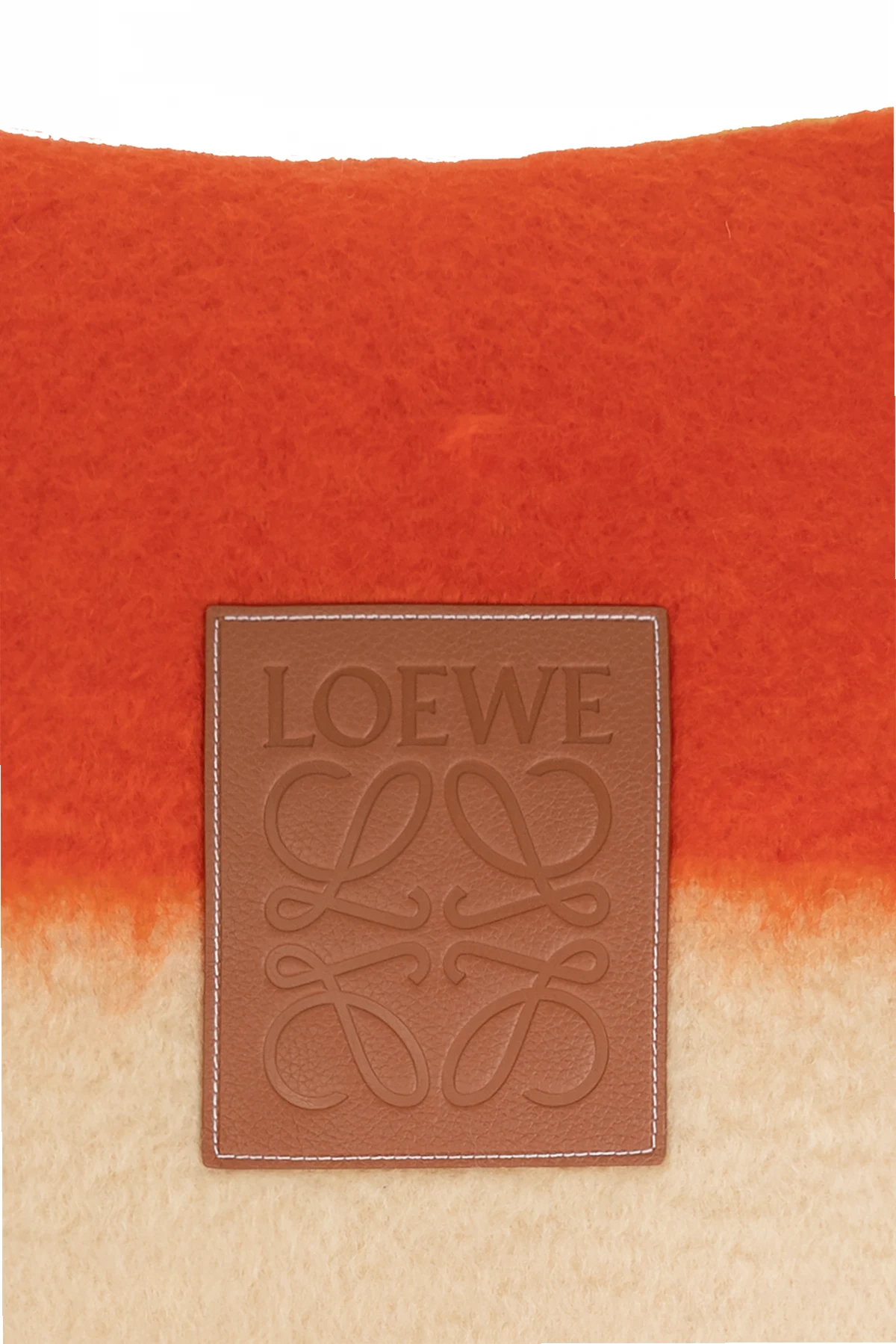 Kolorowa poduszka o moherowym wykończeniu Loewe. Zapinana na zamek. Ozdobiona skórzaną naszywką z logo. Bawełniana warstwa wewnętrzna z wypełnieniem z pierza.