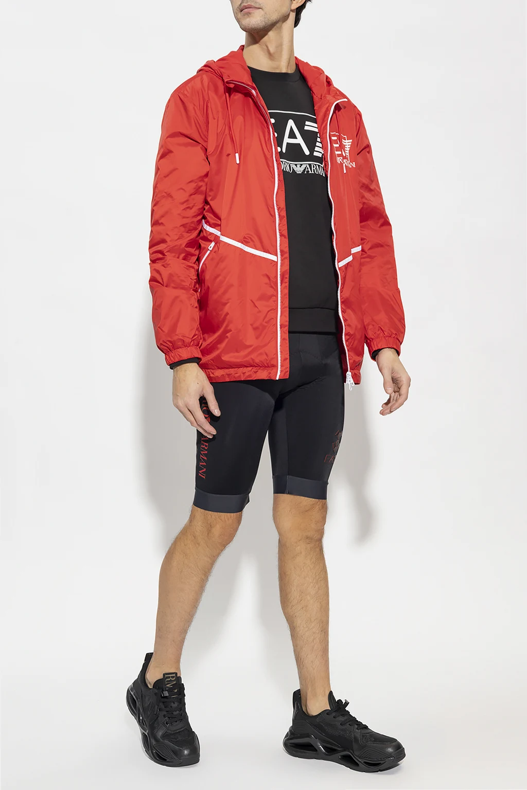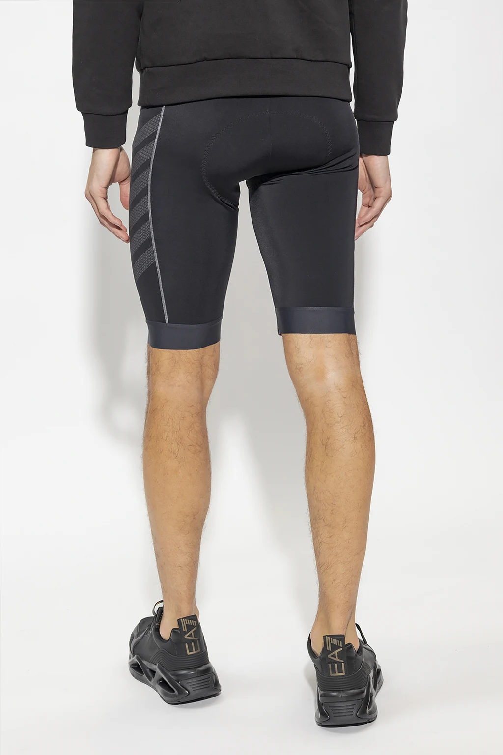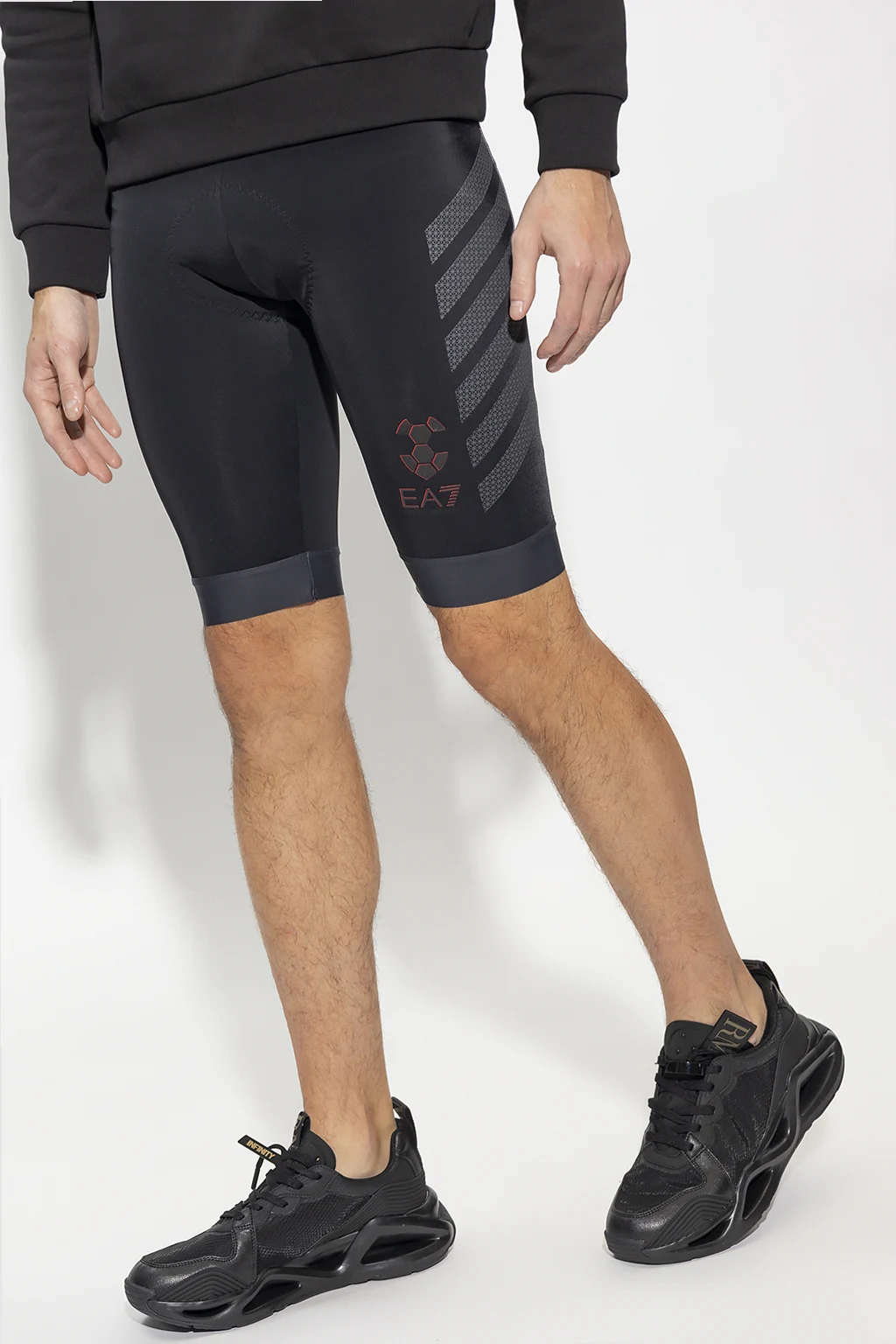 Czarne kolarki EA7 Emporio Armani. W pasie wszyta guma. Wykonane z technicznego, elastycznego materiału VIGOR7 zapewniającego komfort podczas aktywności fizycznej. Ozdobione nadrukiem i logo. Z tyłu kieszeń zamykana na zamek. Wyposażone w piankową wkładkę wewnętrzną.