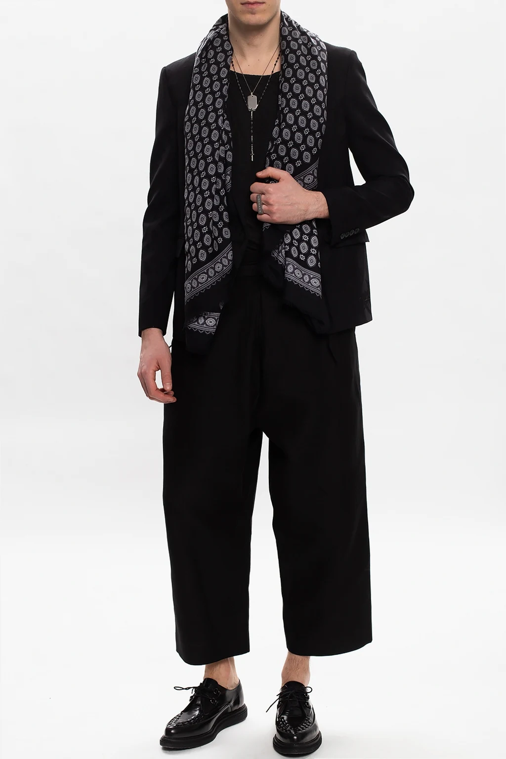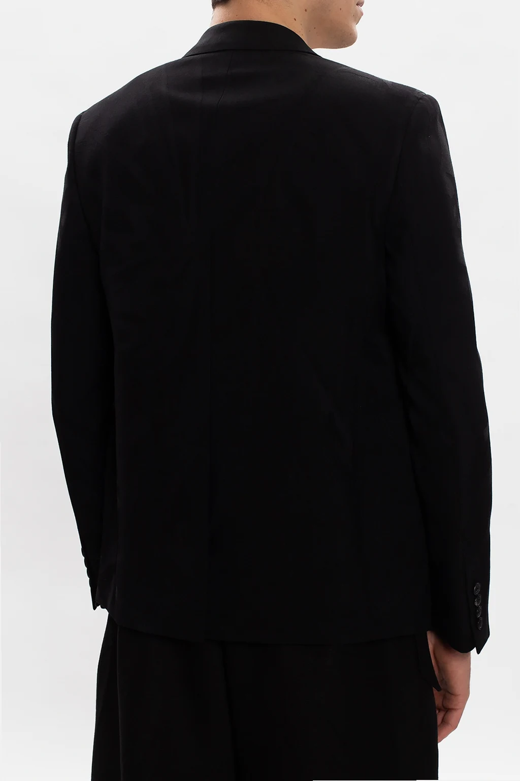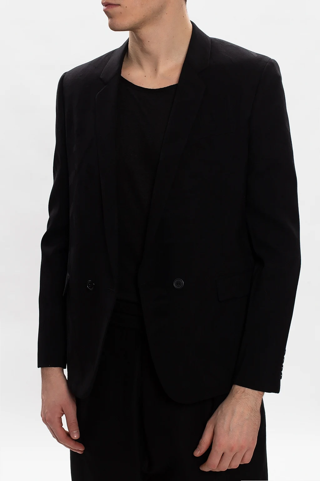 Czarna marynarka Saint Laurent. Wykonana z wełny. Zapinana na dwurzędowe zapięcie. Ozdobione wyszytym wzorem z motywem kwiatowym. Długie rękawy zakończone zapięciem na guziki.