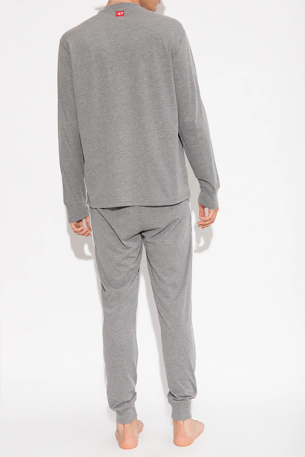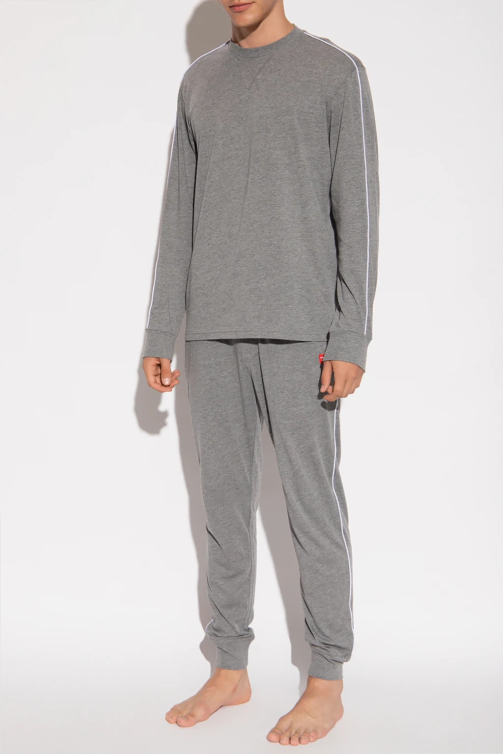 Szara, dwuczęściowa piżama, model ‘UFSET-SLIMMY-TOOL’ Diesel. Wykonana częściowo z bawełny. T-shirt z okrągłym dekoltem i długimi rękawami zakończonymi ściągaczem z białymi paskami na ramionach. Długie spodnie z wszytą w pasie gumą, czerwonymi wstawkami po bokach i dwiema kieszeniami oraz naszywką z logo. Długie nogawki z naszytymi paskami w kolorze białym, zakończone ściągaczem.