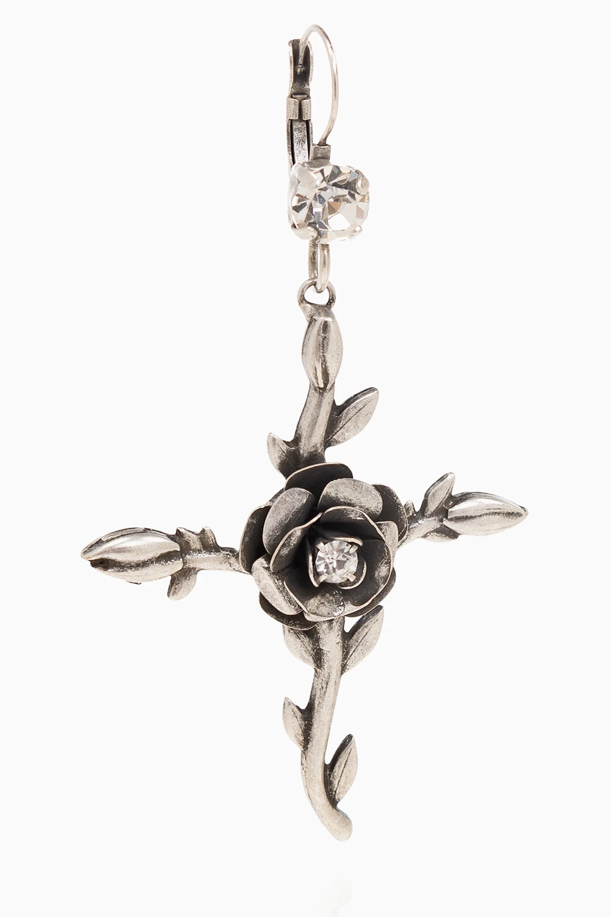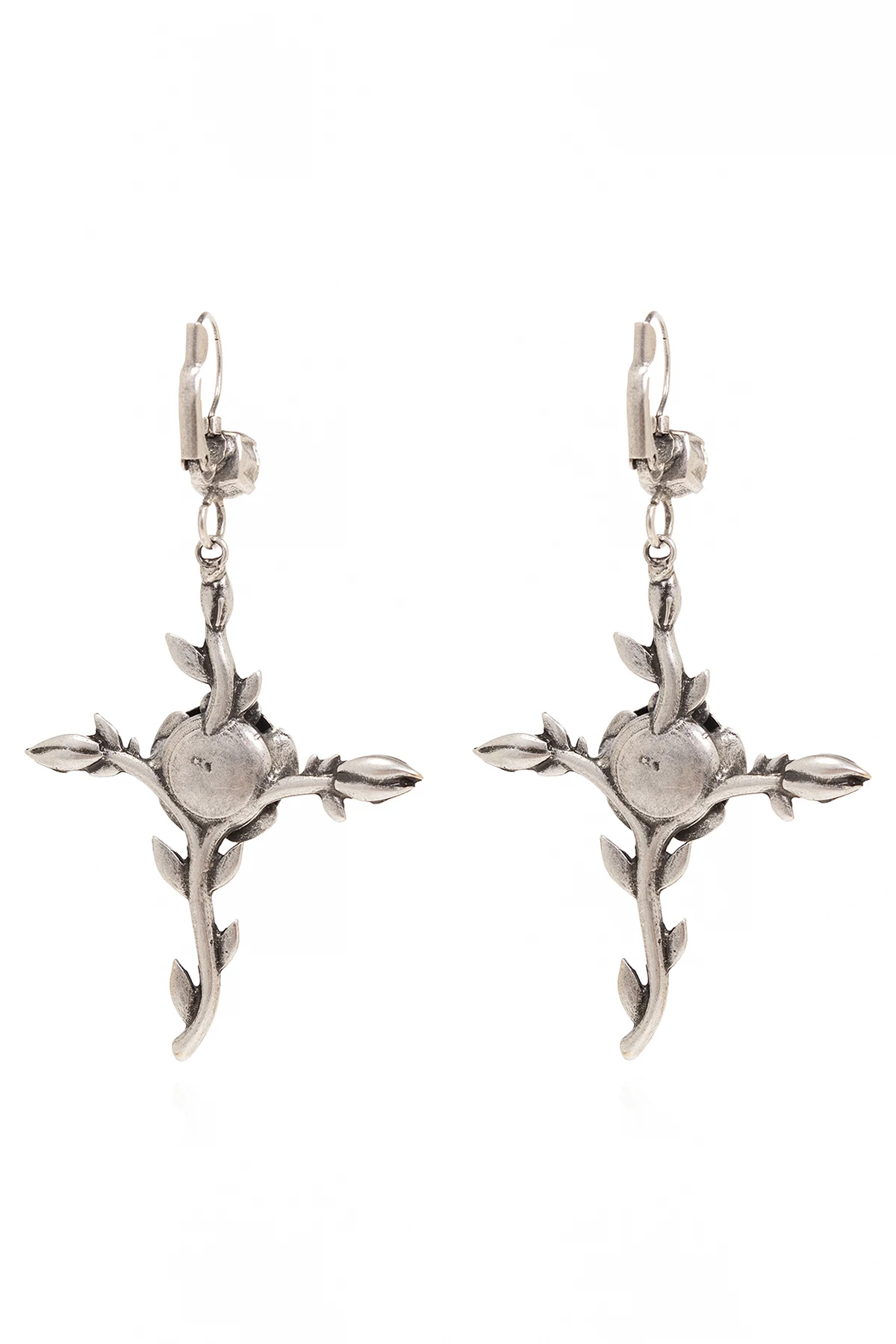 Kolczyki w kolorze postarzanego srebra Blumarine. Zapinane na bigiel. Ozdobione połyskującymi kryształami. Dekoracyjna zawieszka w kształcie krzyża z motywem róż.