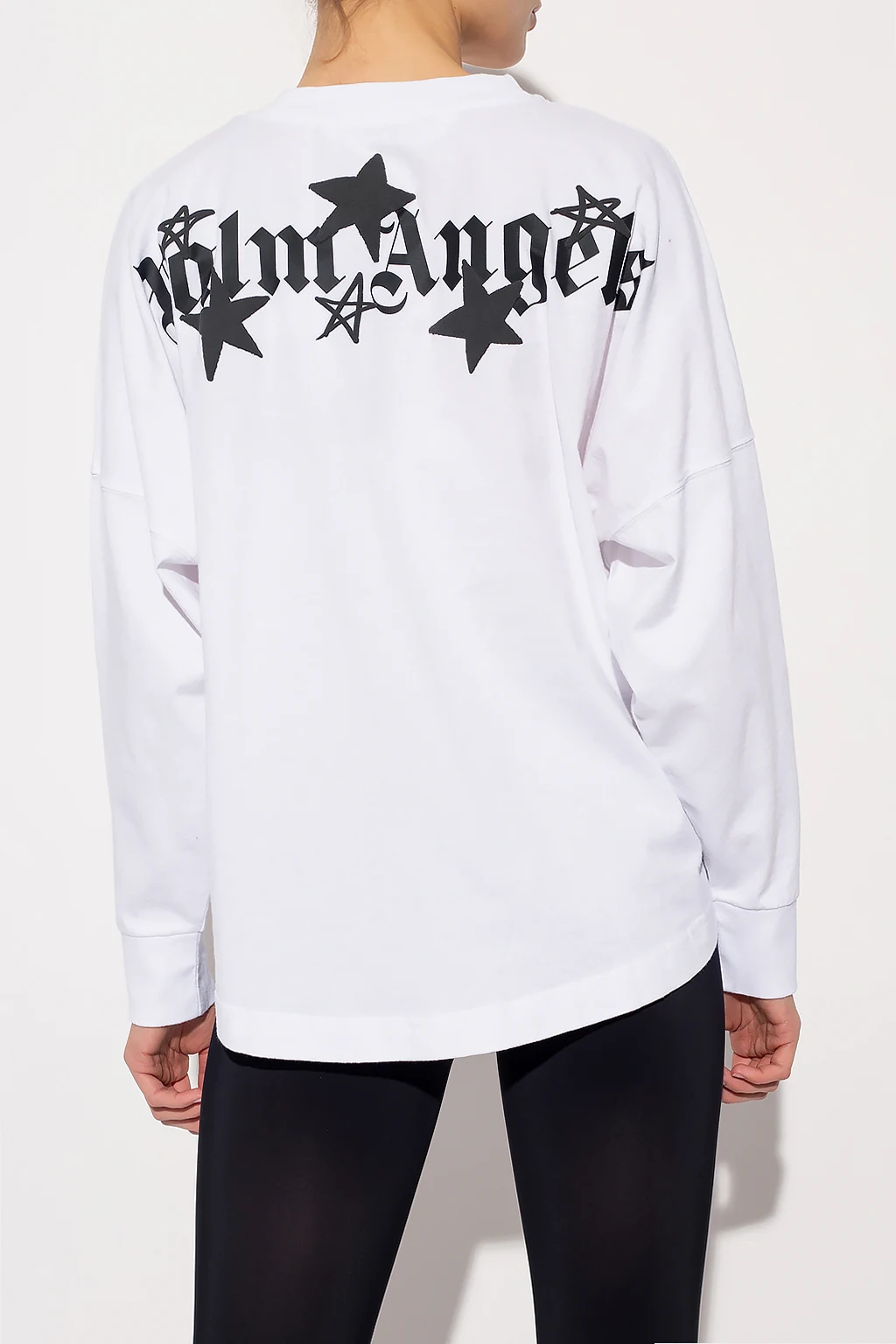 Biały, bawełniany t-shirt z długim rękawem Palm Angels. Ozdobiony nadrukowanym logo oraz wzorem w kolorze czarnym. Okrągły dekolt, rękawy oraz dół wykończone ściągaczem.