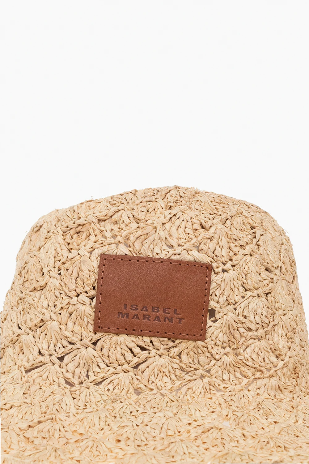 Beżowy kapelusz, model ‘Tulum’ Isabel Marant. Wykonany z raffi o dekoracyjnym splocie. Ozdobiony naszywką z logo.