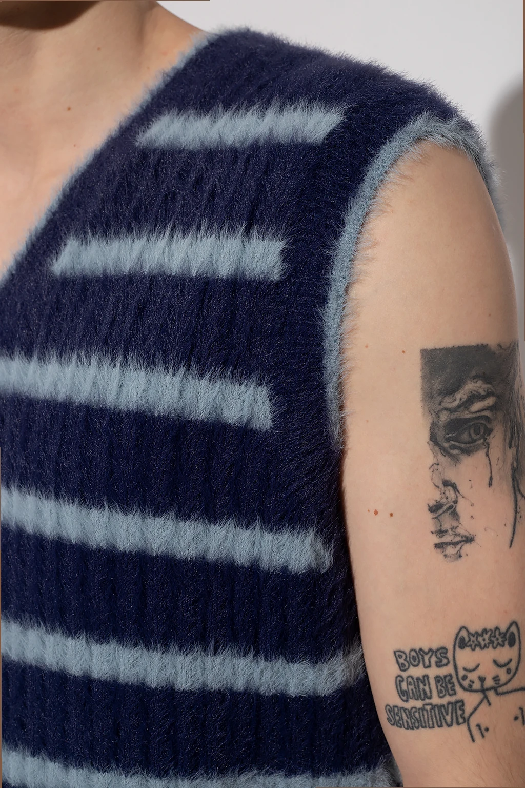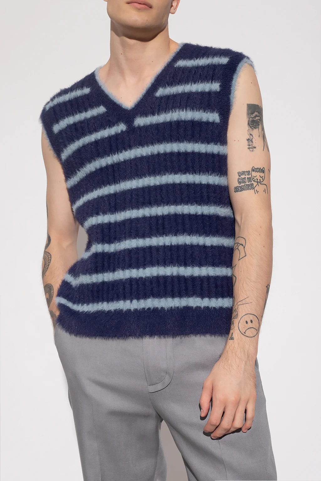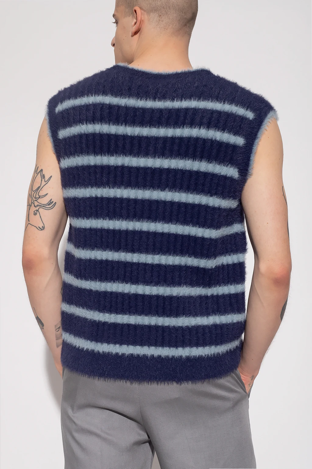 Granatowo-niebieska kamizelka Jacquemus. Ozdobiona wzorem w pasy. Dekolt w serek.
