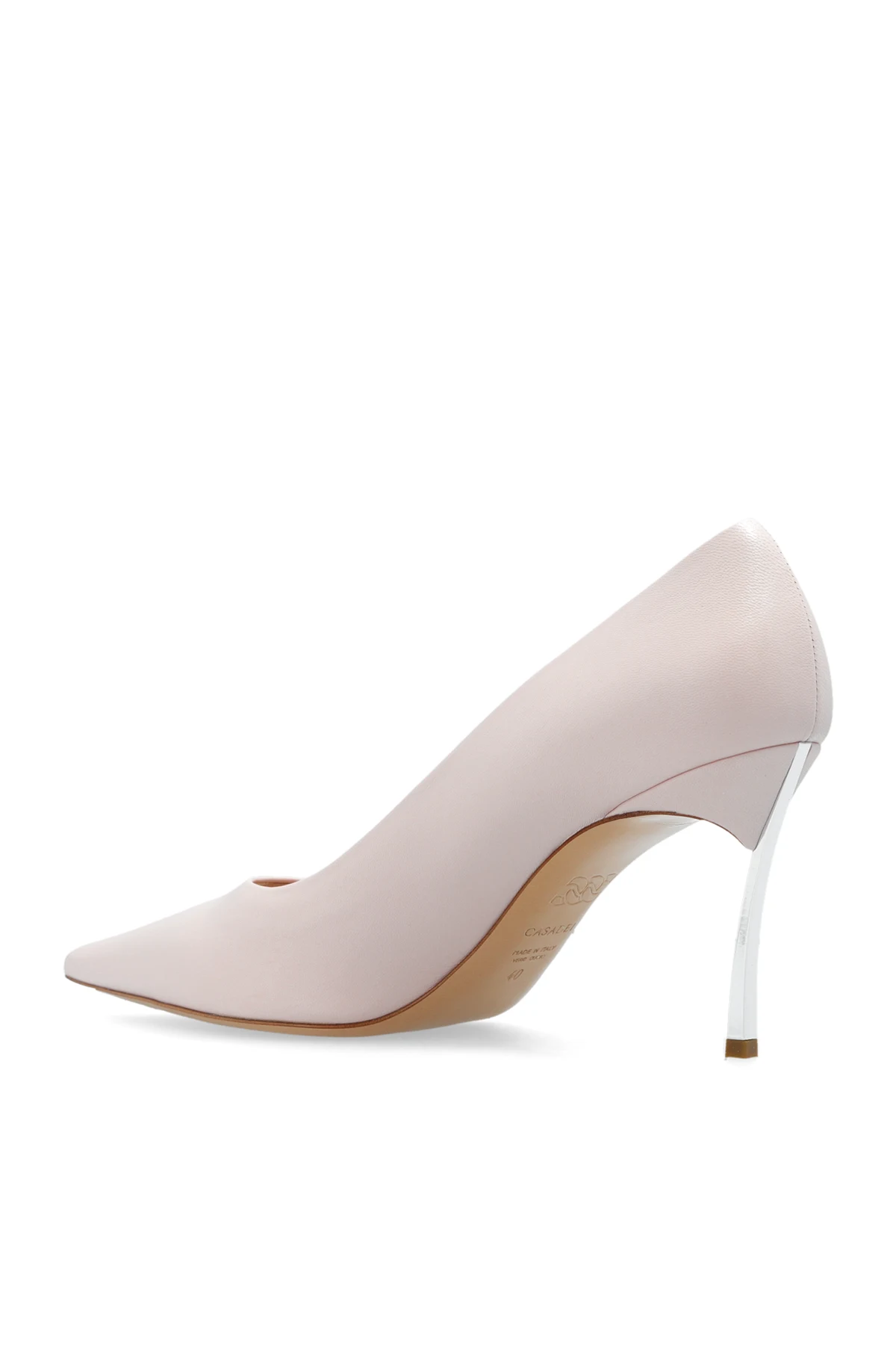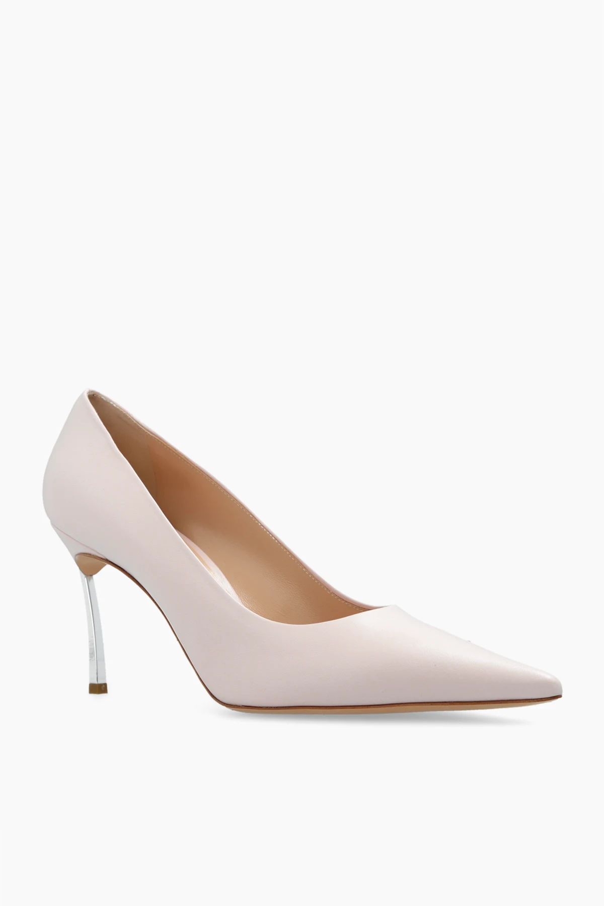 Jasnoróżowe szpilki, model ‘Superblade Jolly’ Casadei. Wykonane ze skóry. Nosek w szpic. Charakterystyczny dla marki obcas ze stali nierdzewnej. Beżowa, skórzana podeszwa.