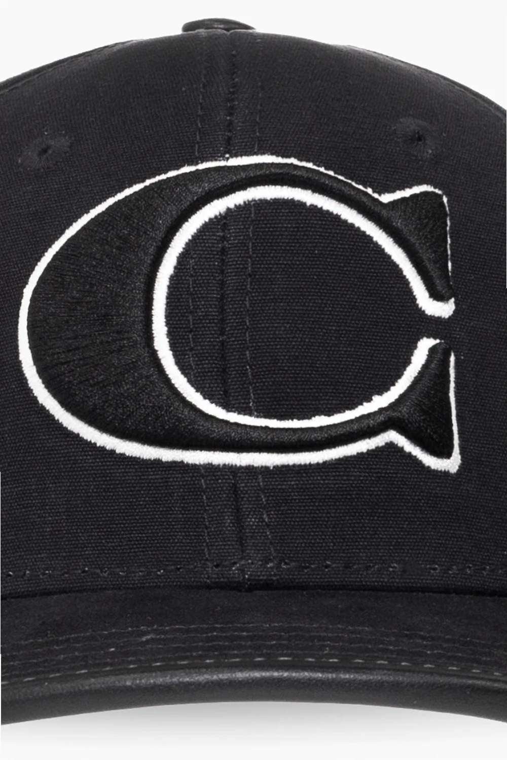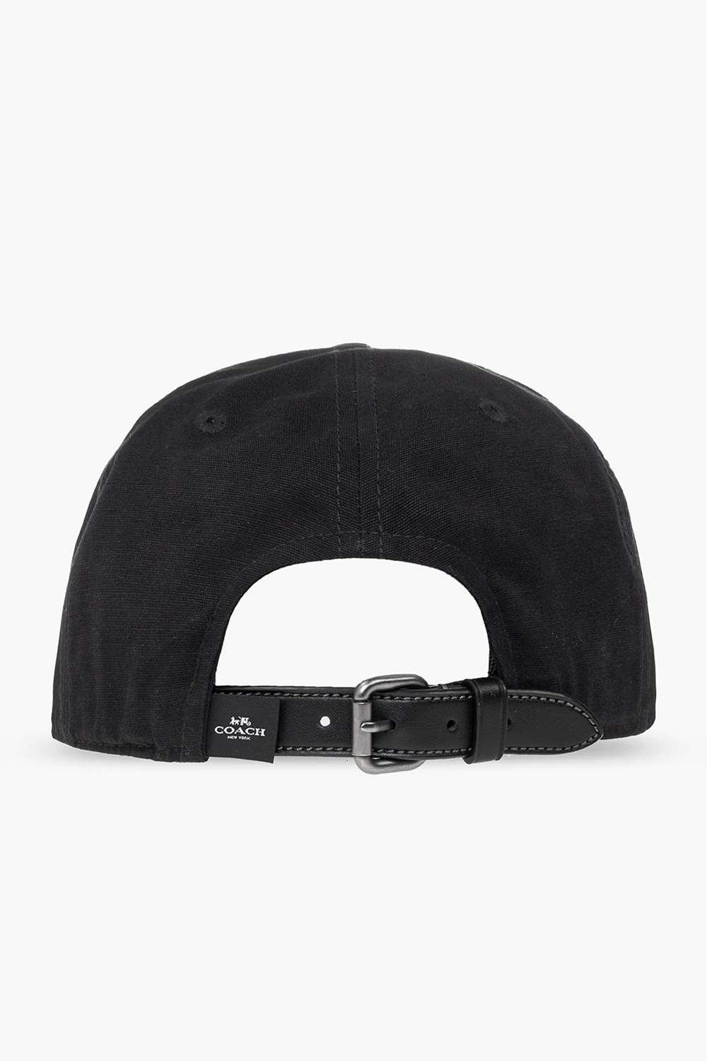 Czarna czapka z daszkiem Coach. Wykonana z bawełnianego płótna i wykończona skórą. Zapinana z tyłu na regulowany pasek. Z przodu wyszyte logo w kolorze czarno-białym.