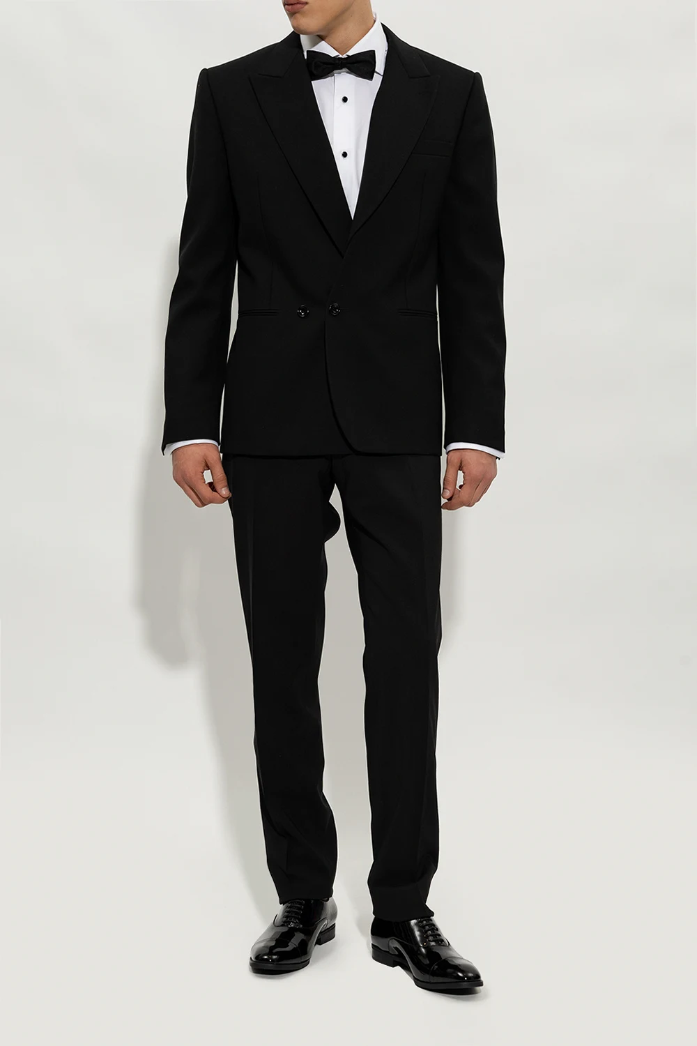 Czarne, sznurowane buty Emporio Armani. Wykonane z lakierowanej skóry. Dekoracyjne przeszycia. Czarna, gumowa podeszwa.
