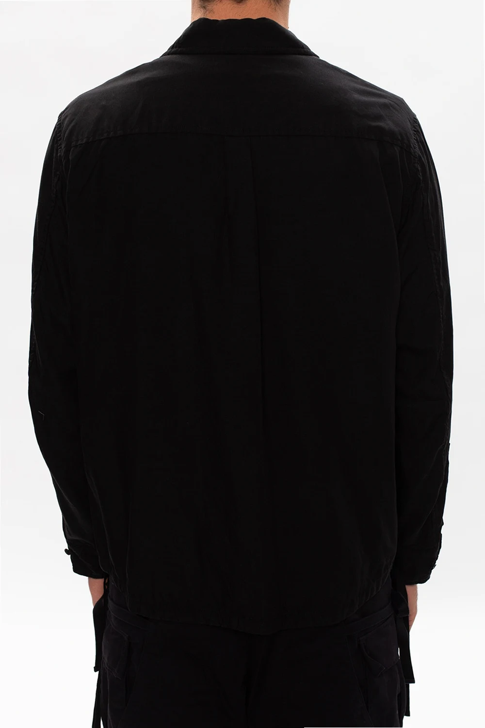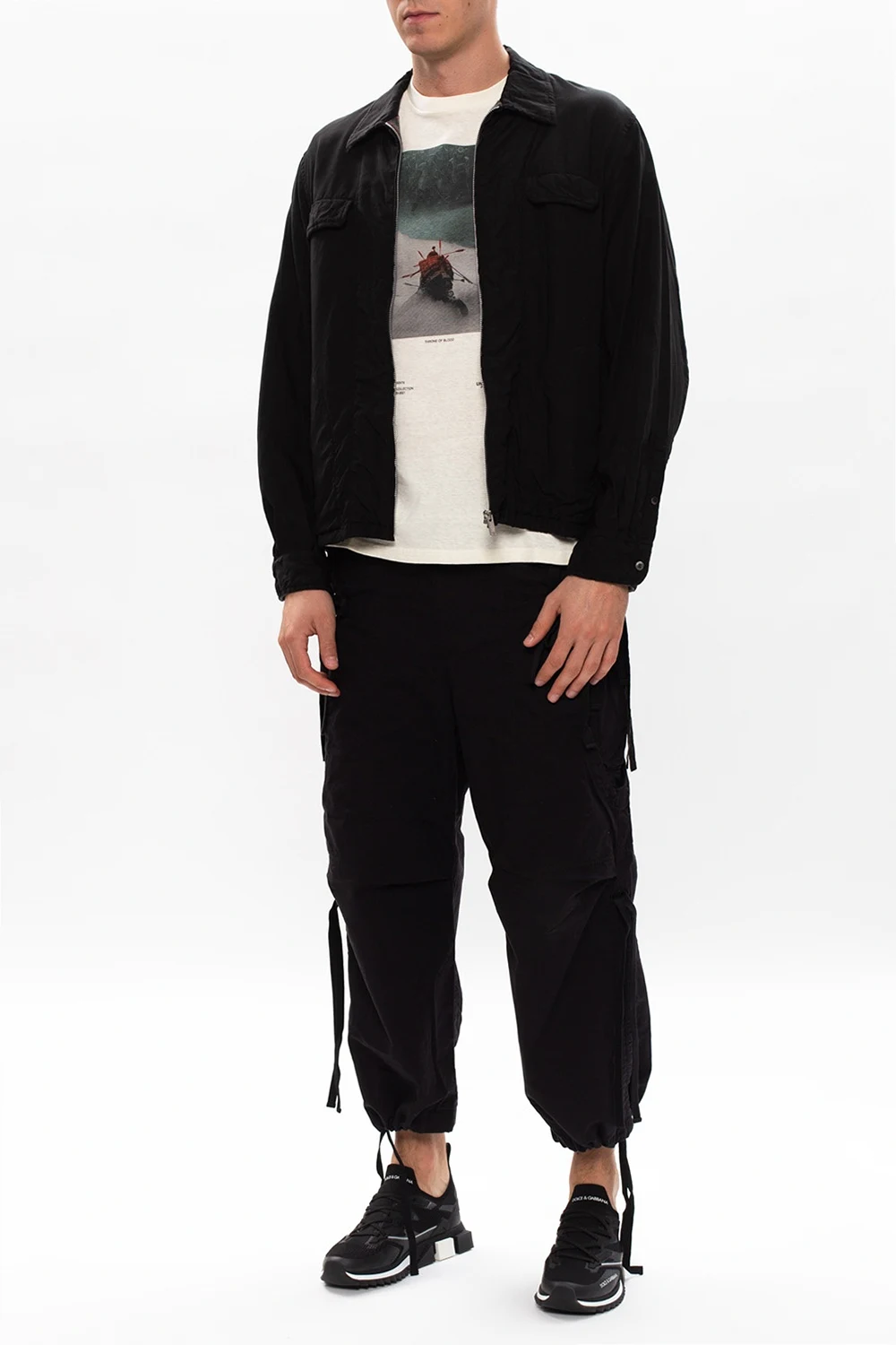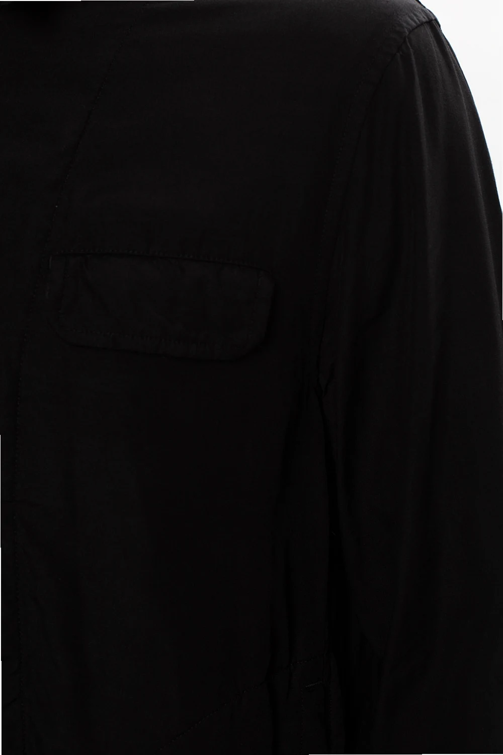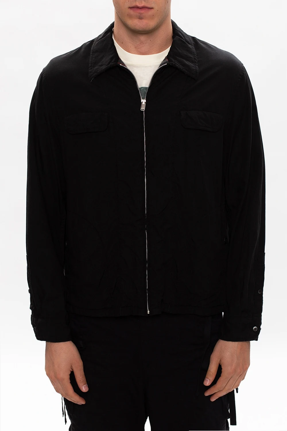 Czarna kurtka Undercover. Zapinana na zamek. Cztery kieszenie: dwie z patkami oraz dwie zapinane na guzik. Dół ściągany trokami. Długie rękawy zakończone zapięciami na guziki.