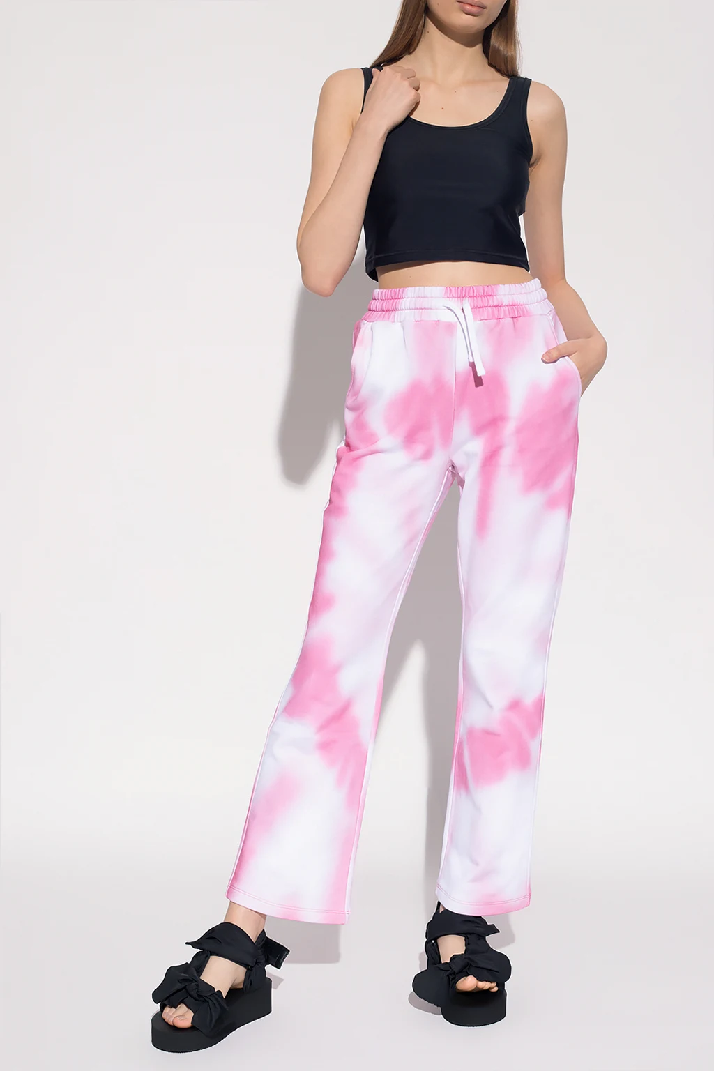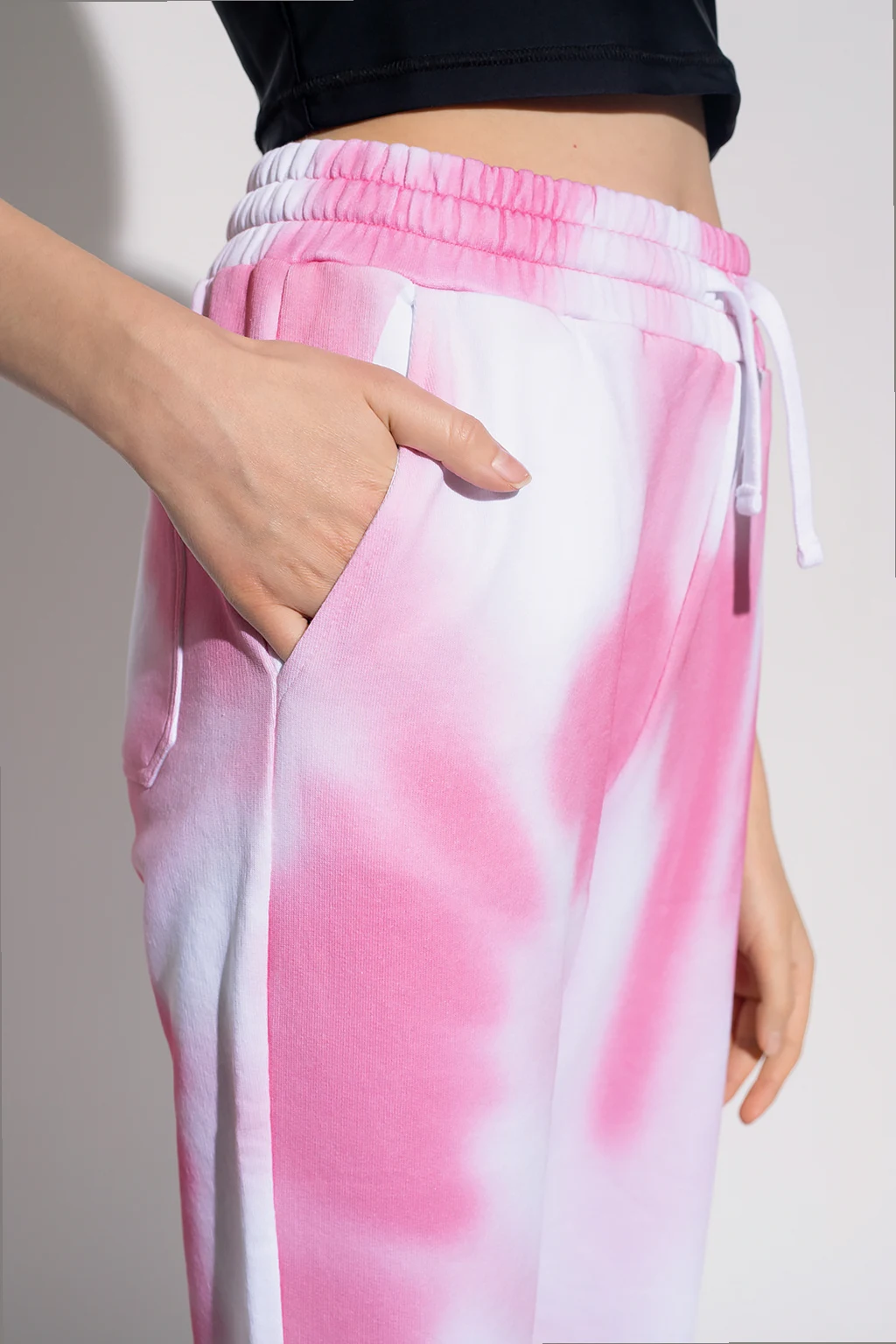 Różowo-białe, bawełniane spodnie dresowe Red Valentino. W pasie wszyta guma ściągana trokami. Ozdobione wzorem z motywem ‘tie-dye’. Cztery wsuwane kieszenie: dwie z przodu oraz dwie z tyłu, w tym jedna z wyszytym logo w kolorze różowym. Długie, proste nogawki.