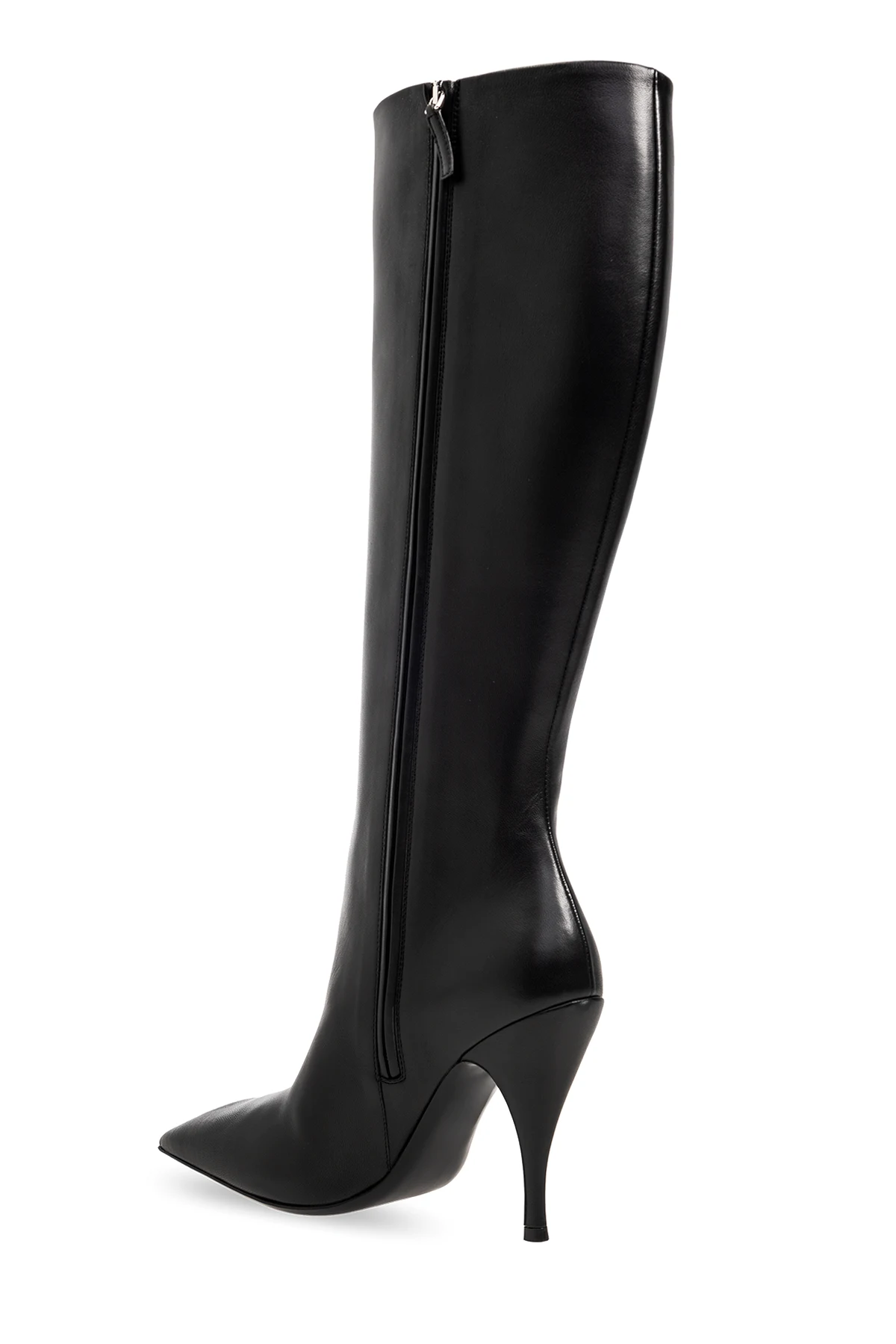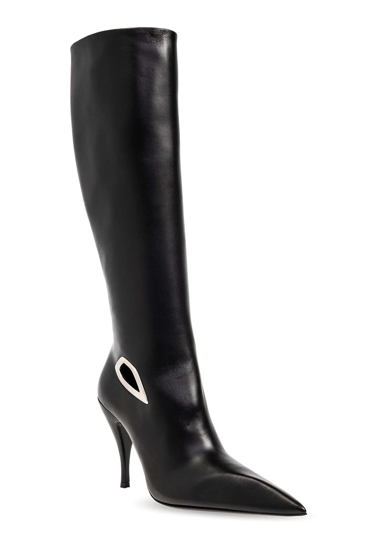 Czarne kozaki na obcasie, model ‘Crescent’ Off-White. Wykonane ze skóry. Z boku zapinane na zamek. Ozdobione metalowym, nieregularnym oczkiem w kolorze srebrnym z wygrawerowanym logo. Nosek w szpic. Czarna, skórzana podeszwa.