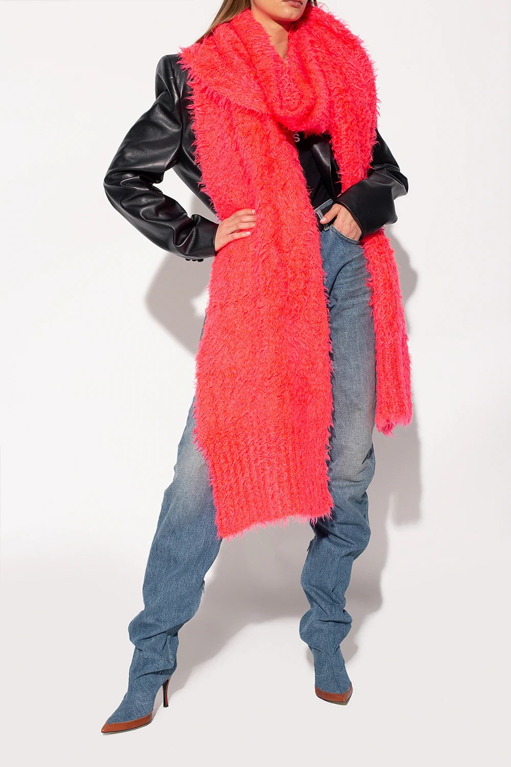 Neonoworóżowy, długi szal The Attico. Brzegi wykończone ściągaczem.
