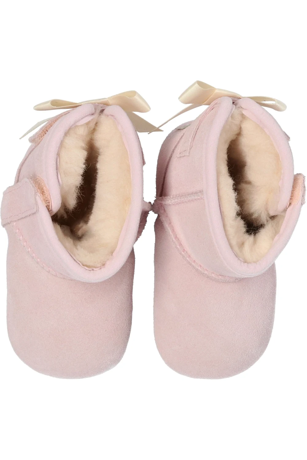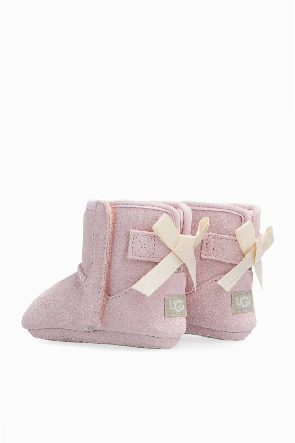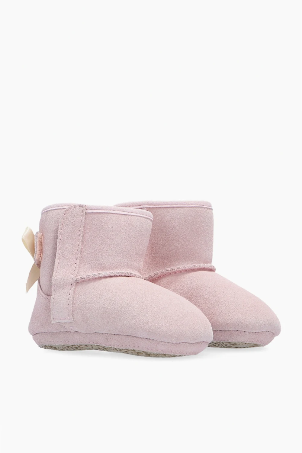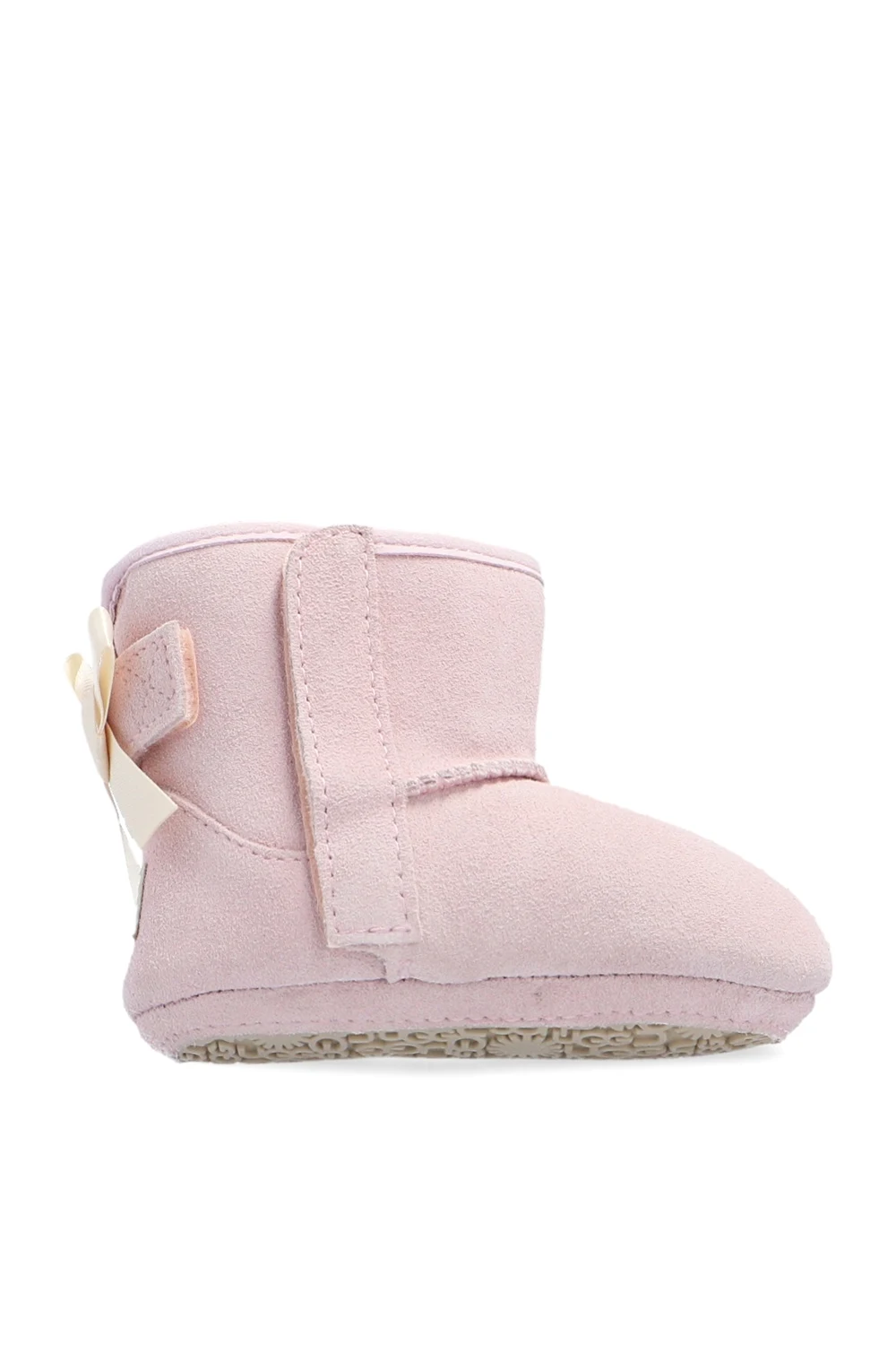 Zestaw: śniegowce oraz czapka. Jasnoróżowe, zamszowe śniegowce, model ‘I Jesse Bow II’ UGG Kids. Ocieplane wełną. Z boku zapinane na rzep. Ozdobione przeszyciami, dekoracyjną kokardą oraz naszywką z logo. Podeszwa wykończona gumą w kolorze kremowym. Dołączona prążkowana czapka w kolorze jasnoróżowym. Ozdobiona kokardą oraz logo.