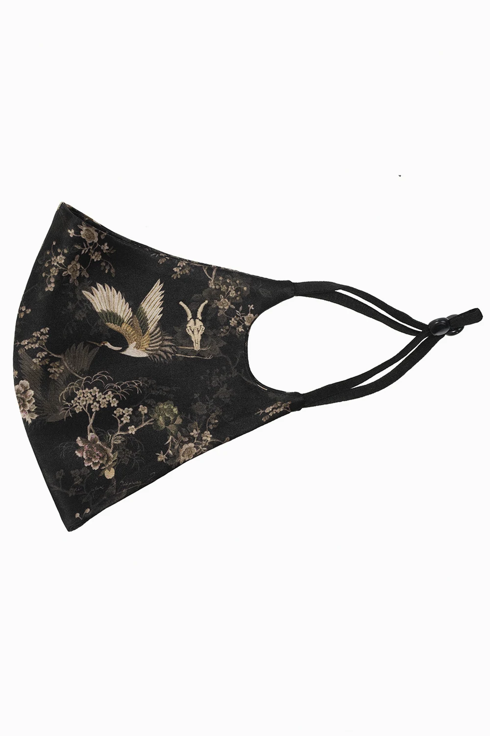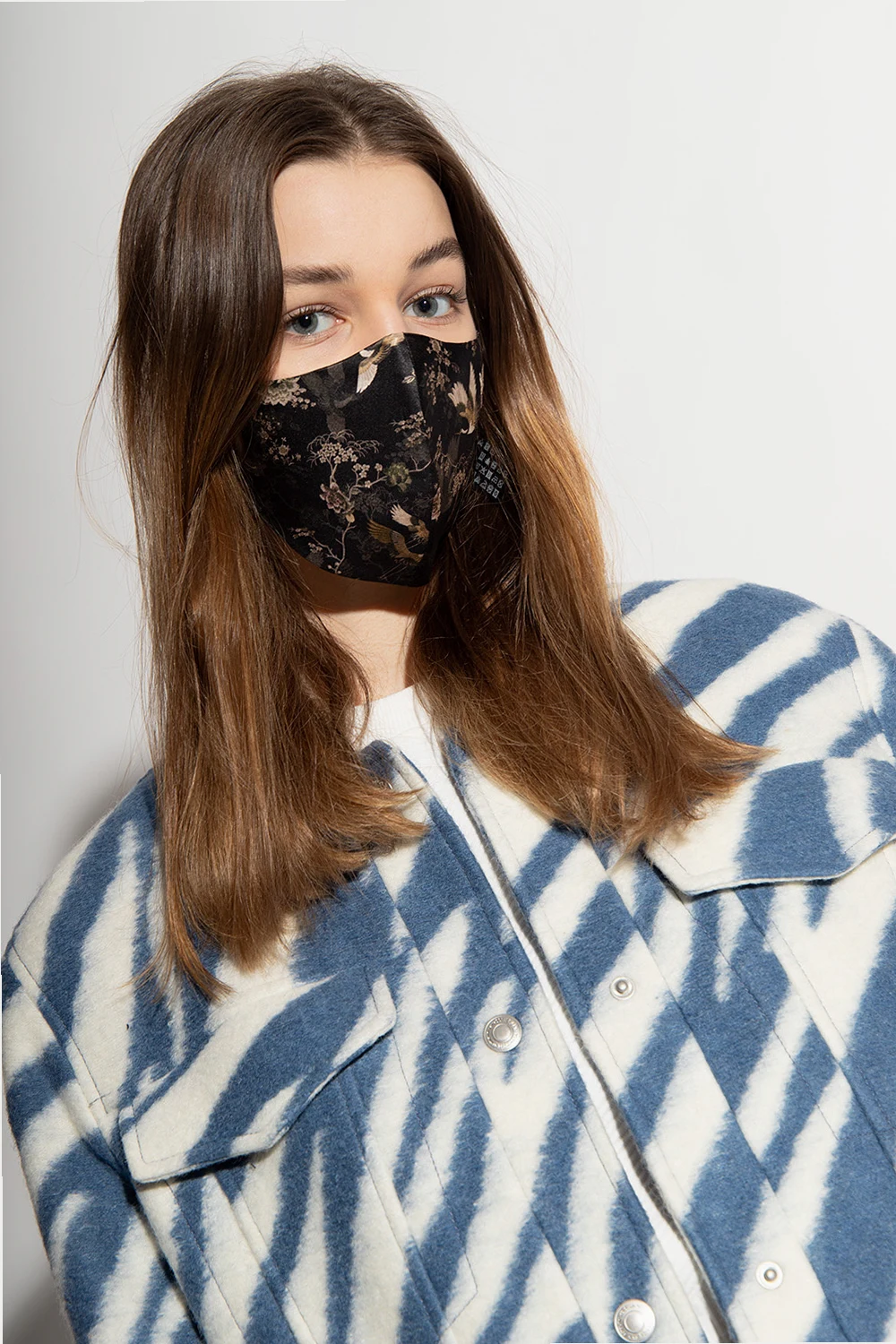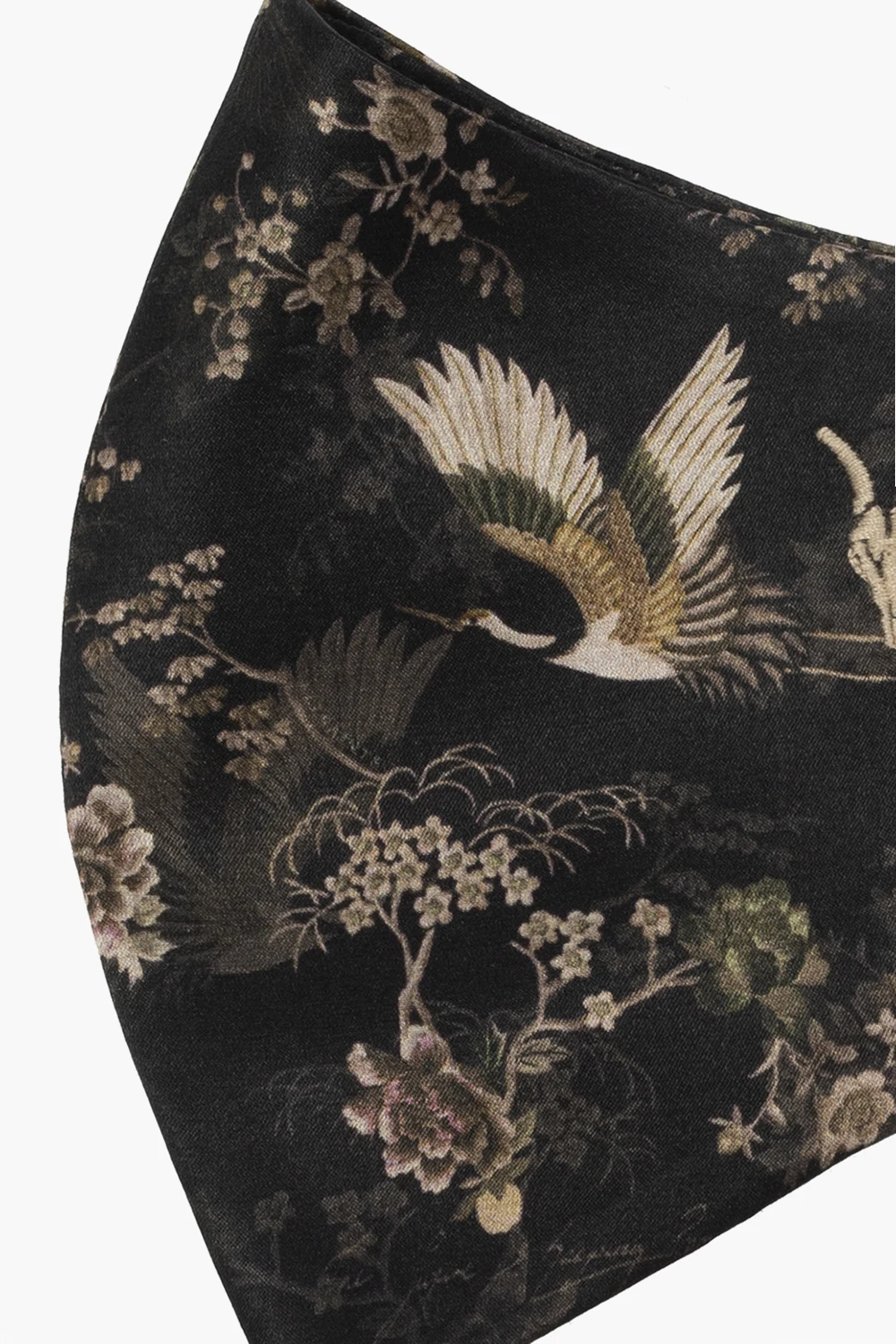 Czarna maska, model ‘Amare’ AllSaints. Ozdobiona wzorem z motywem kwiatowym oraz zwierzęcym w kolorze brązowym oraz wyszytym logo.