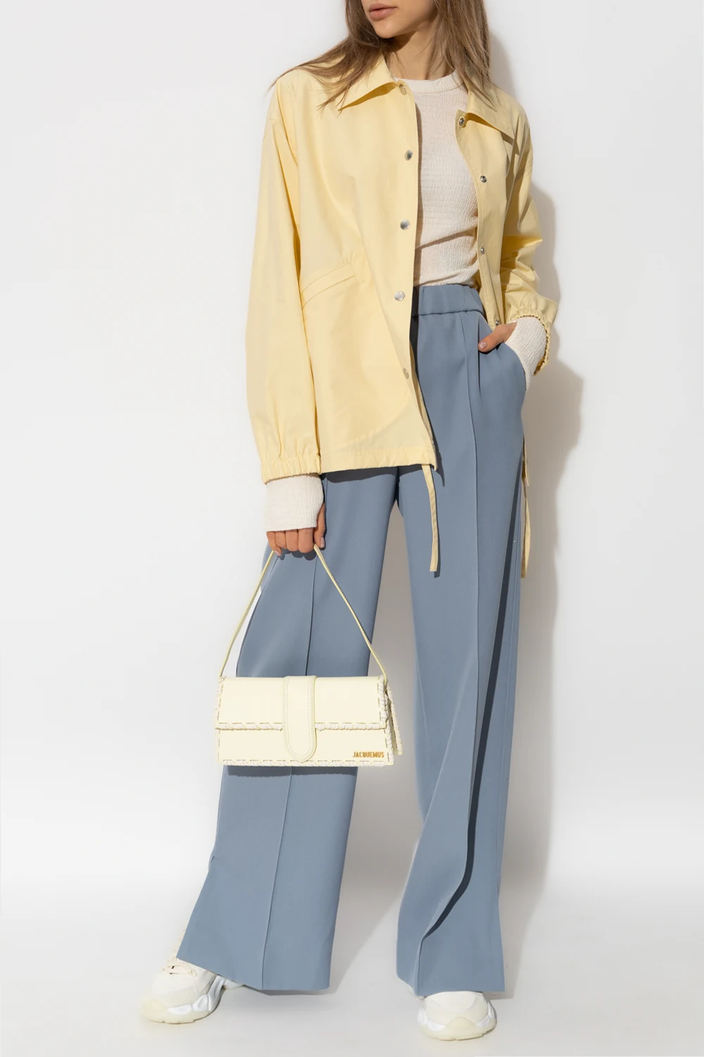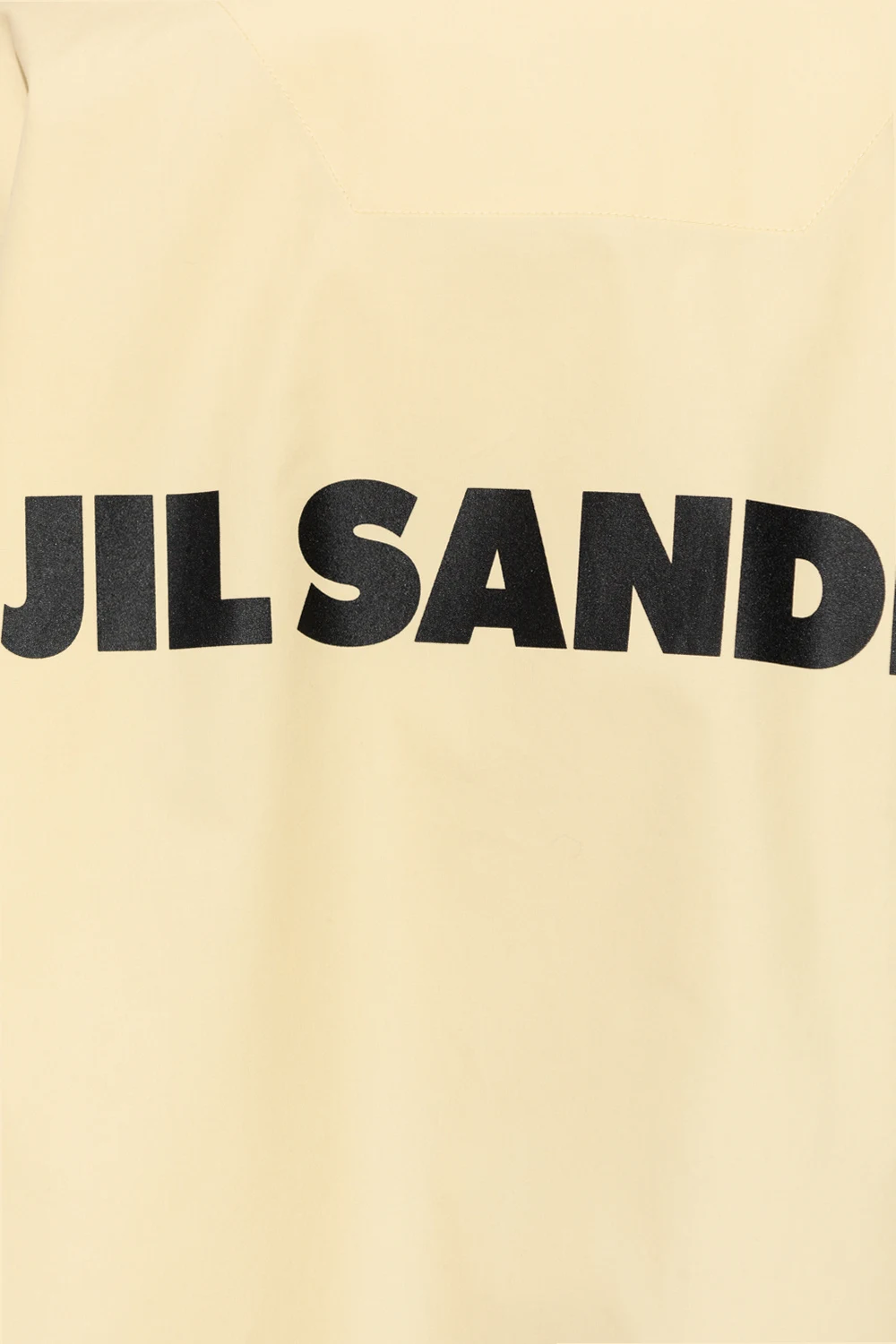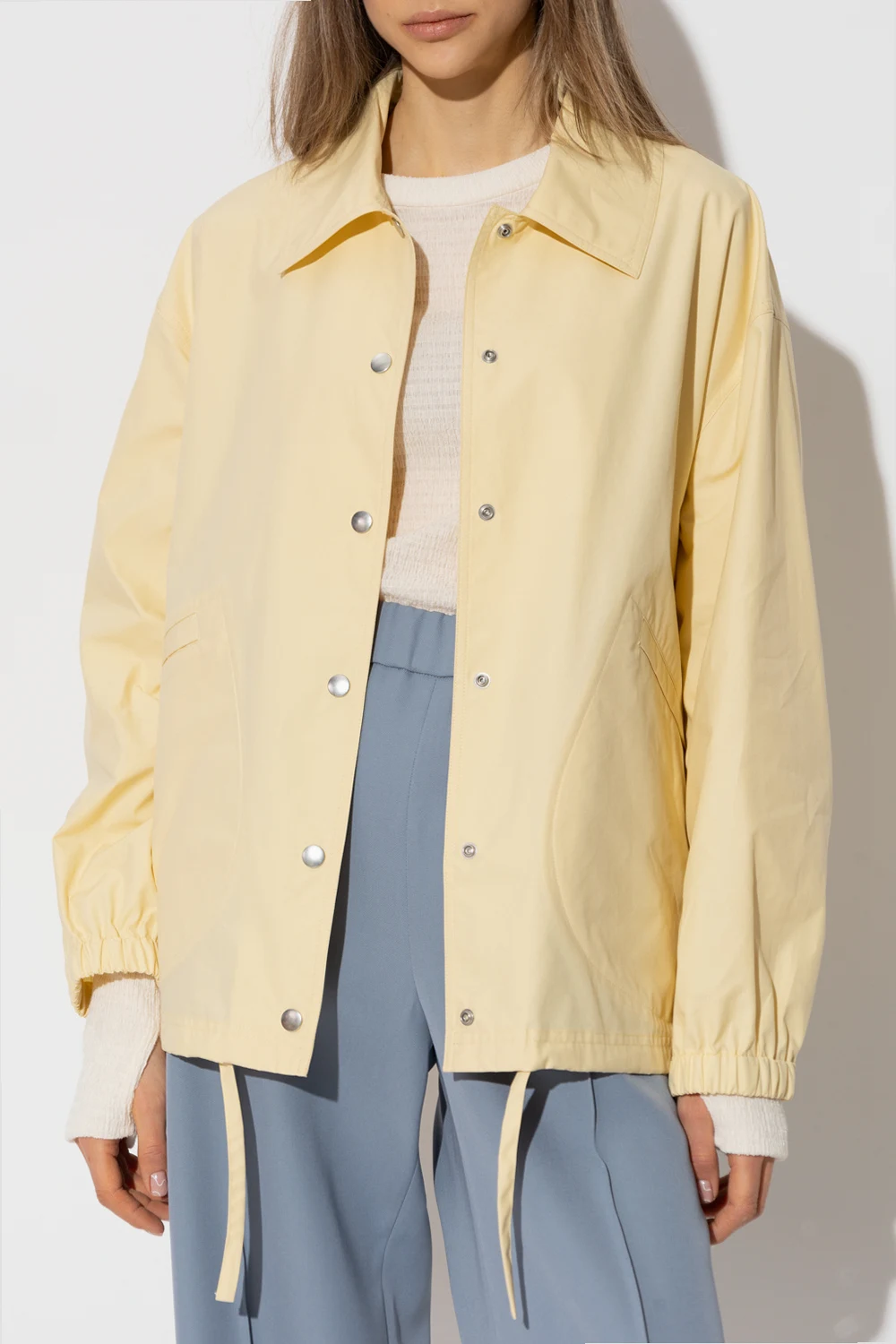 Żółta kurtka JIL SANDER. Wykonana z bawełny. Zapinana na zatrzaski. Z tyłu nadruk z logo. Dwie kieszenie wsuwane. Długie rękawy. Na dole ściągana trokami.