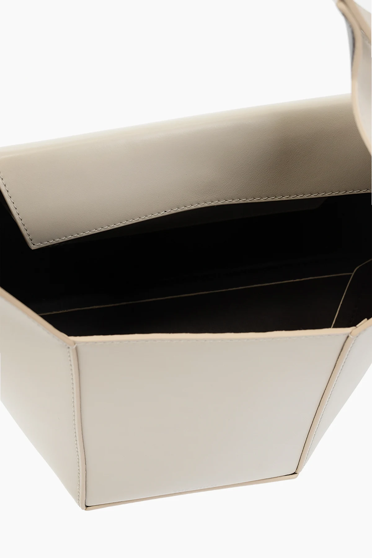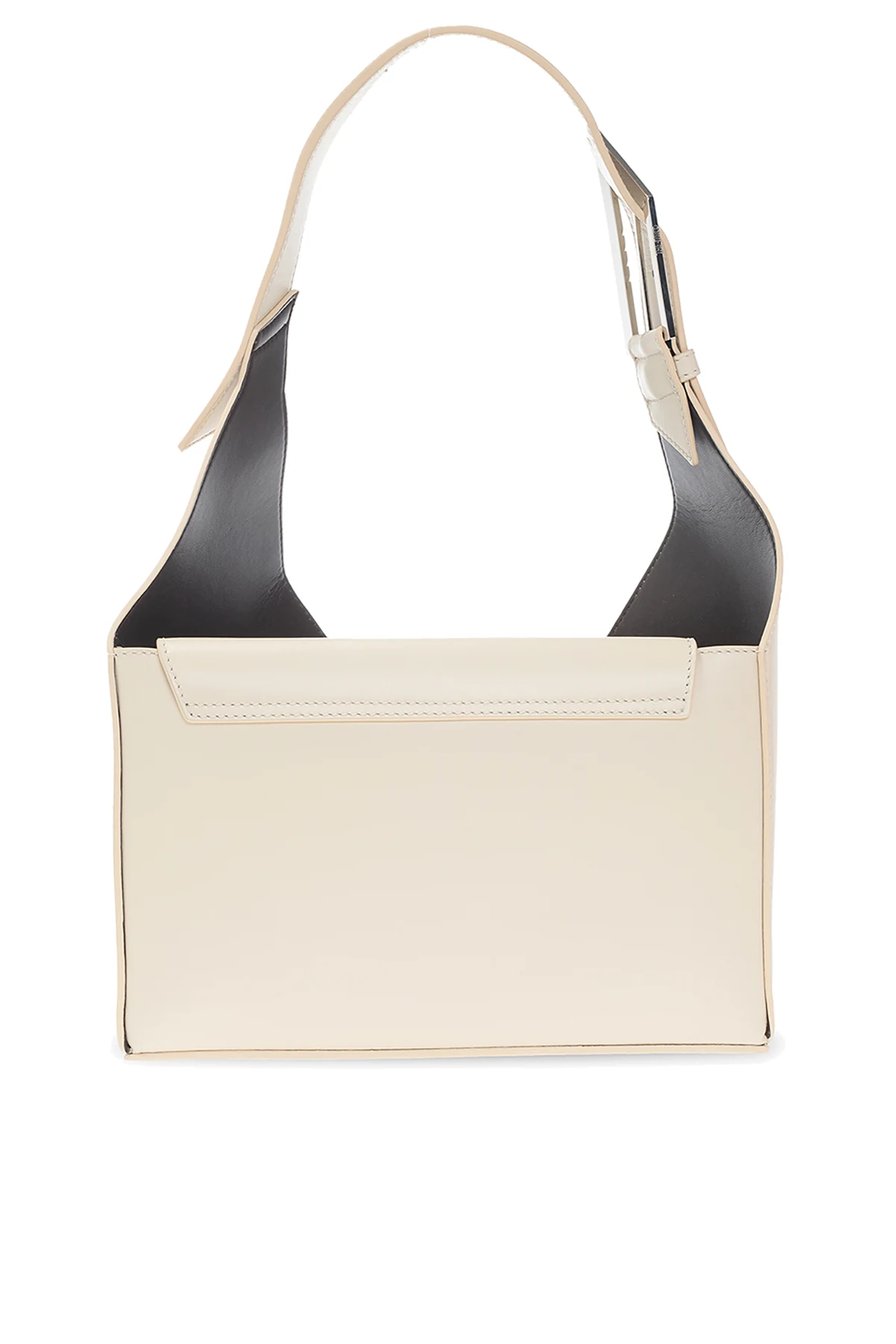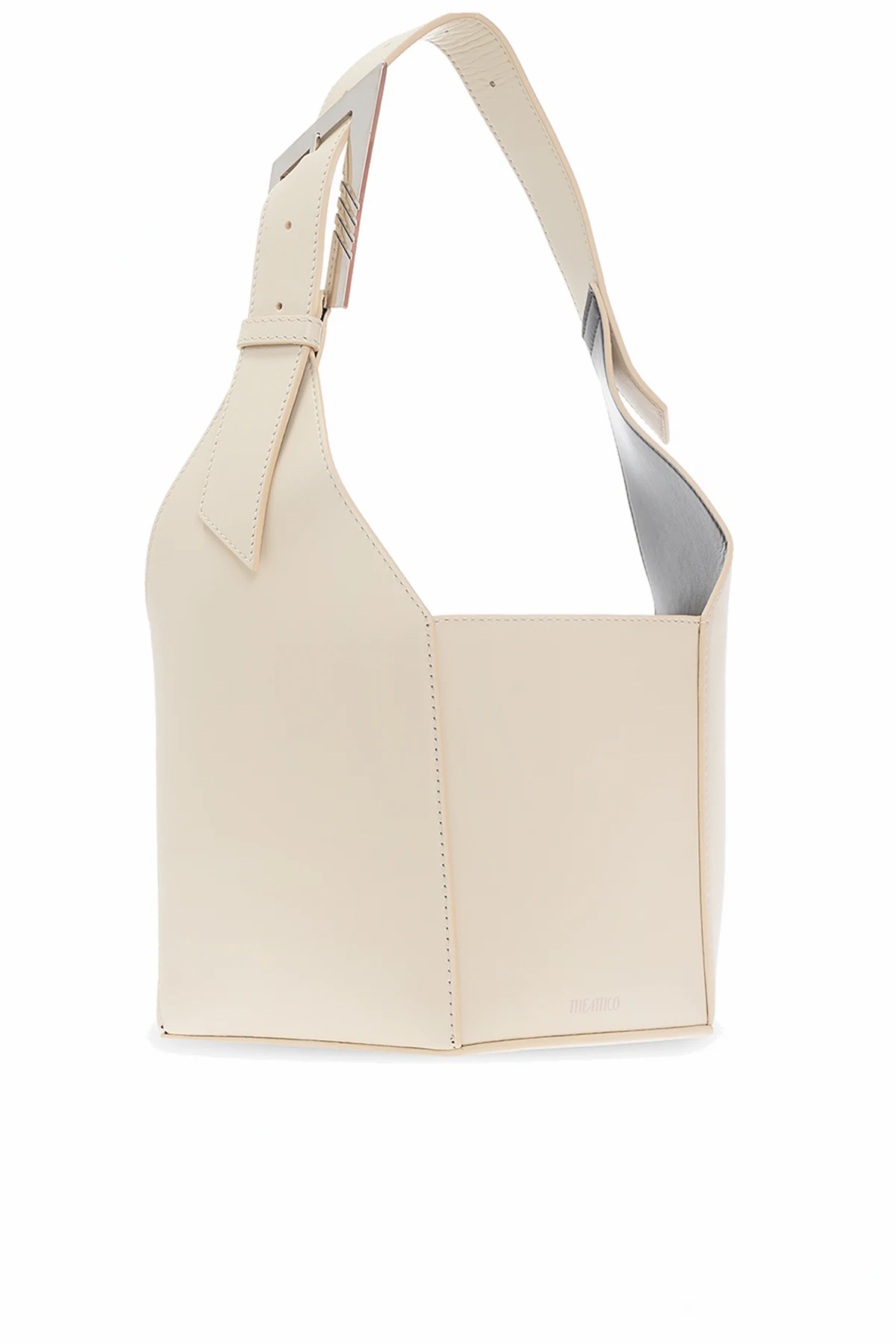 Kremowa torba do ręki, model ‘6 PM’ The Attico. Wykonana z cielęcej skóry. Z przodu nadrukowane logo w kolorze srebrnym. Pasek do ręki z możliwością regulacji długości. Wewnątrz komora i kieszeń z patką zapinana na zatrzask. Metalowe elementy w kolorze srebrnym.