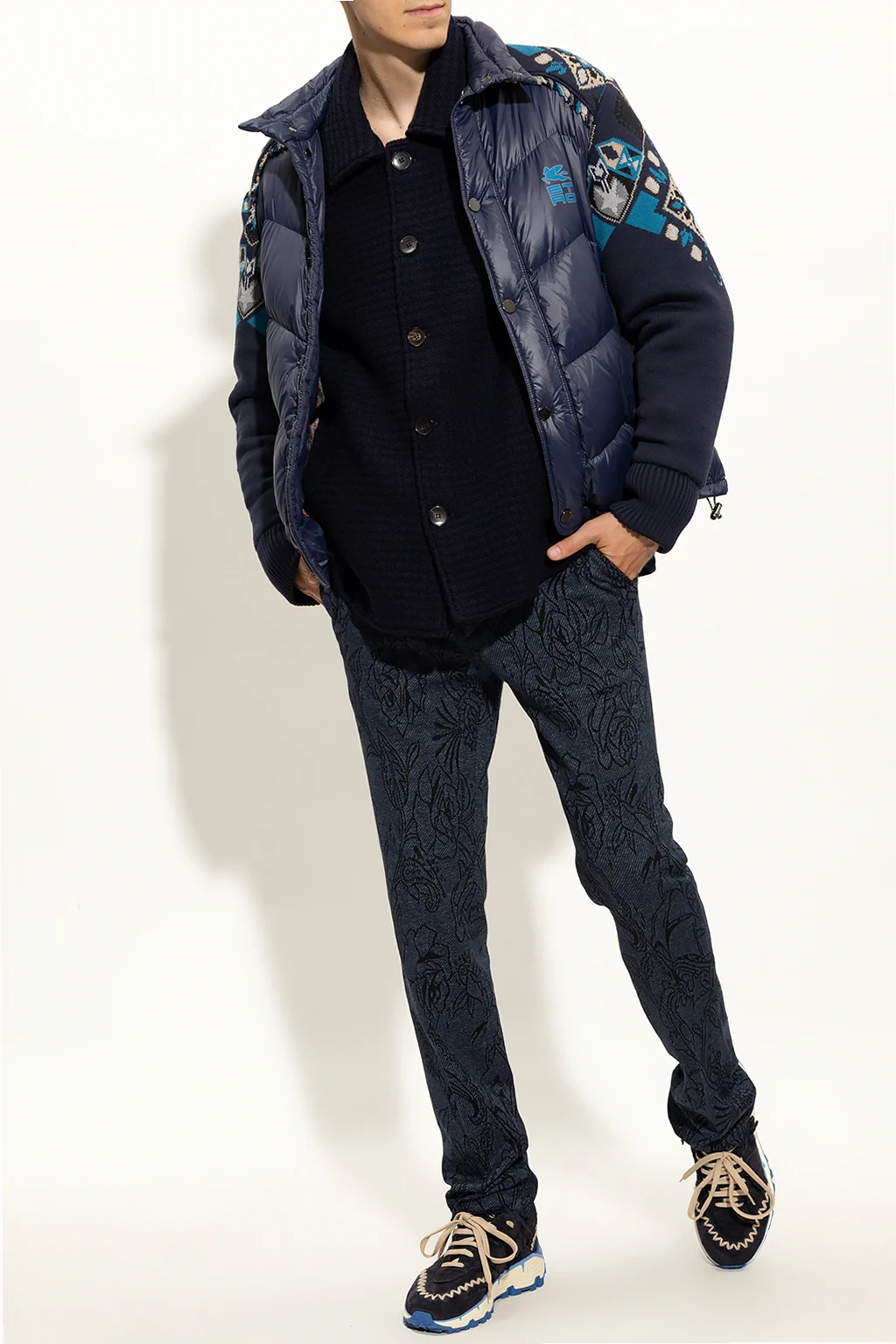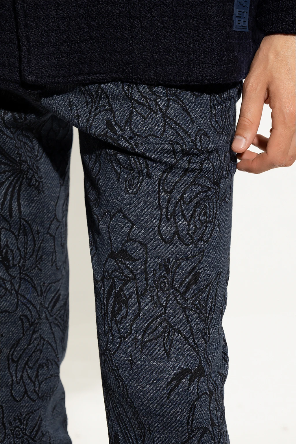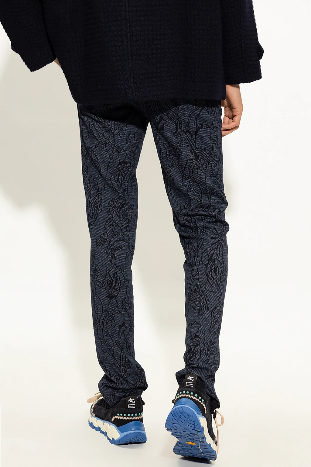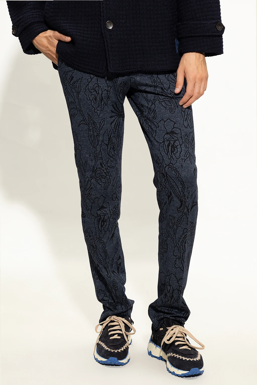 Granatowe spodnie w kant Etro. Wykonane z bawełny. Zapinane na guzik oraz zamek. Ozdobione żakardowym wzorem z motywem kwiatowym w kolorze czarnym. Cztery kieszenie: dwie wsuwane z przodu oraz dwie zapinane na guziki z tyłu. Długie, lekko zwężane nogawki.
