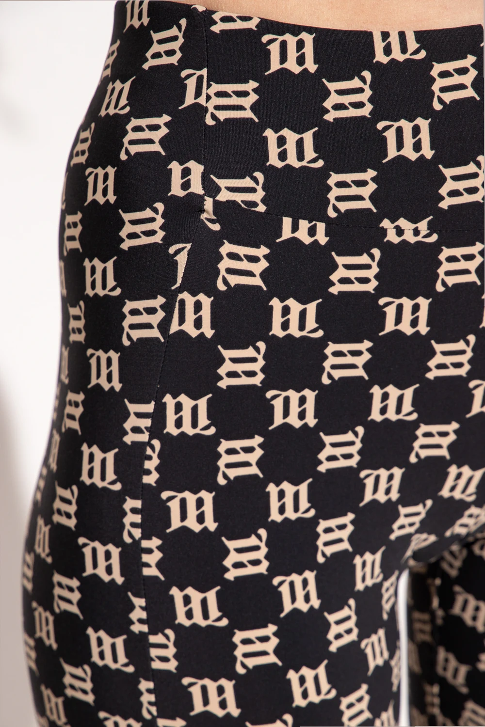 Czarne, krótkie legginsy MISBHV, kolekcja ‘Metamorphosis 1993’. Wykonane z elastycznego materiału ozdobionego wzorem z monogramem ‘M’ w kolorze beżowym. W pasie wszyta guma.