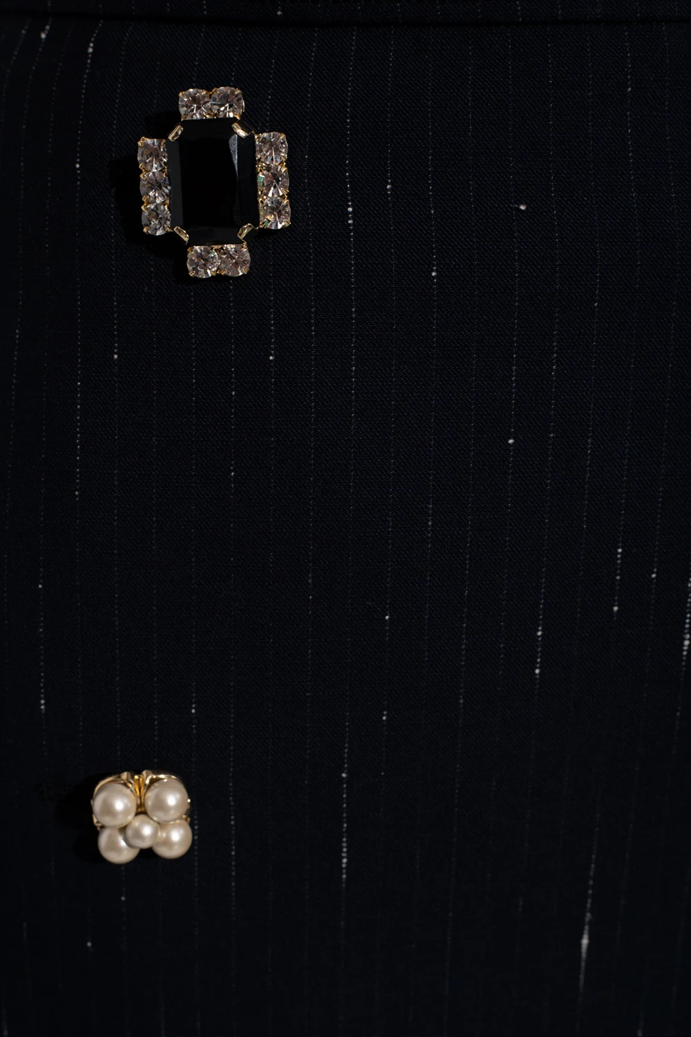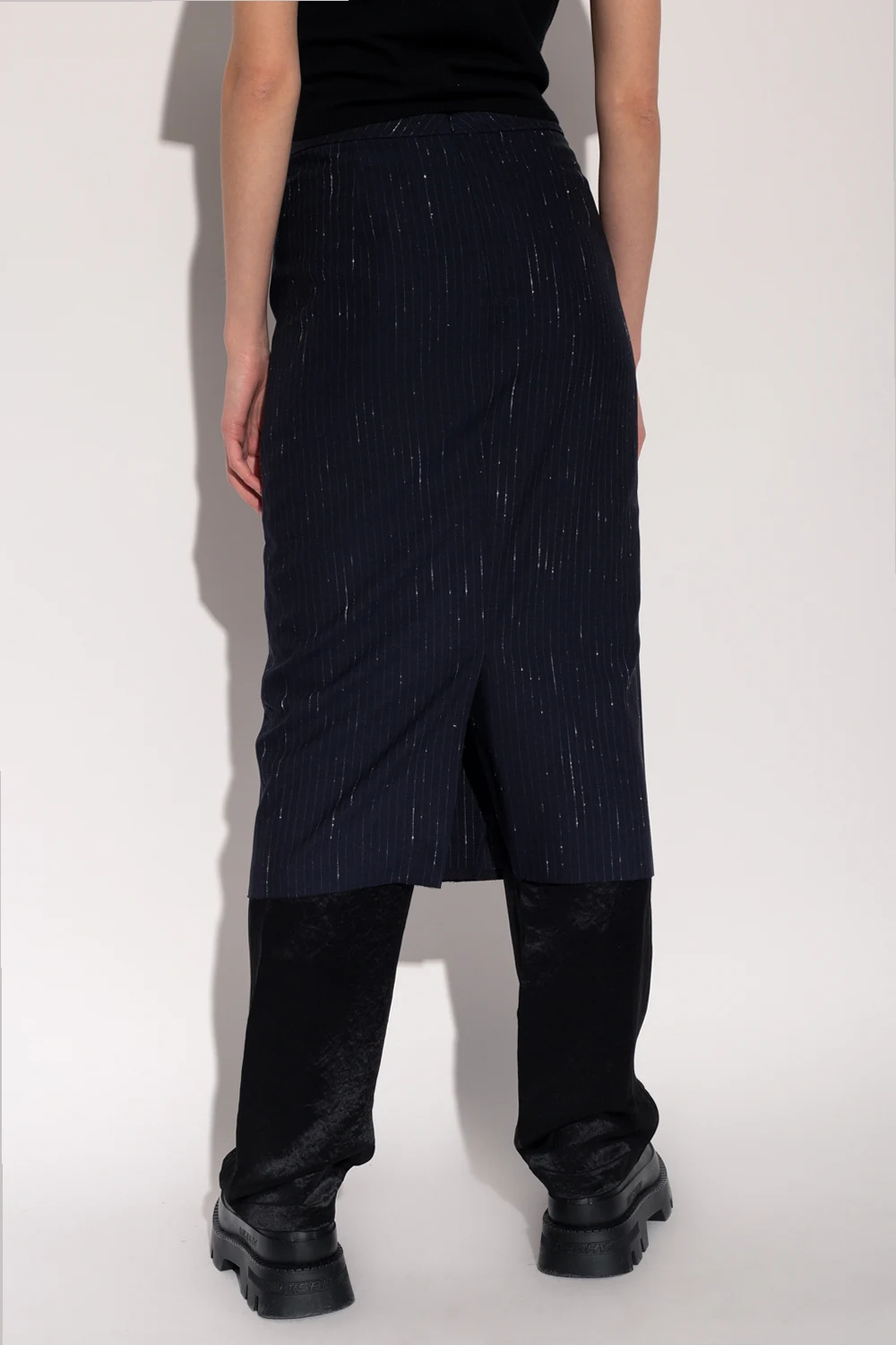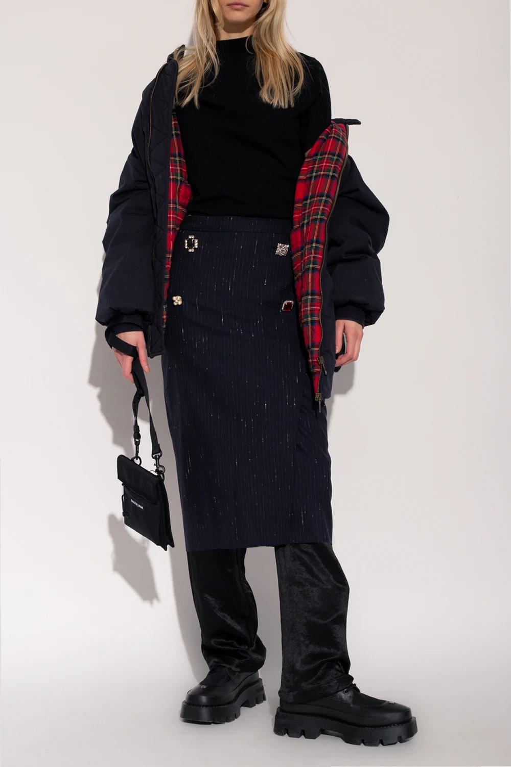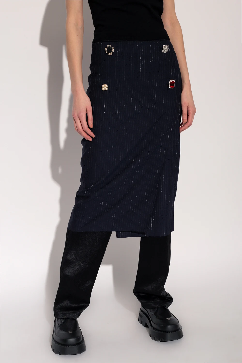 Granatowa spódnica za kolano VETEMENTS. Wykonana z mieszanki wełny o garniturowym splocie. Zapinana z tyłu na kryty zamek oraz haftkę. Ozdobiona wzorem w białe, delikatne prążki z efektem ‘vintage’. Z przodu dekoracyjne guziki wykończone połyskującymi kamieniami oraz sztucznymi perłami. Asymetryczna zakładka oraz rozcięty tył.