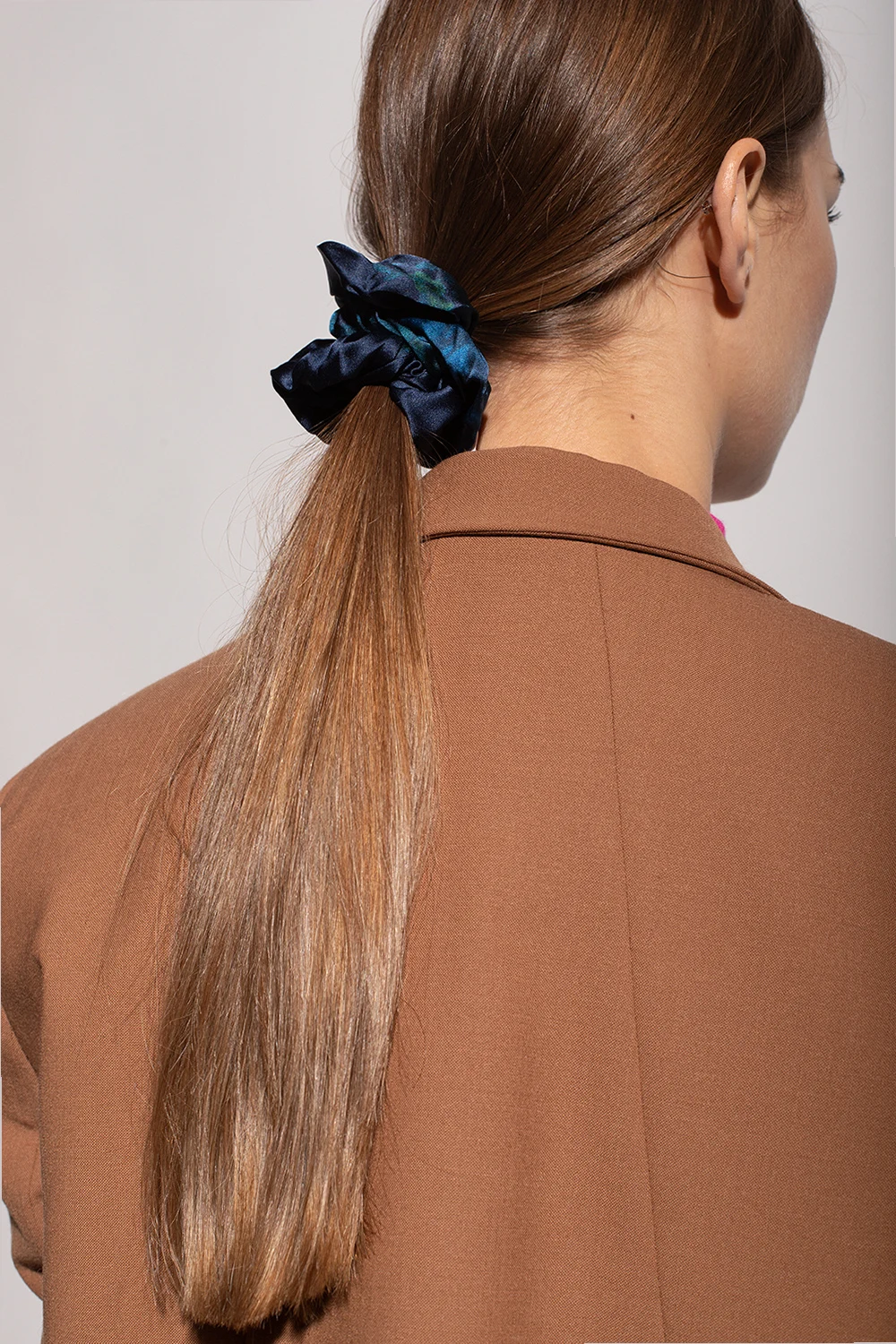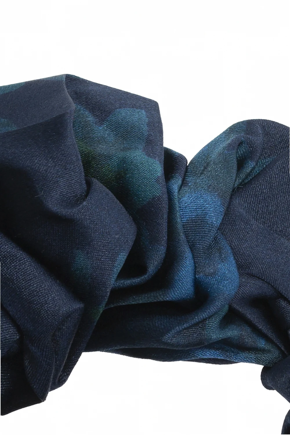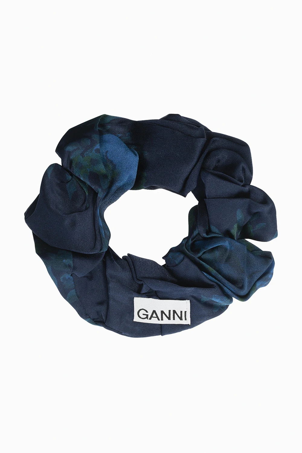 Granatowa, jedwabna gumka do włosów Ganni. Ozdobiona zielono-niebieskim nadrukiem z motywem kwiatowym.