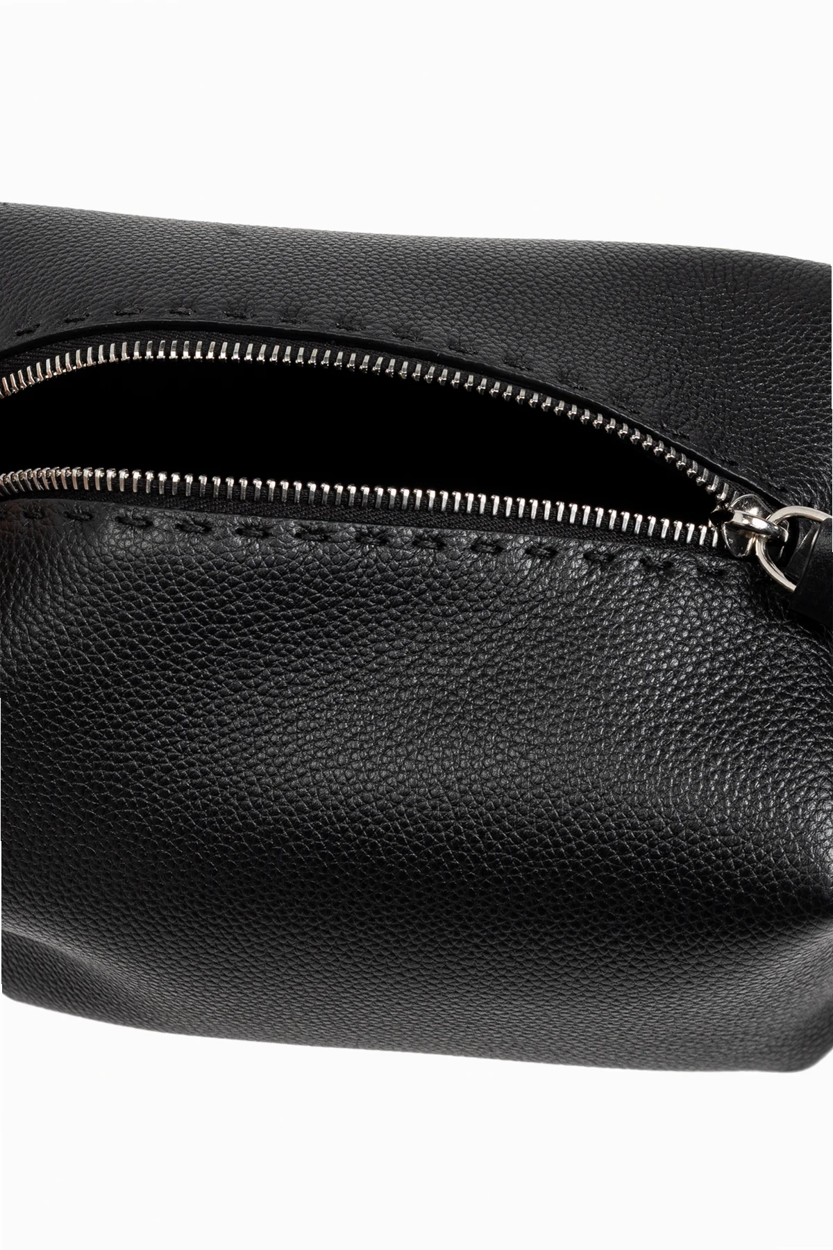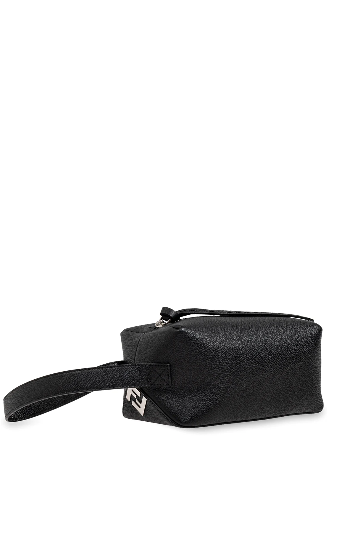Elegancka, czarna skórzana kosmetyczka od renomowanej marki Fendi to wyraz wyrafinowanego stylu i funkcjonalności. Wykonana z najwyższej jakości skóry o gładkiej, ziarnistej teksturze, zachwyca swoją trwałością i solidnym wykonaniem.