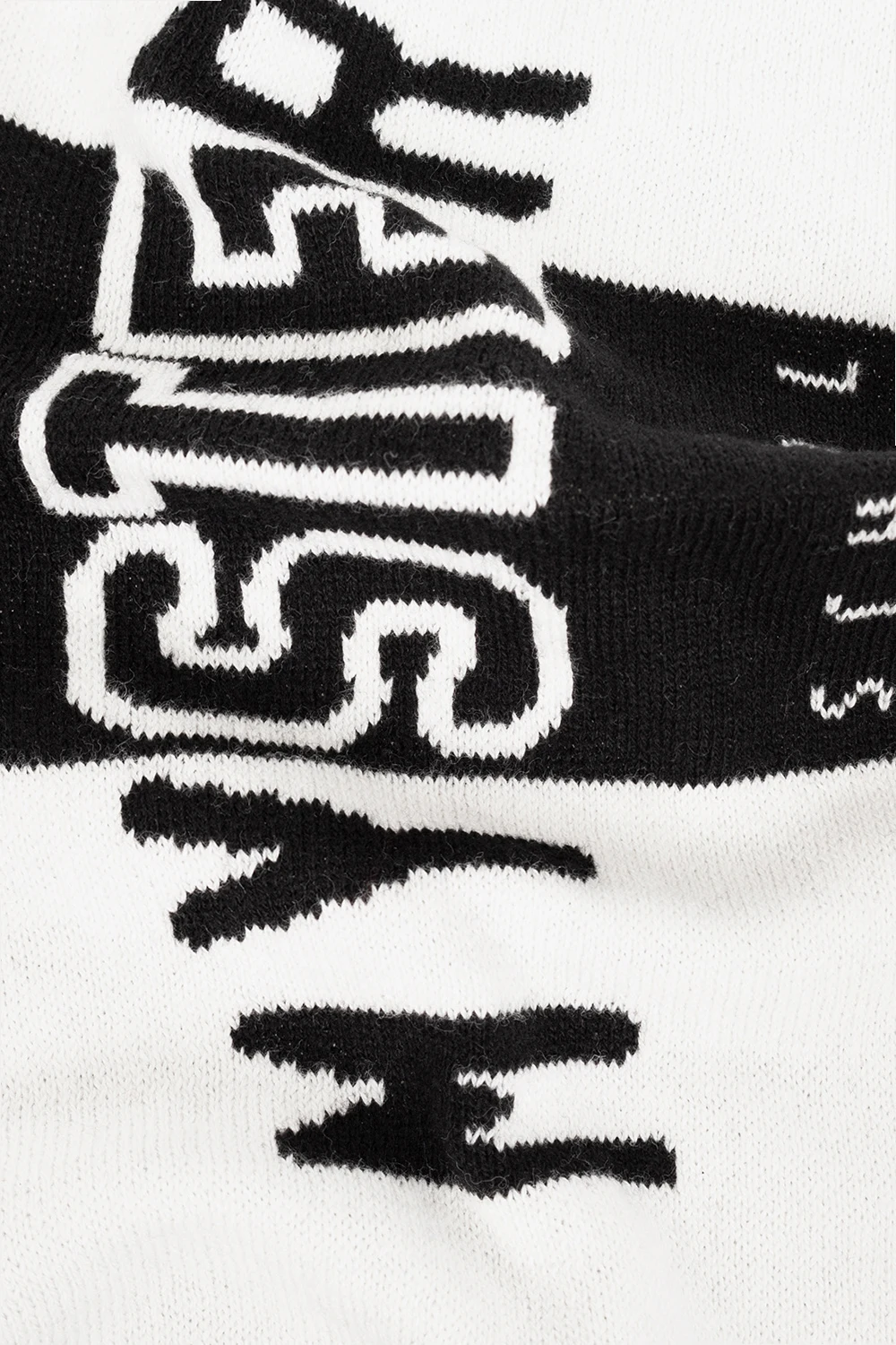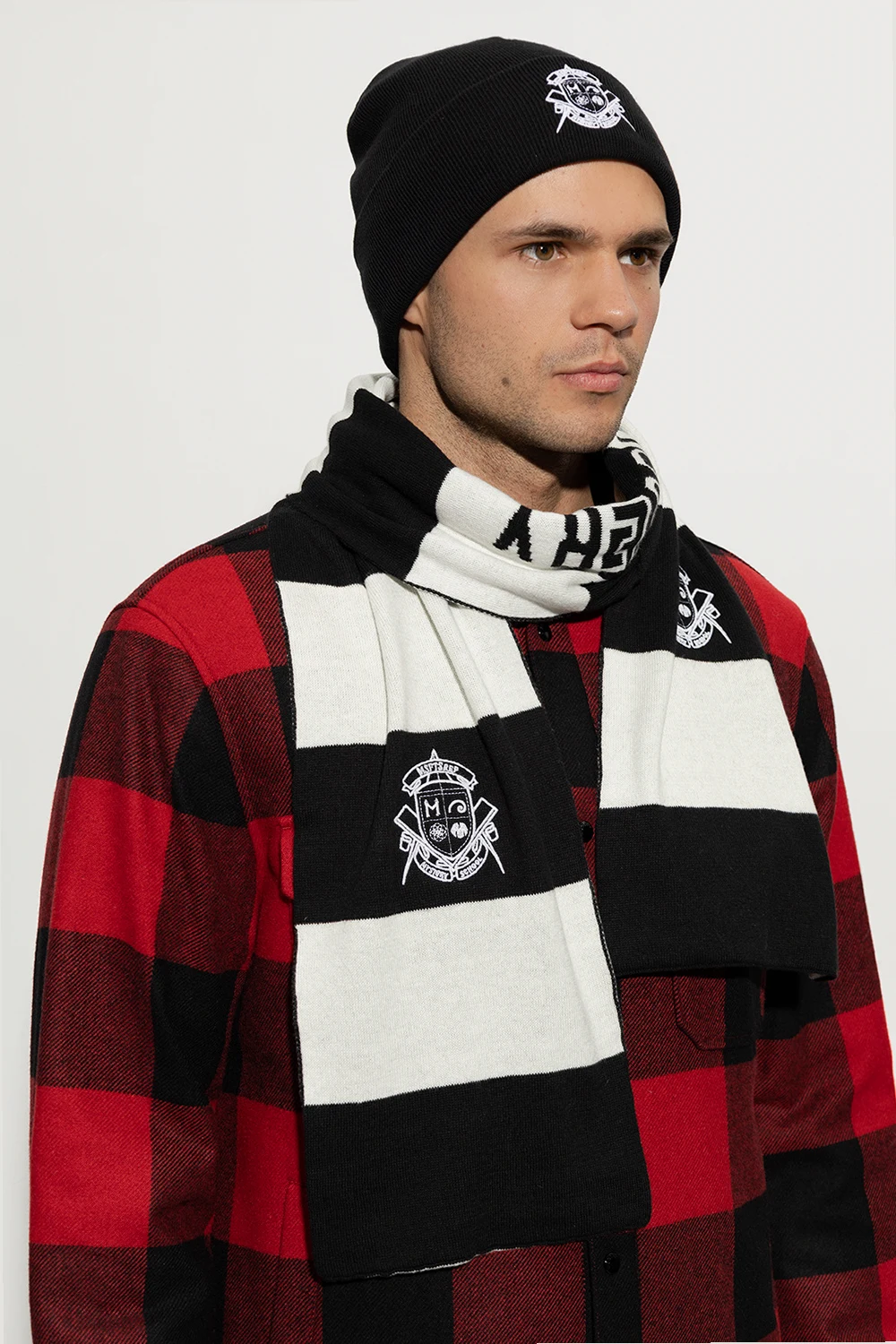 Czarno-biały szal MSFTSrep. Wykonany z mieszanki bawełny organicznej i wełny z merynosów. Ozdobiony wzorem w pasy oraz napisem ‘Mystery School’. Na brzegach wyszyty białą nicią wzór z motywem herbu.