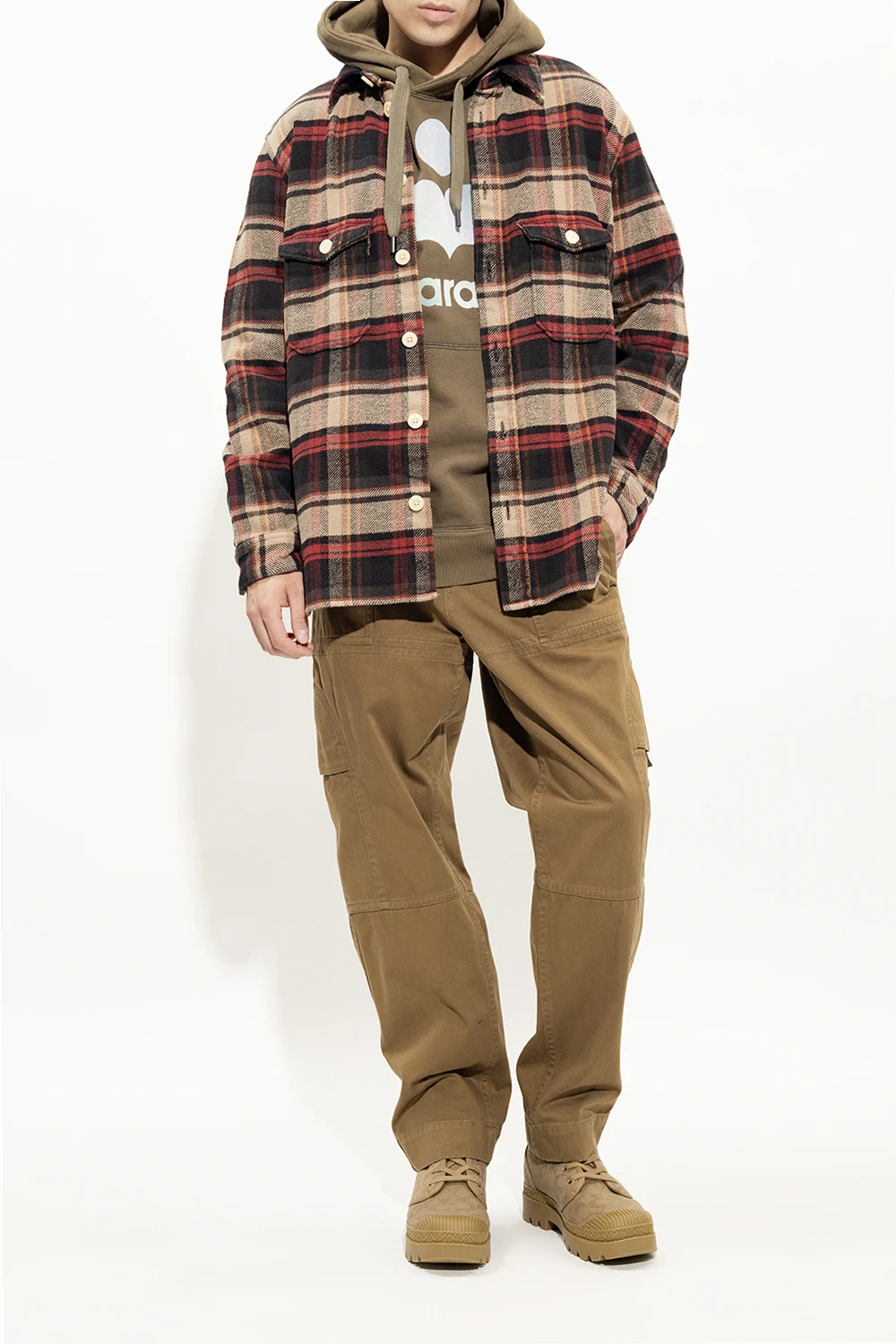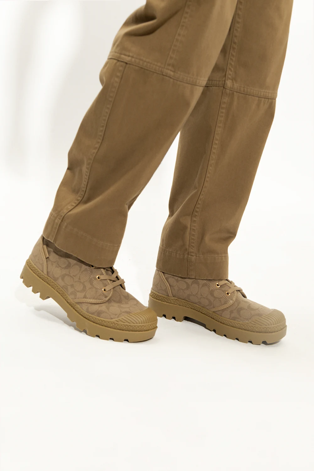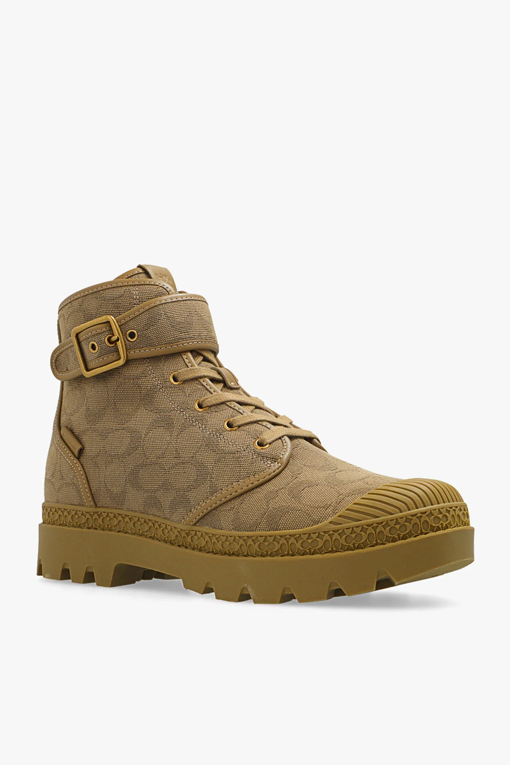 Brązowe, sznurowane buty za kostkę Coach. Wykonane z materiału i skóry. Pas z klamrą w kolorze postarzanego złota. Ozdobione wzorem z monogramem. Brązowa, gumowa podeszwa.
