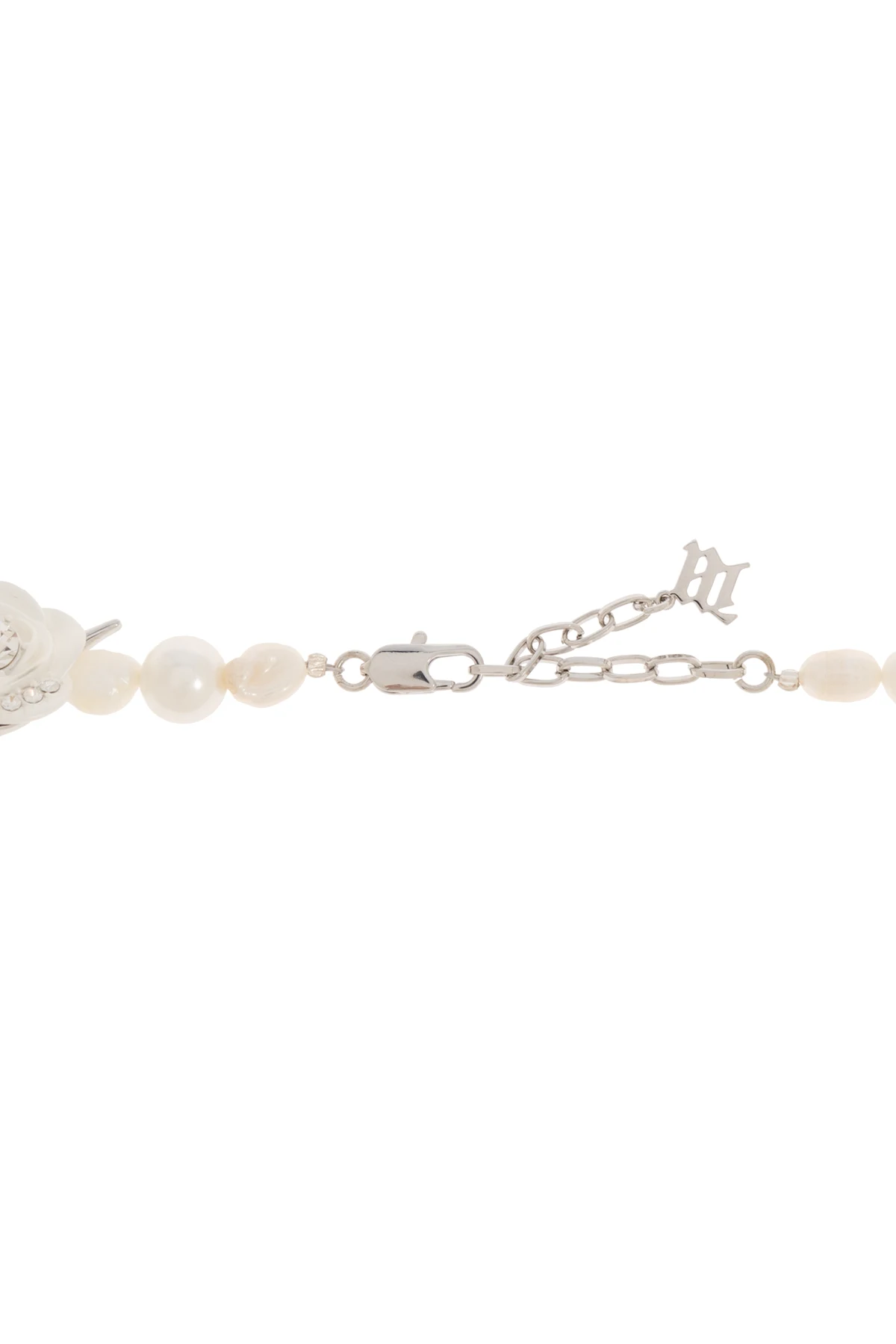 Naszyjnik wyróżnia się niepowtarzalnym designem, składającym się z białych pereł o różnych kształtach i rozmiarach, subtelnie połączonych w jedną całość. Dominującym motywem są delikatne, białe kwiaty zdobione kryształkami, które nadają całości niezwykłego blasku. Całość uzupełnia charakterystyczny monogram projektanta , misternie wpleciony w strukturę naszyjnika.