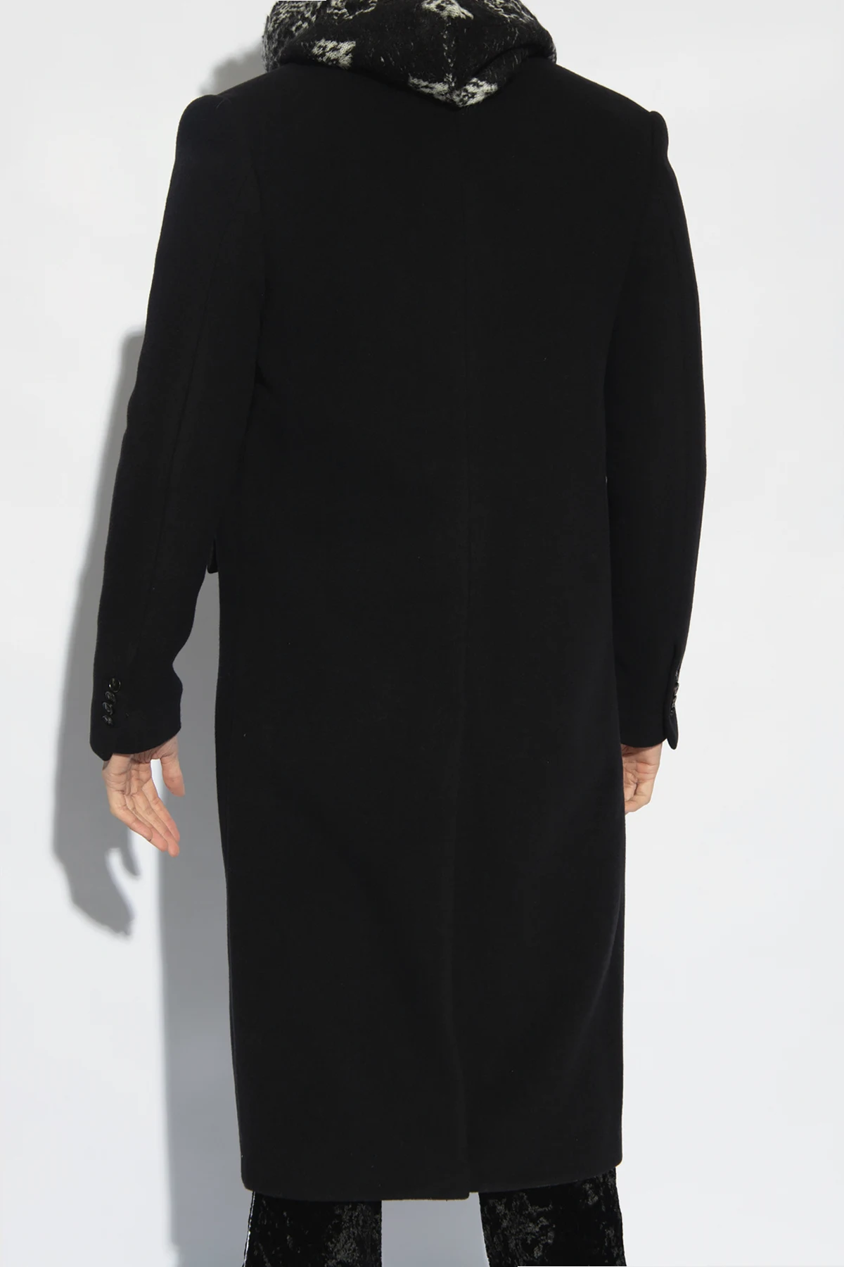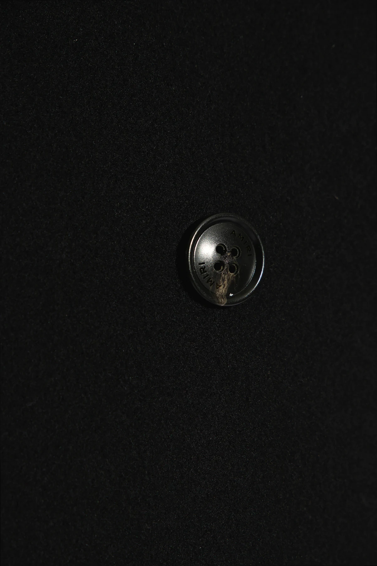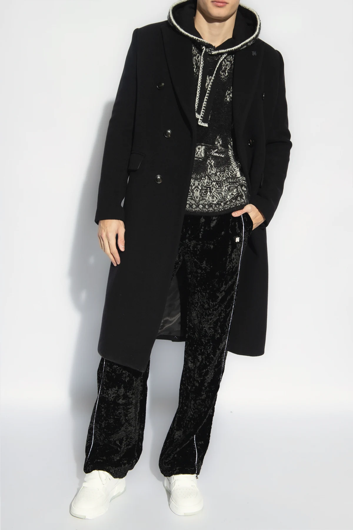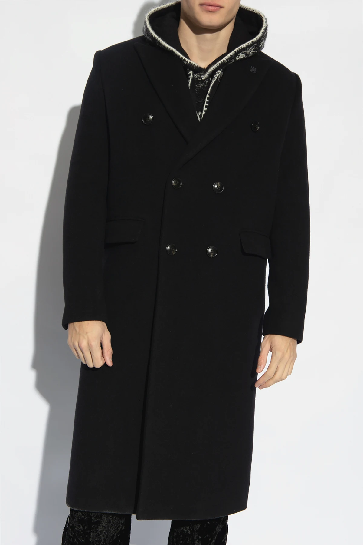 Czarny, dwurzędowy płaszcz Amiri. Zapinana na guziki. Z przodu przypinka w kształcie logo. Dwie kieszenie z patką. Z tyłu pojedyncze rozcięcie. Zamknięte klapy. Długie rękawy zakończone zapięciem na guziki.