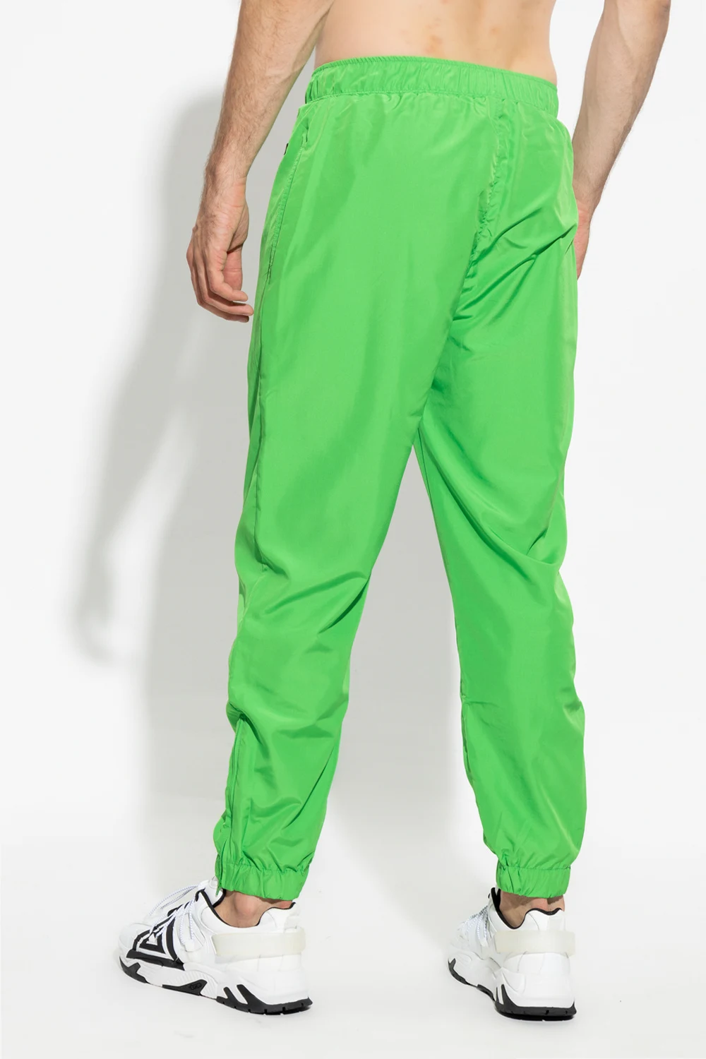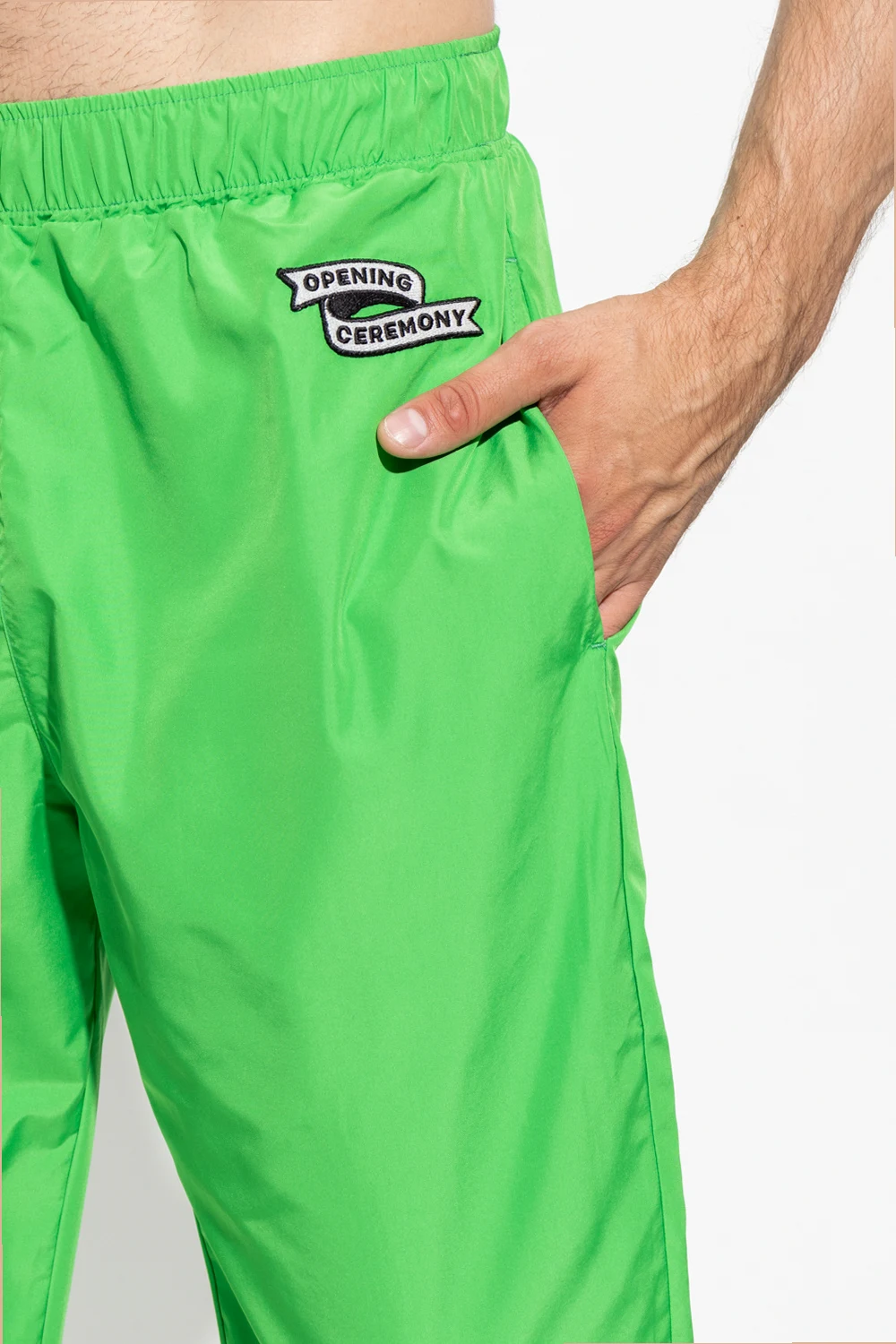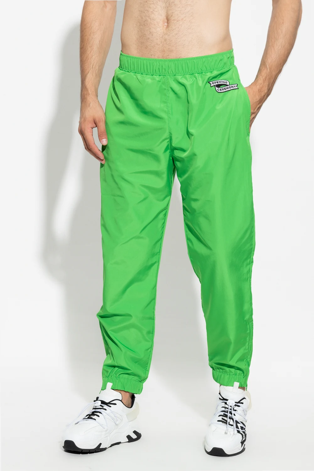Zielone, ortalionowe spodnie Opening Ceremony. W pasie ściągane trokami. Z przodu dwie kieszenie i naszywka z logo. Nogawki zakończone wszytą gumą i zamkiem. Warstwa wewnętrzna wykończona czarną siatką.