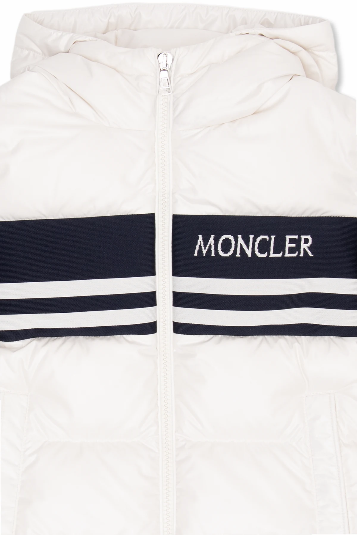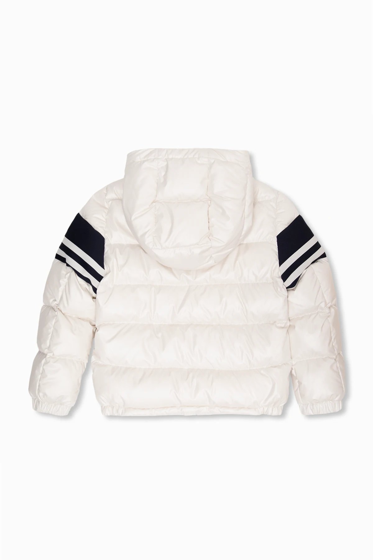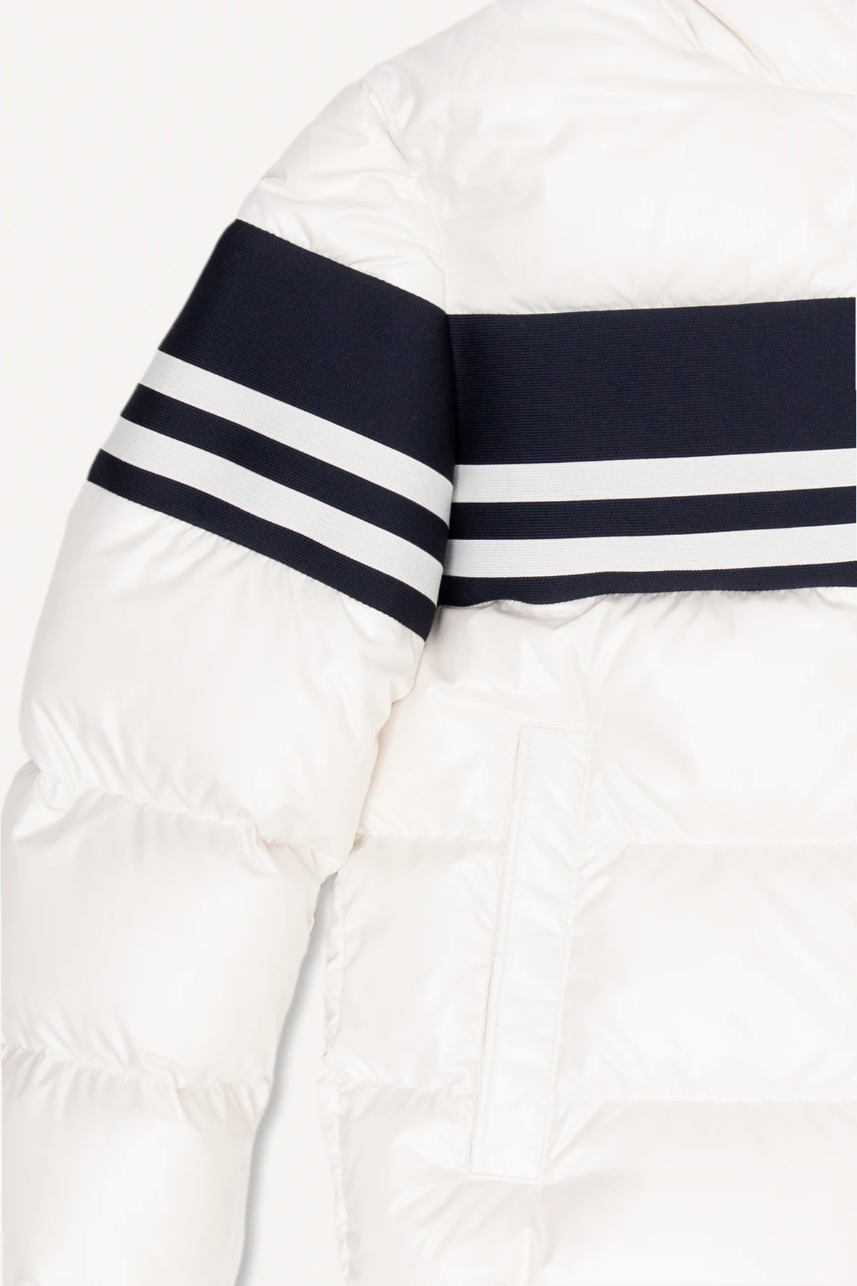 Kremowo-granatowa, puchowa kurtka, model ‘Mangal’ Moncler Enfant. Zapinana na zamek. Ozdobiona wyszytym logo oraz wzorem w pasy. Dwie kieszenie z zapięciem na zatrzask. Długie rękawy i dół wykończone ściągaczem.