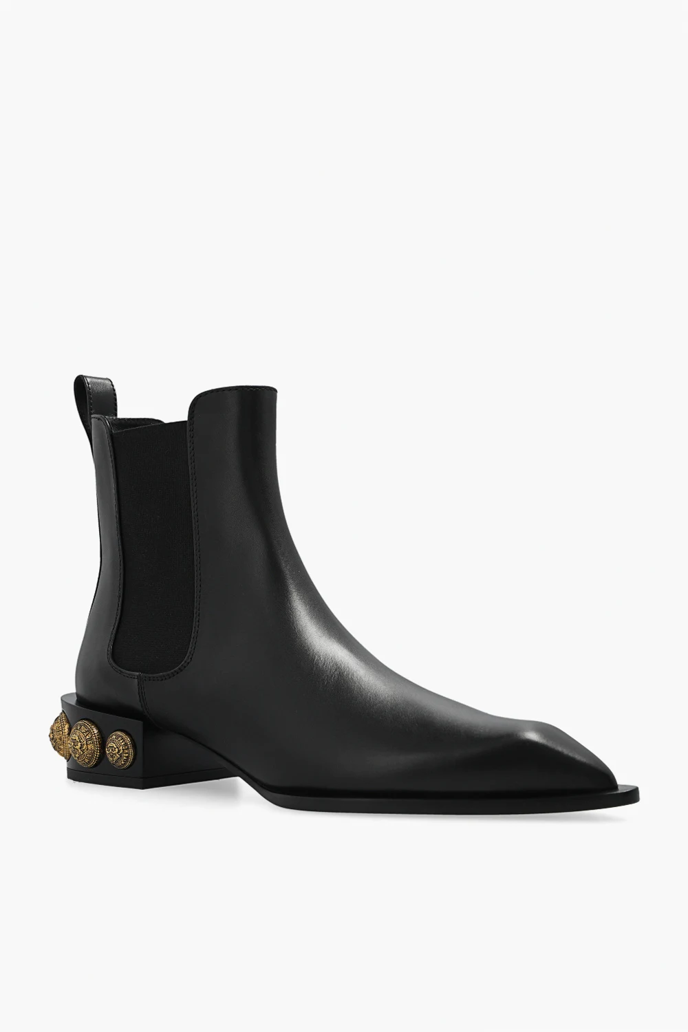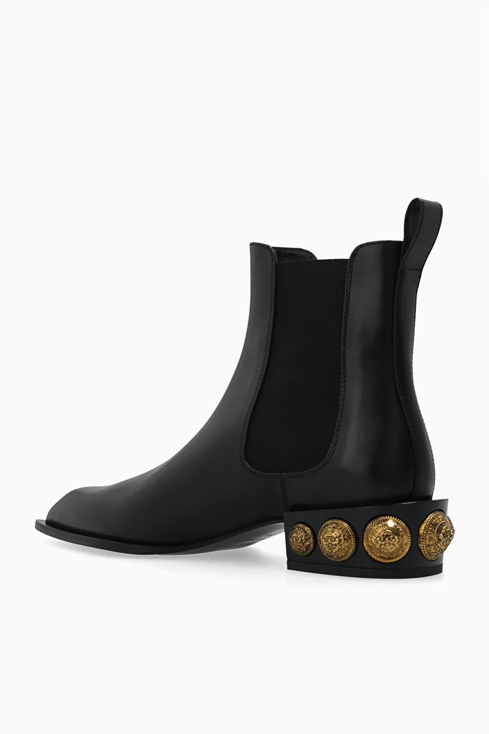Czarne sztyblety Balmain. Wykonane z cielęcej skóry. Po bokach wszyta taśma elastyczna. Nosek w szpic. Obcas ozdobiony aplikacjami w kolorze złotym z wytłoczonym wzorem z logo. Czarna, skórzana podeszwa.
