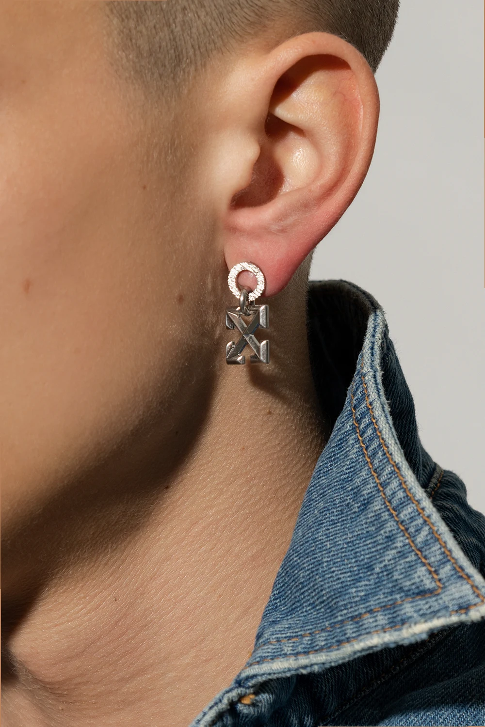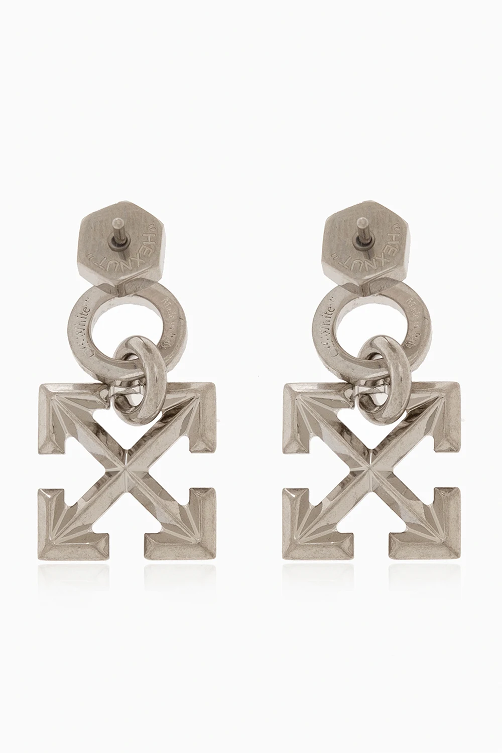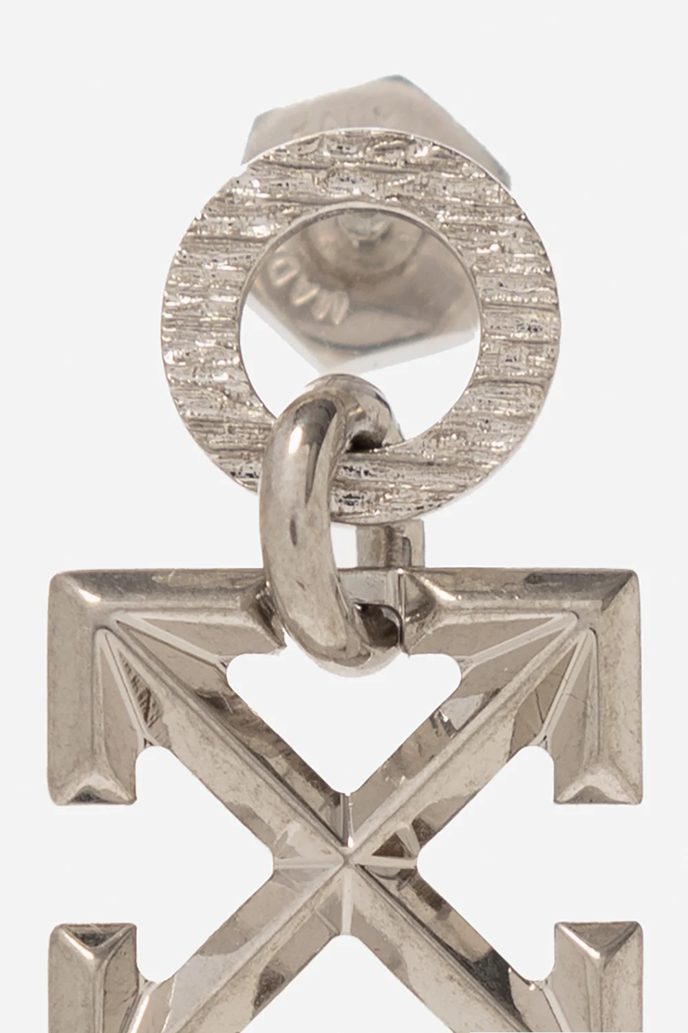 Okrągły kolczyk w kolorze srebrnym Off-White. Wykonany z mosiądzu. Ozdobiony zawieszką w kształcie charakterystycznych strzałek. Zapinany na sztyft.